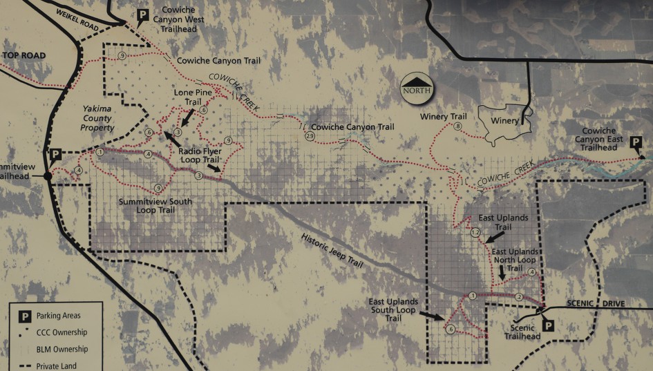 지도의 왼쪽 (West, Weikel Rd Trailhead)에서 출발하여 Cowiche 계곡을 따라가다가 East Uplands를 올랐습니다.