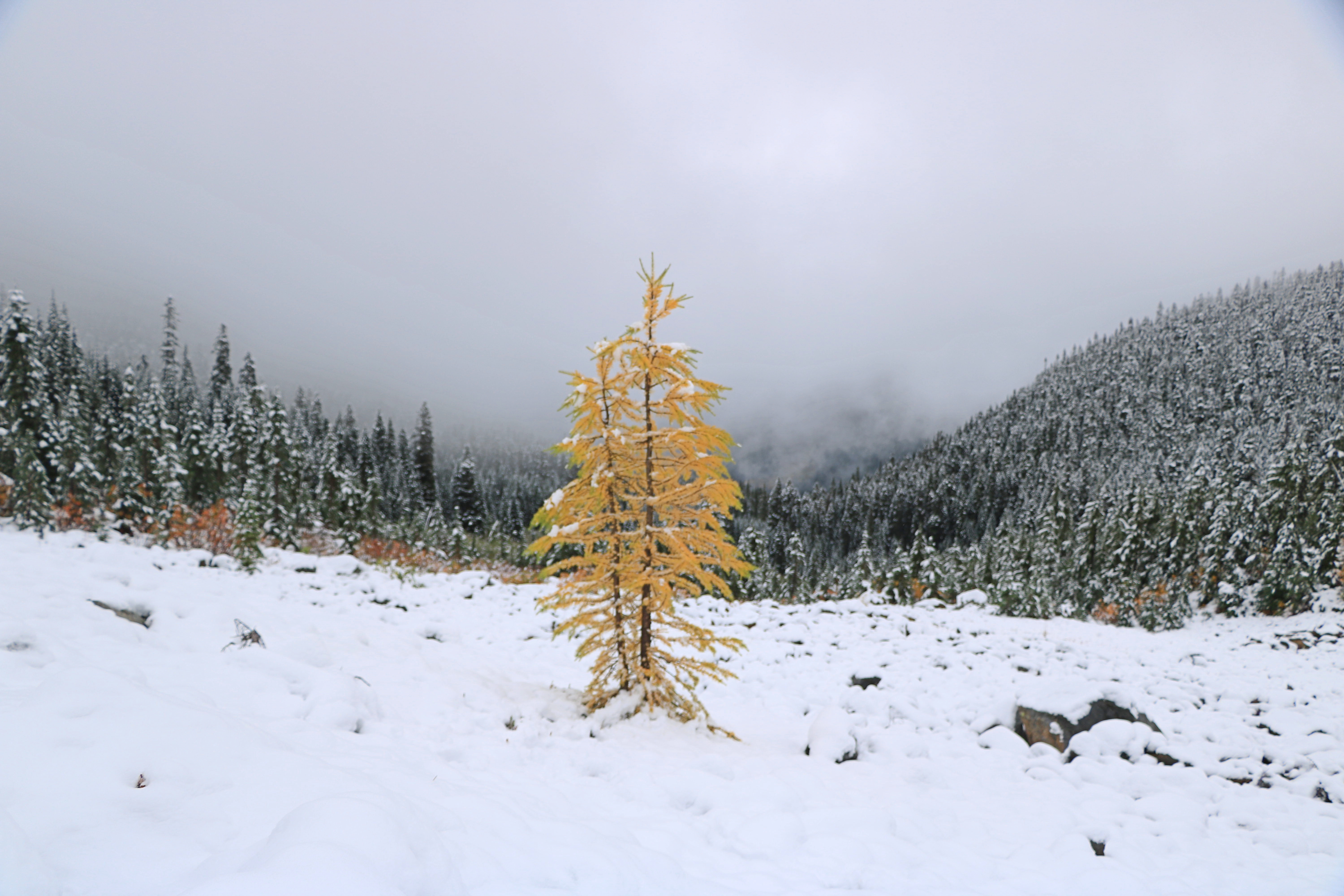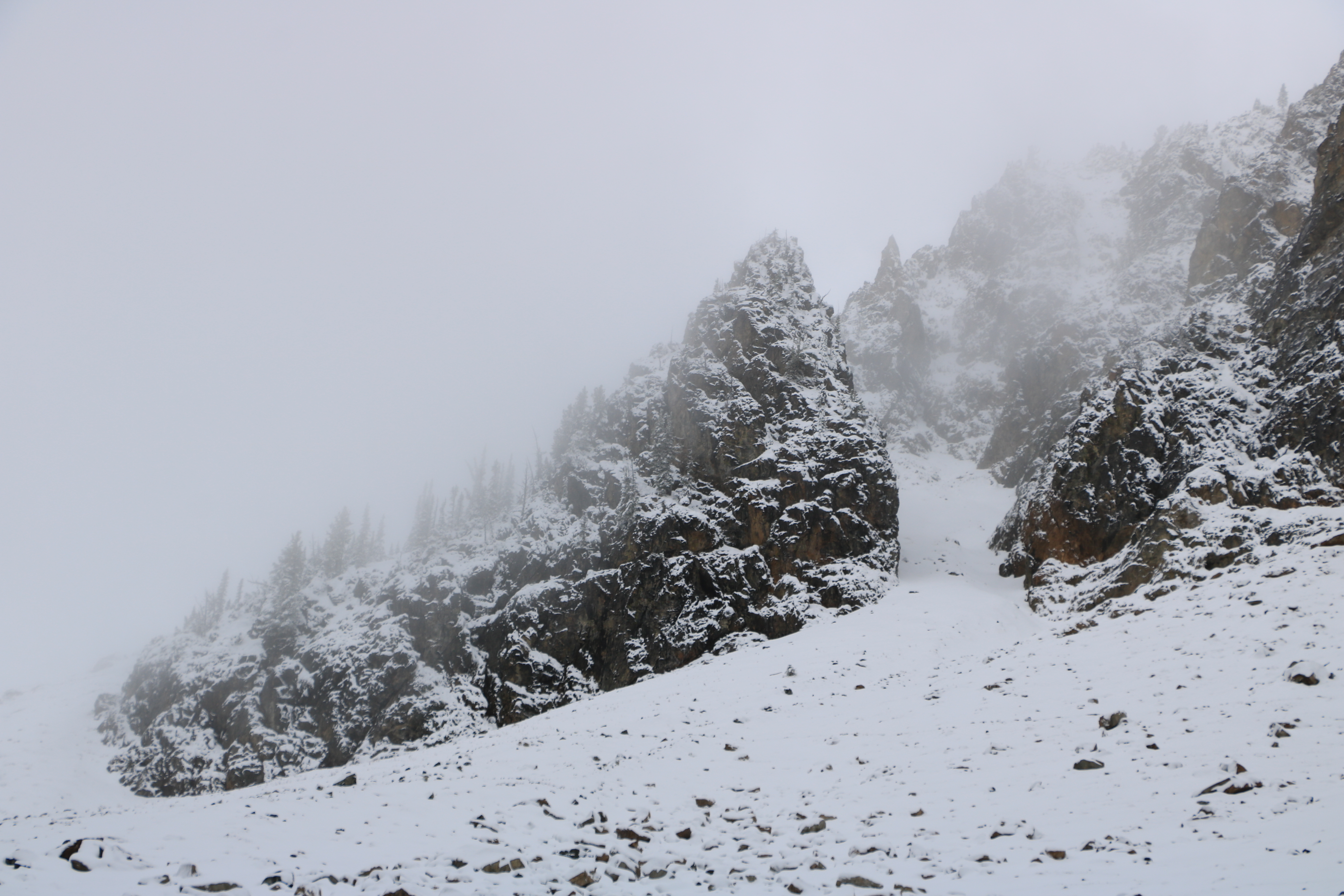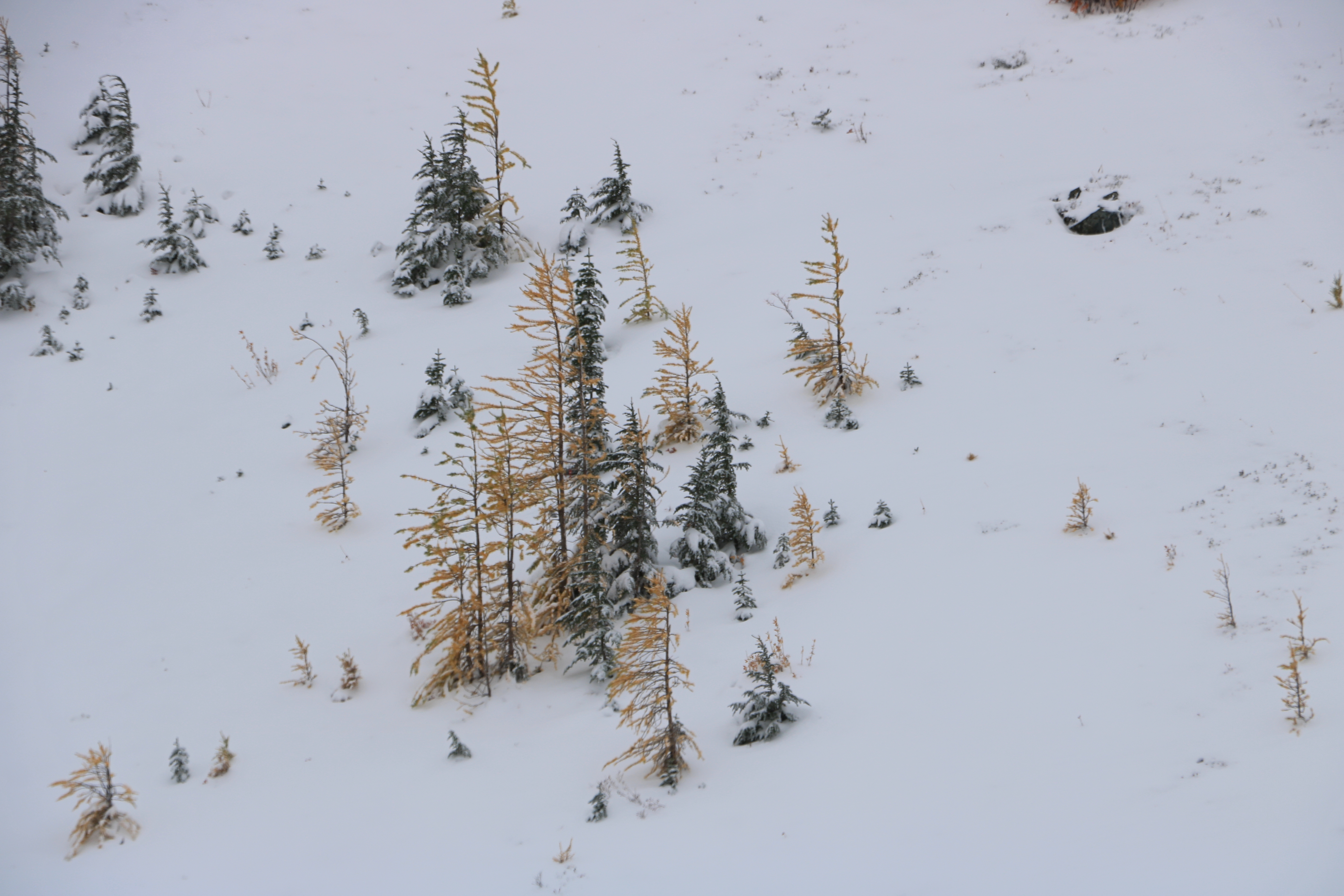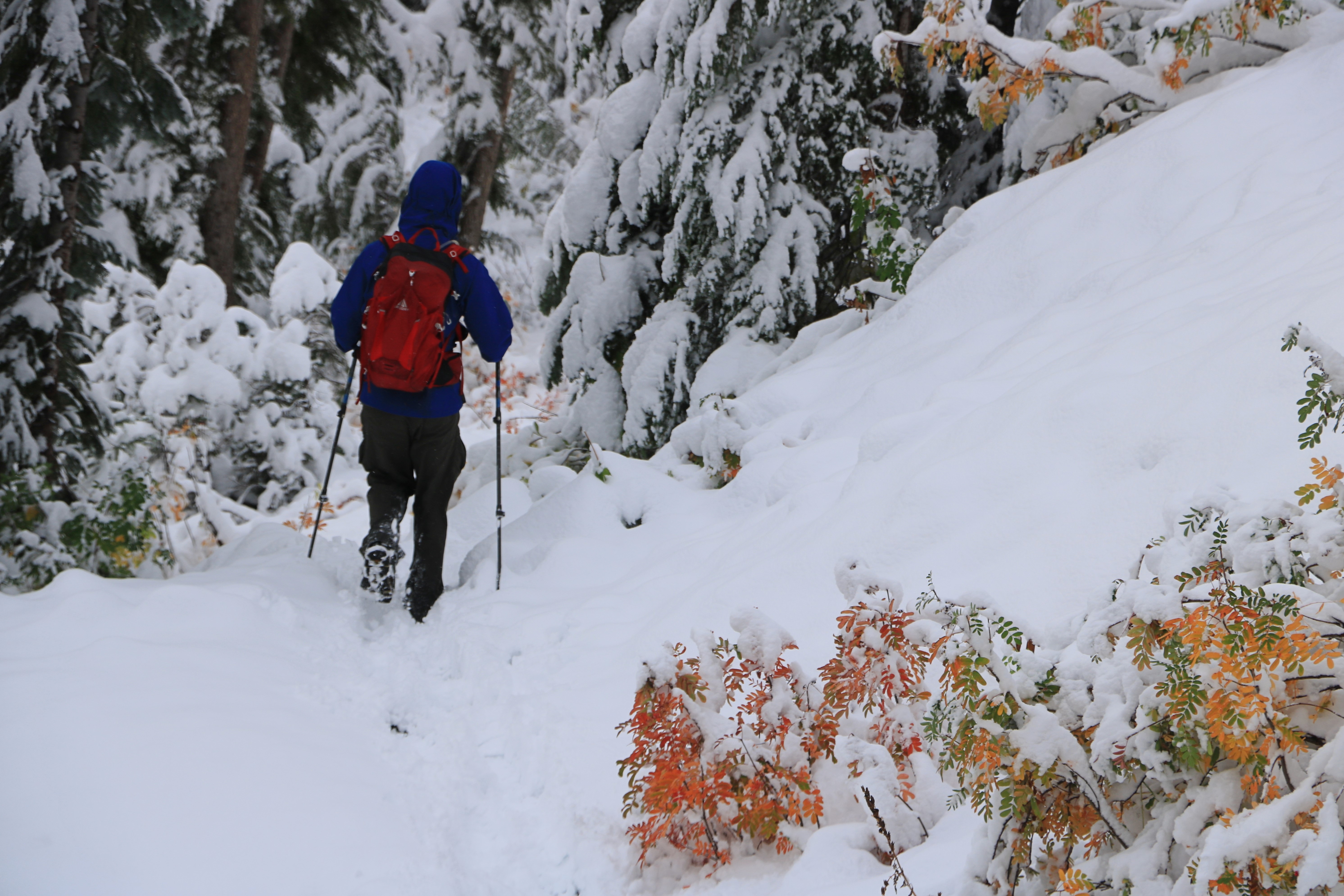 폭설이 단풍을 따라잡았습니다. 산 봉우리에 소나무 단풍 몇 그루가 보이지만, 산 위 (6,000 피트, 1, 800 미터 지역)에는 눈이 12 인치 (30 cm) 정도 쌓여있어 겨울산행 장비가 필요합니다.