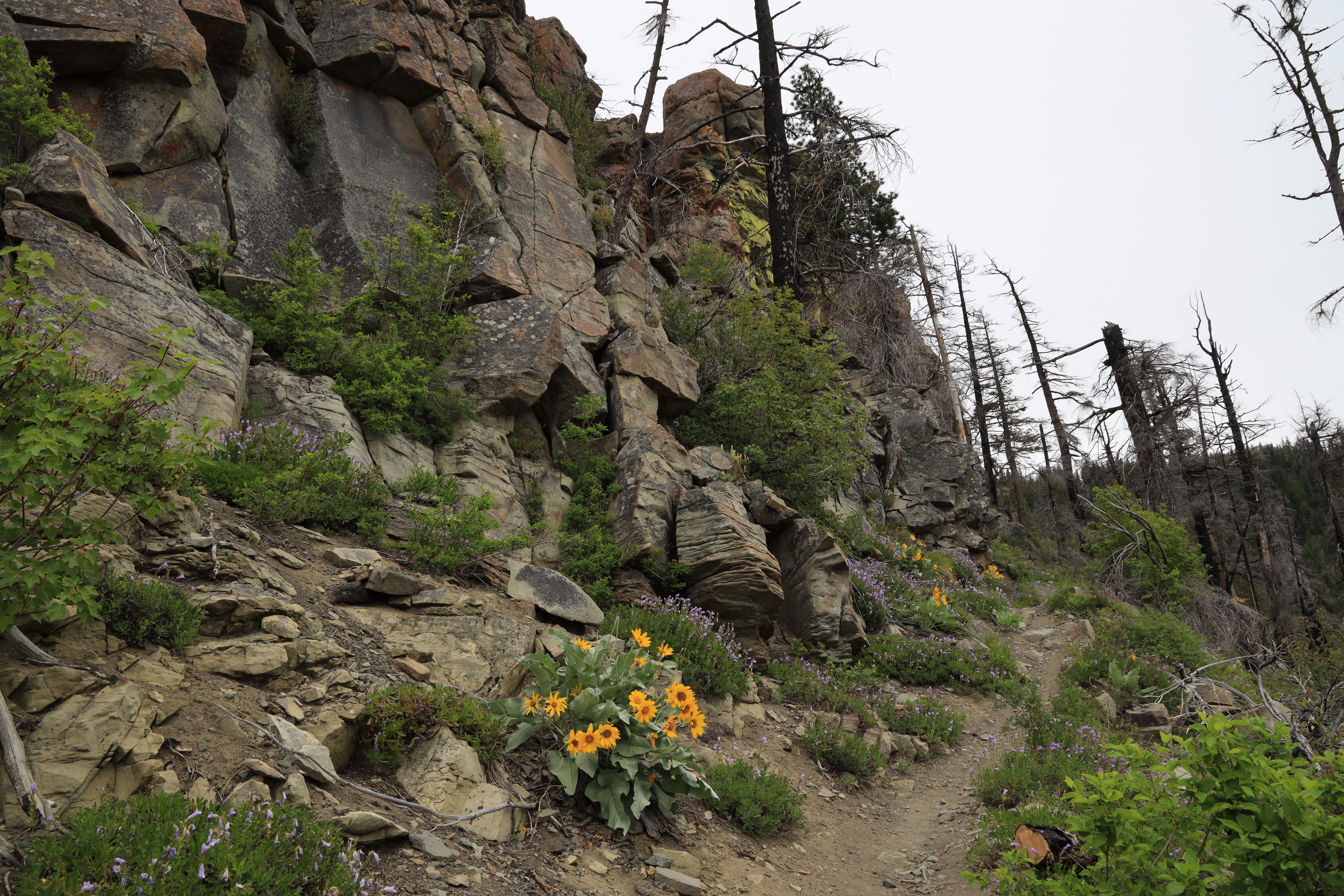 하산길에 눈이 오다, 비가 오다 하네요. 이 근처는 유월초에도 눈 오는 것이 흔한 일입니다. 아침에 등산로 입구에서도 쌀쌀해서 (37'F, 3'C) 재킷부터 꺼내 입었습니다. 그나저나 잃어버린 물병을 어쩐다.
