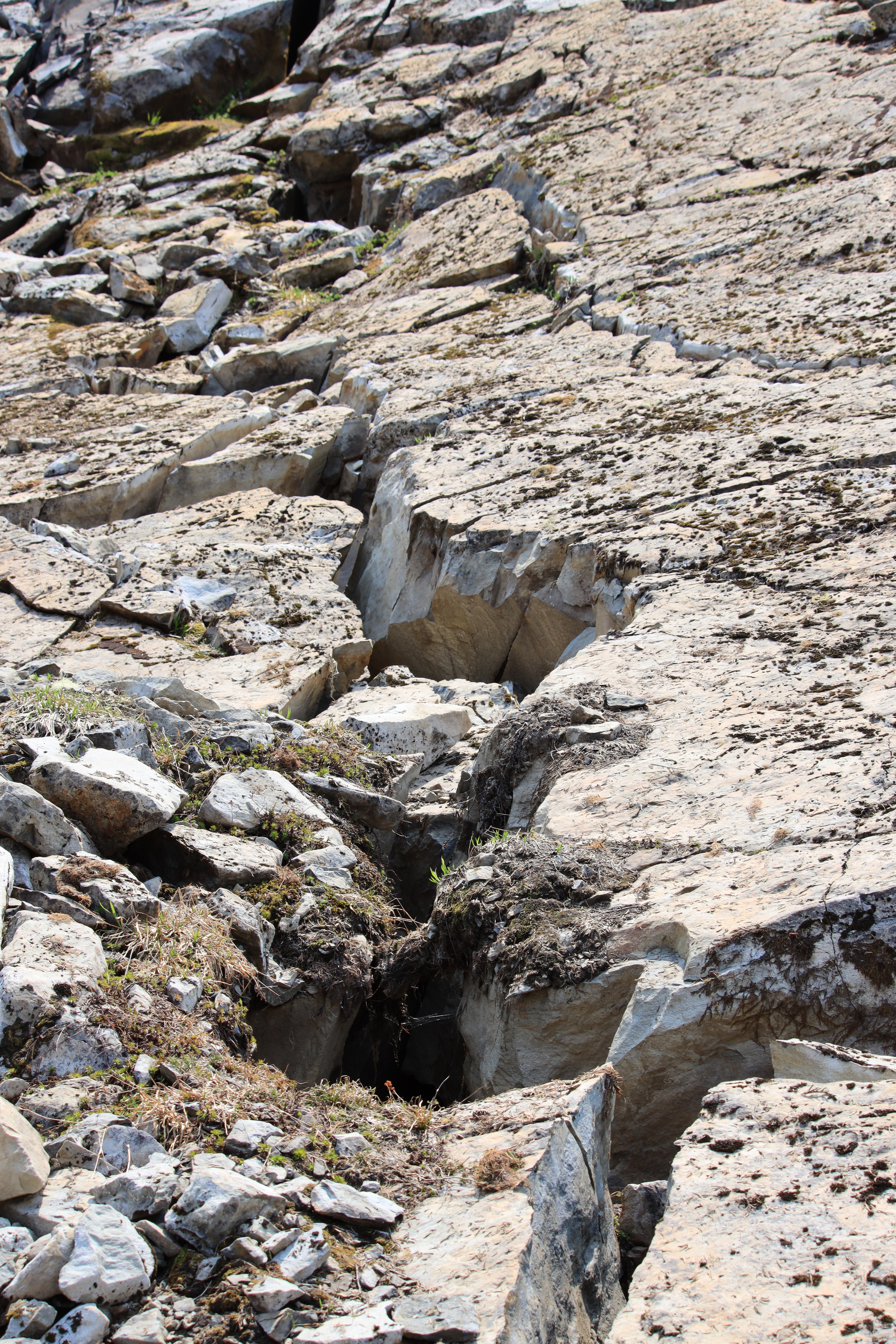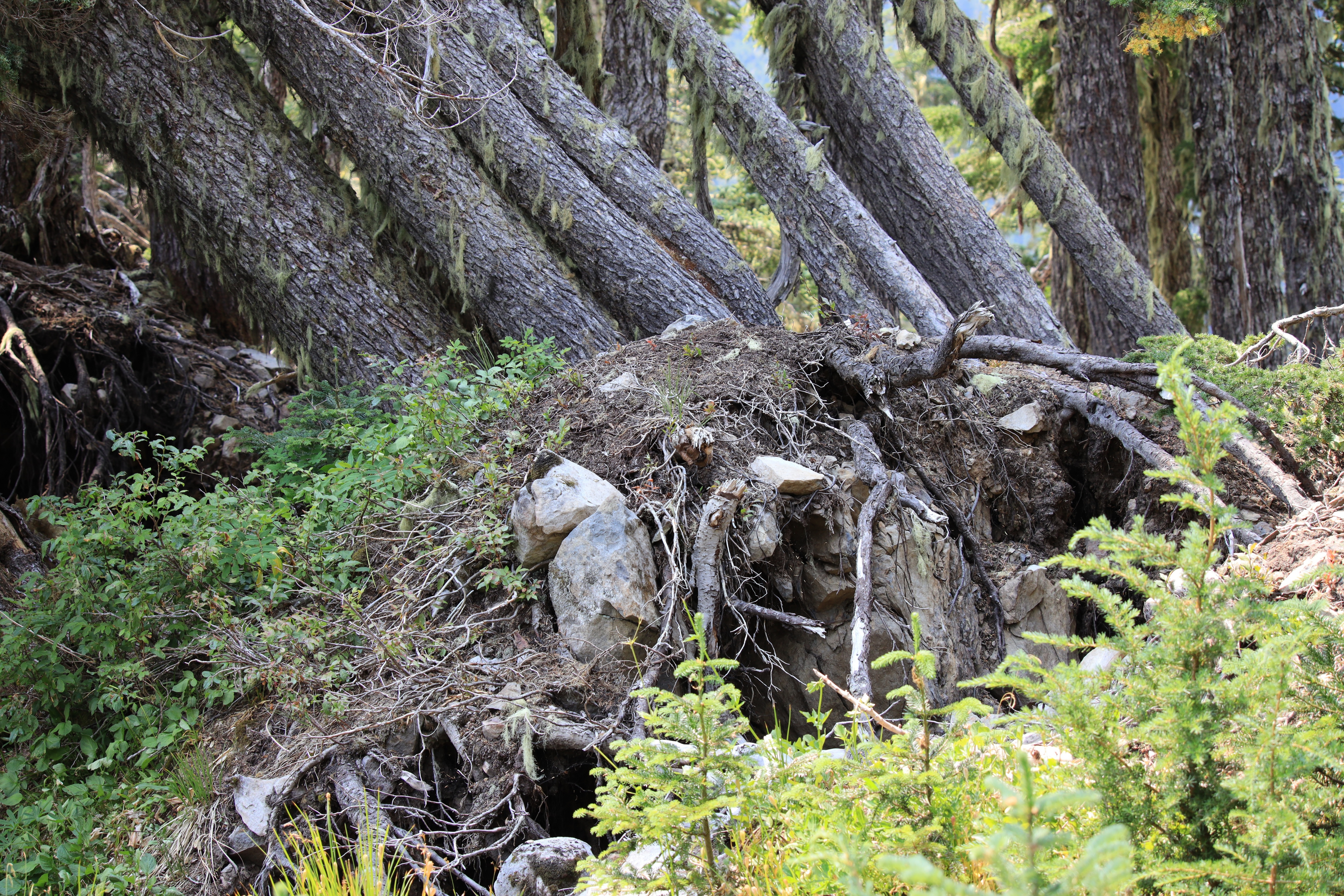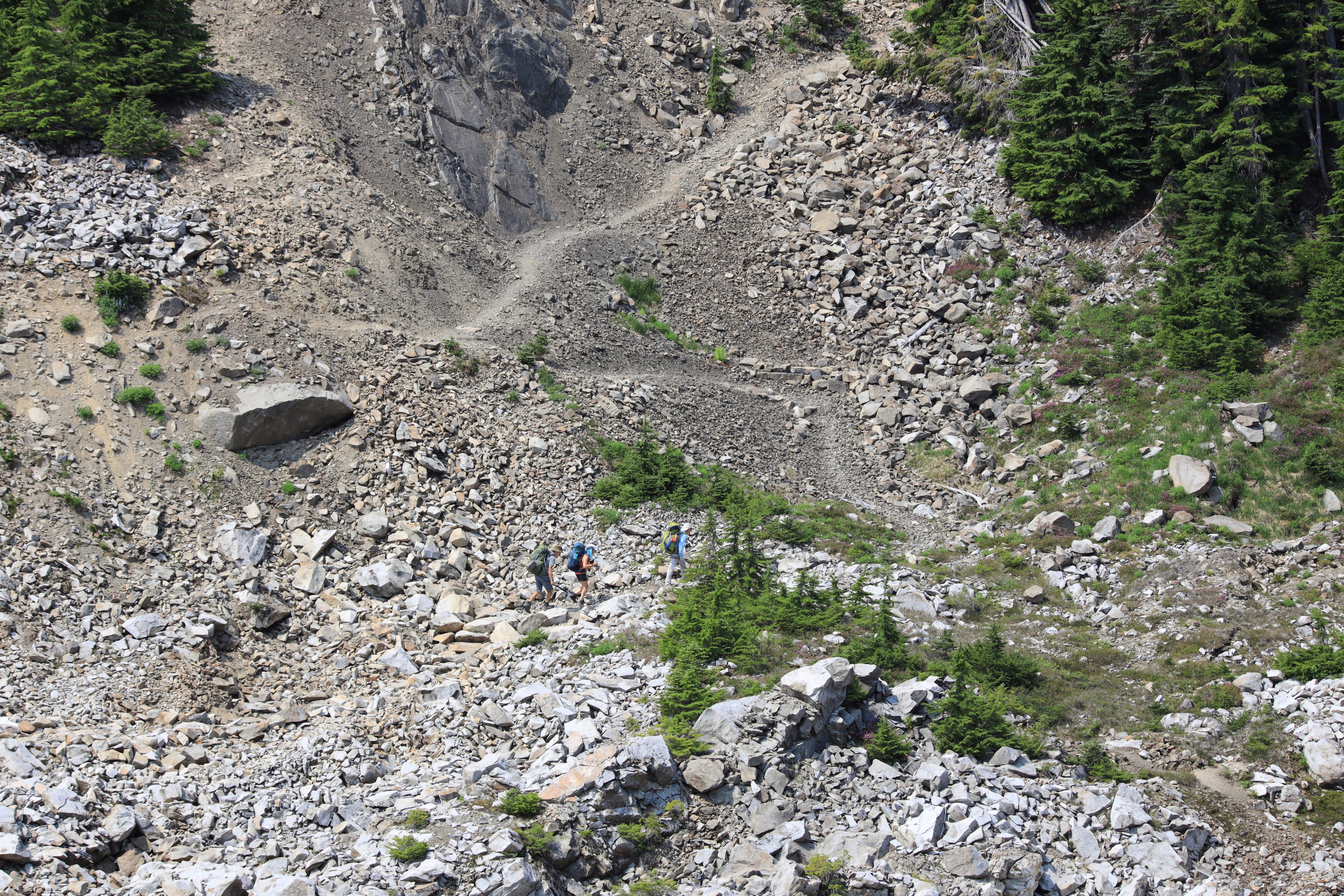 Seven Lakes Basin과 High Divide 갈림길 근처인데 머지않아 산사태가 날 것 같습니다. 땅과 바위들이 갈라져 있고 몇몇 나무는 쓰러지려 합니다. 전에도 이 근처에서 작은 산사태가 있었던 것 같습니다.