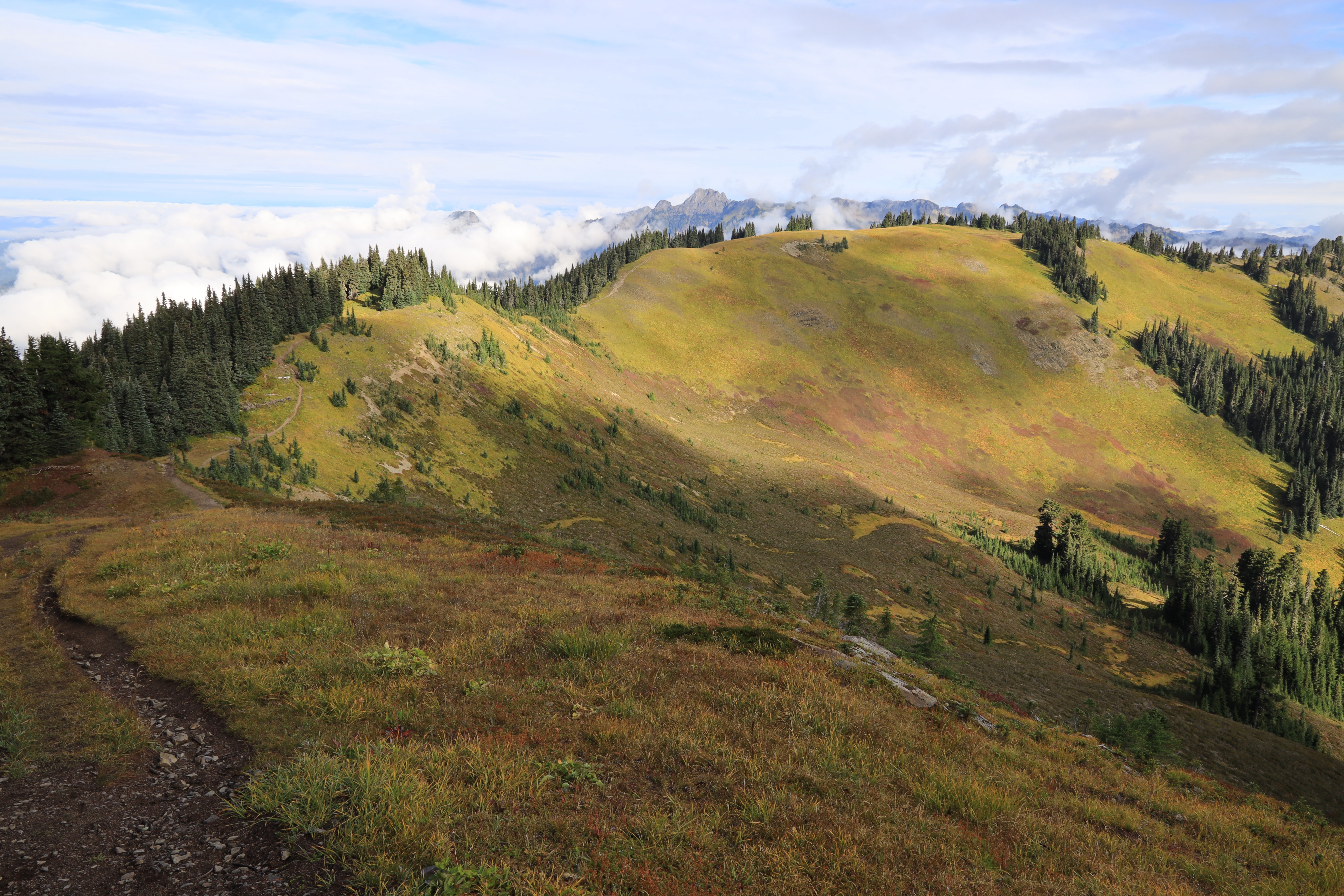 하산길에 보니 구름이 능선을 넘지 못하고 있습니다. '하늘을 가르는 능선길 (Skyline Divide Trail)'이라는 이름이 괜히 붙은 게 아니네요. 능선이 정확하게 하늘을 갈랐습니다.