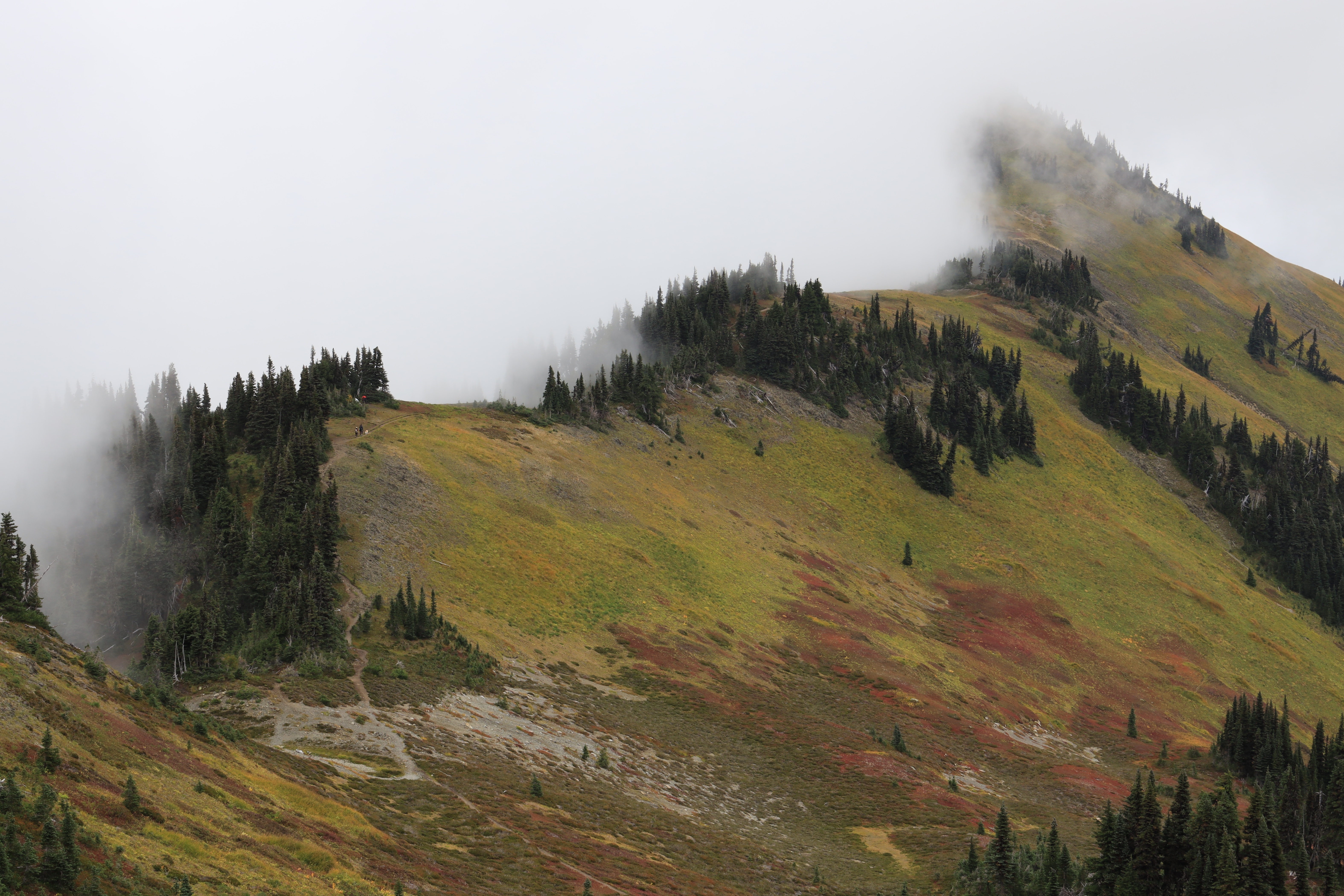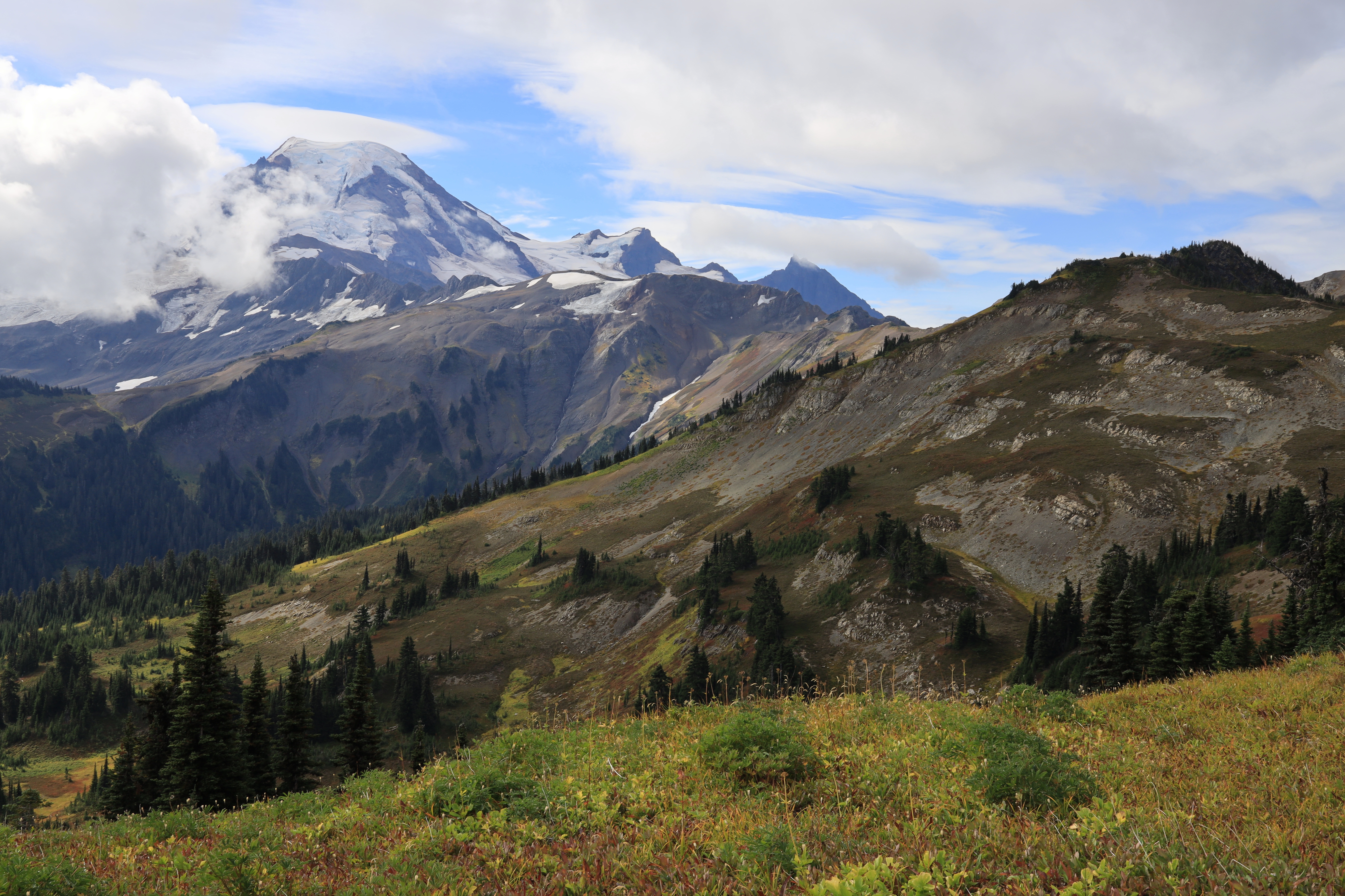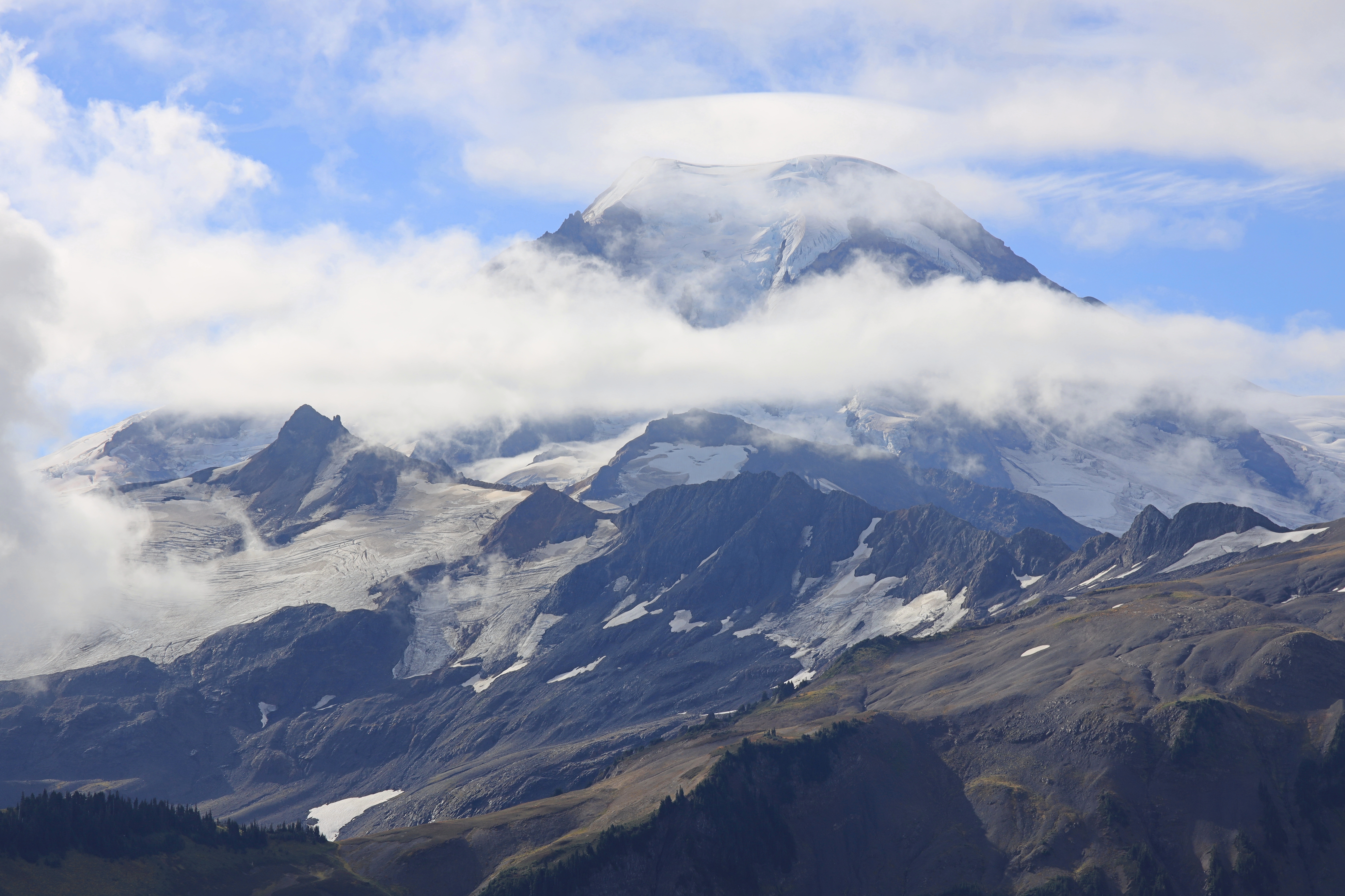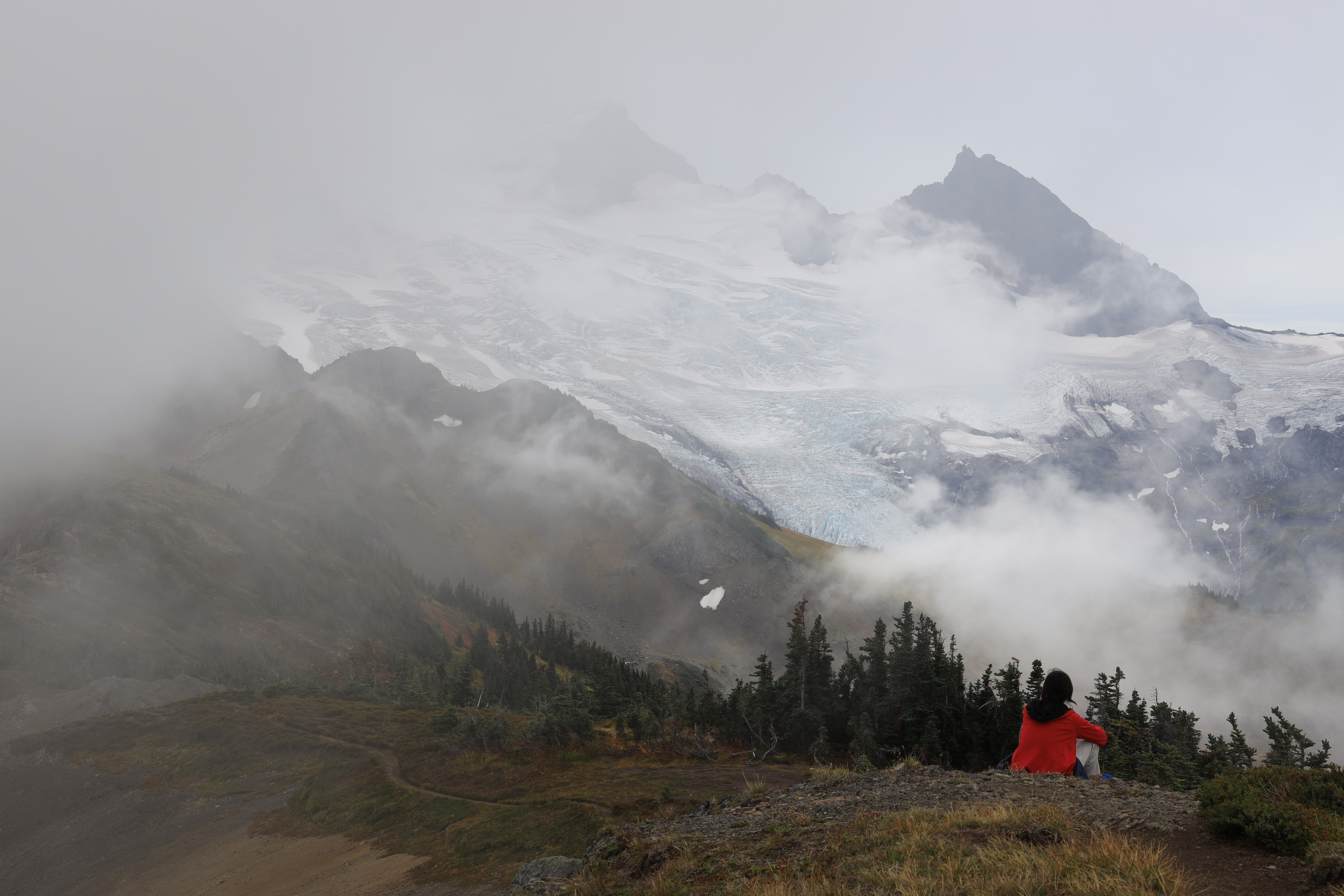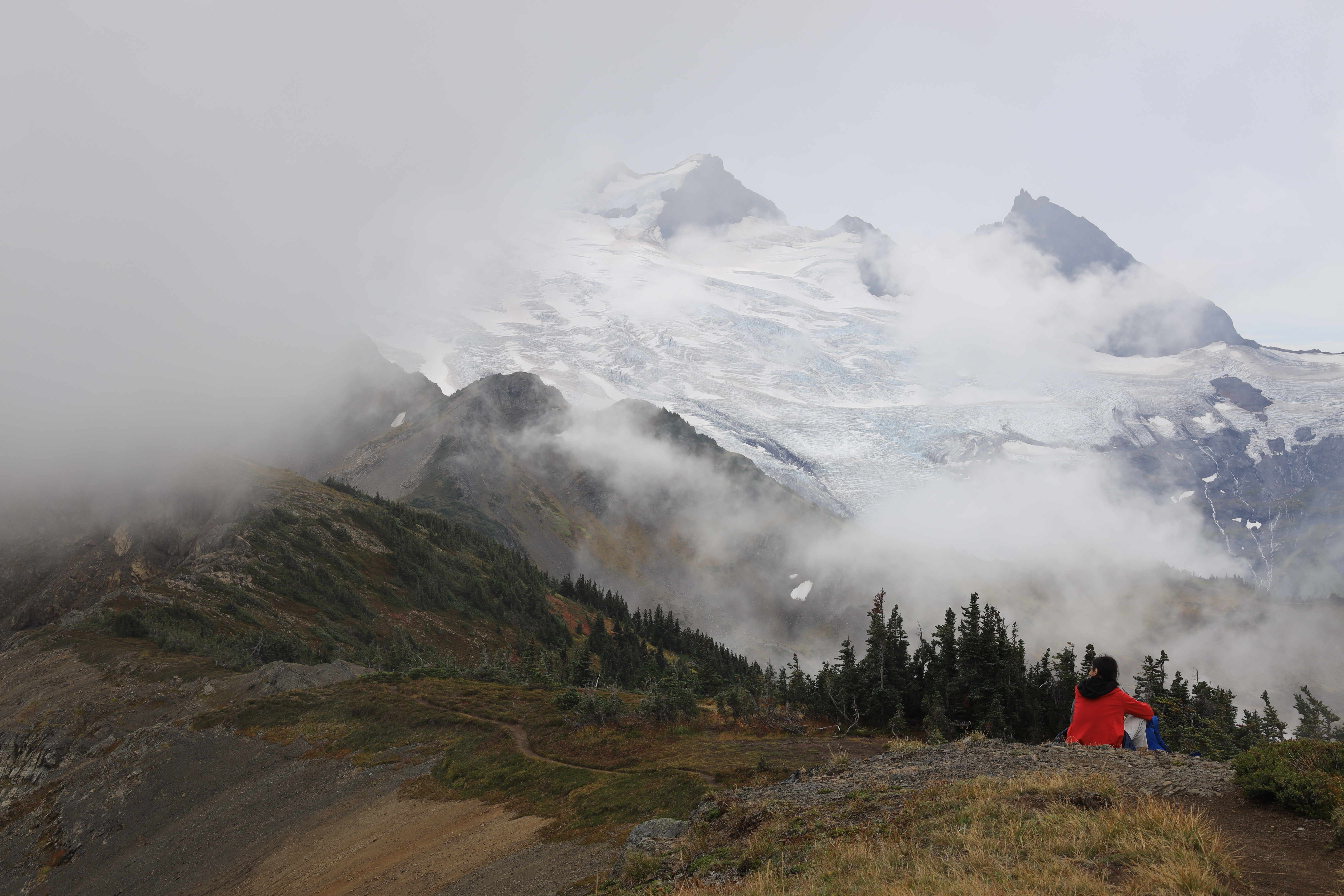 일기예보에 오전은 비올 가능성 5 퍼센트에 부분 흐림, 오후에는 흐리고 비올 가능성 17 퍼센트라서 새벽에 서둘러 산행을 시작했습니다. (경험상 산 위에서는 이 정도면 구름 때문에 오후에 비나 눈이 옵니다.) 정상에서 전망이 열리기를 기다리는데 빗방울이 떨어지기 시작합니다. 다행히 지금까지 구름이 꾹 참고 산 아래서 기다려 주었습니다. 6,563 봉에서 Mount Baker를 코 앞에서 볼 수 있지만 하산을 시작합니다.