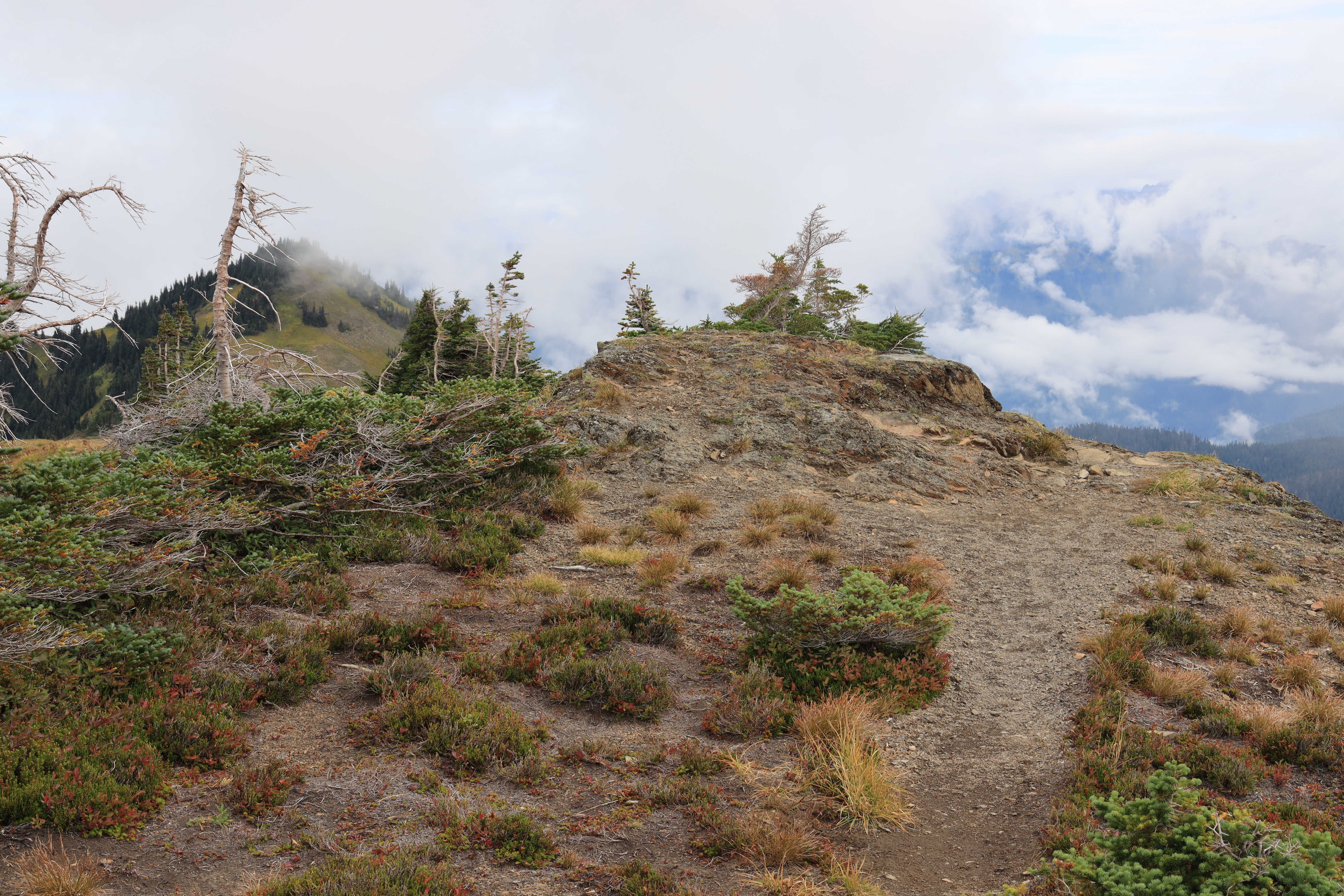 6,215 피트 봉우리를 넘는데 갑자기 날씨가 변하네요. 산 아래 얌전히 있던 구름이 산을 타고 넘기 시작했습니다. 전망은 없어지고 쌀쌀한 기운이 감돕니다.