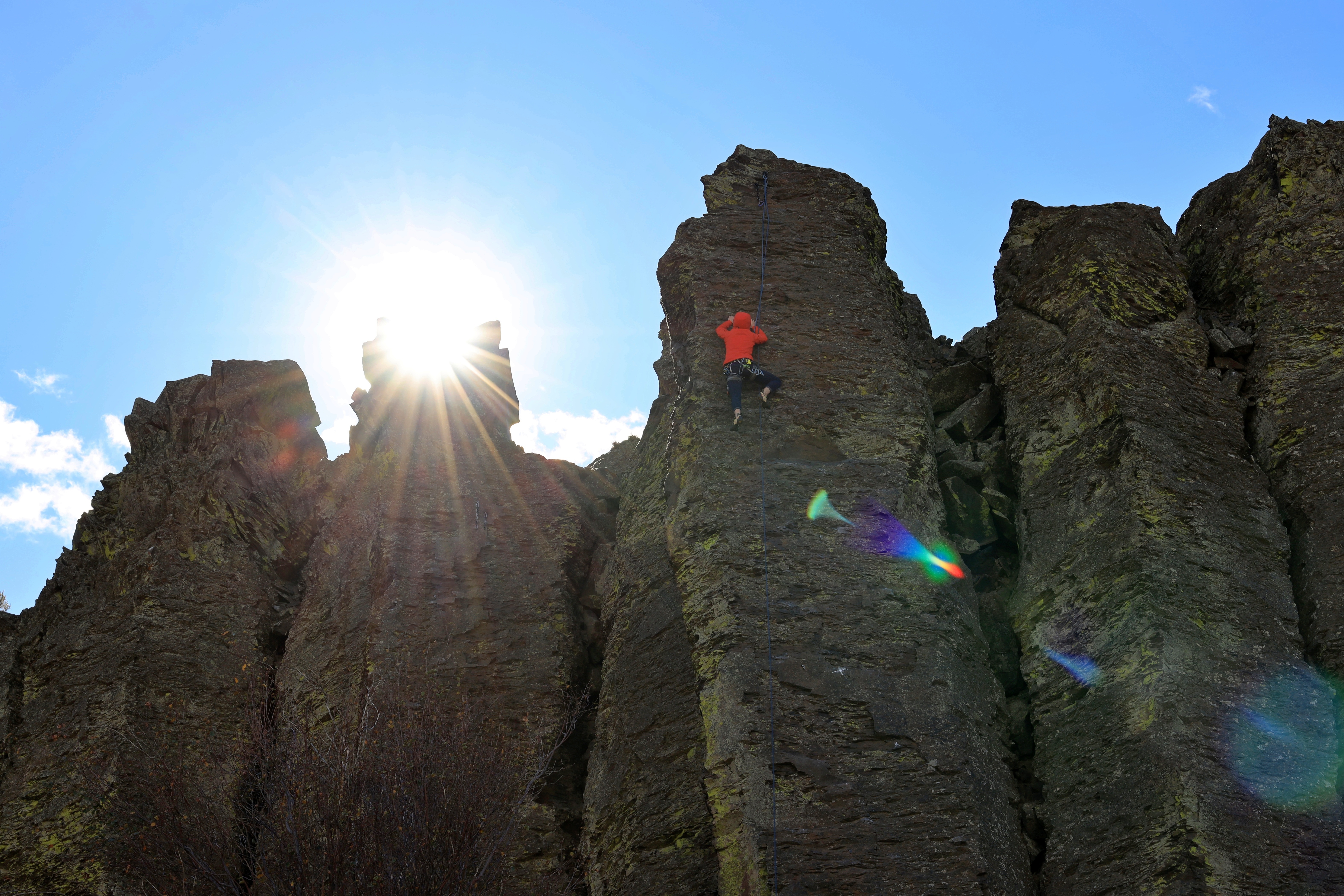 구석구석에 암벽등반을 하는 선수들이 있습니다. 주상절리 절벽들이 2 마일에 걸쳐 이어지고 높이는 10 - 50 미터쯤 됩니다.