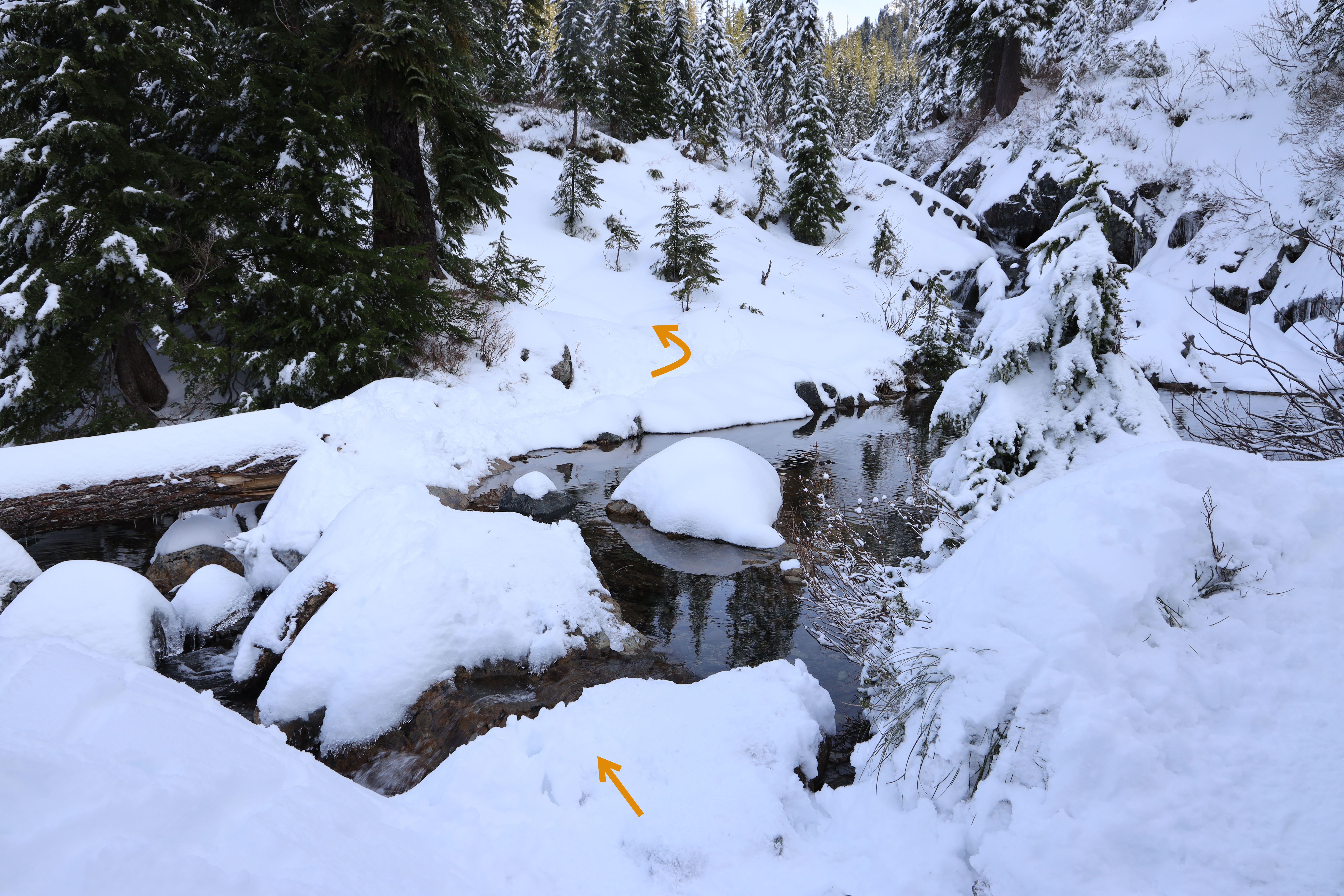 <노란색 구간> 겨울철에만 임시로 생기는 계곡으로 Source Lake를 오르는 길입니다. 계곡의 눈 다리(Snow Bridge)를 여러 개 건너는데 해빙기에는 산악 스키는 쉽게 건너도 설피 (Snowshoe)가 건너기 힘든 곳이 있습니다.