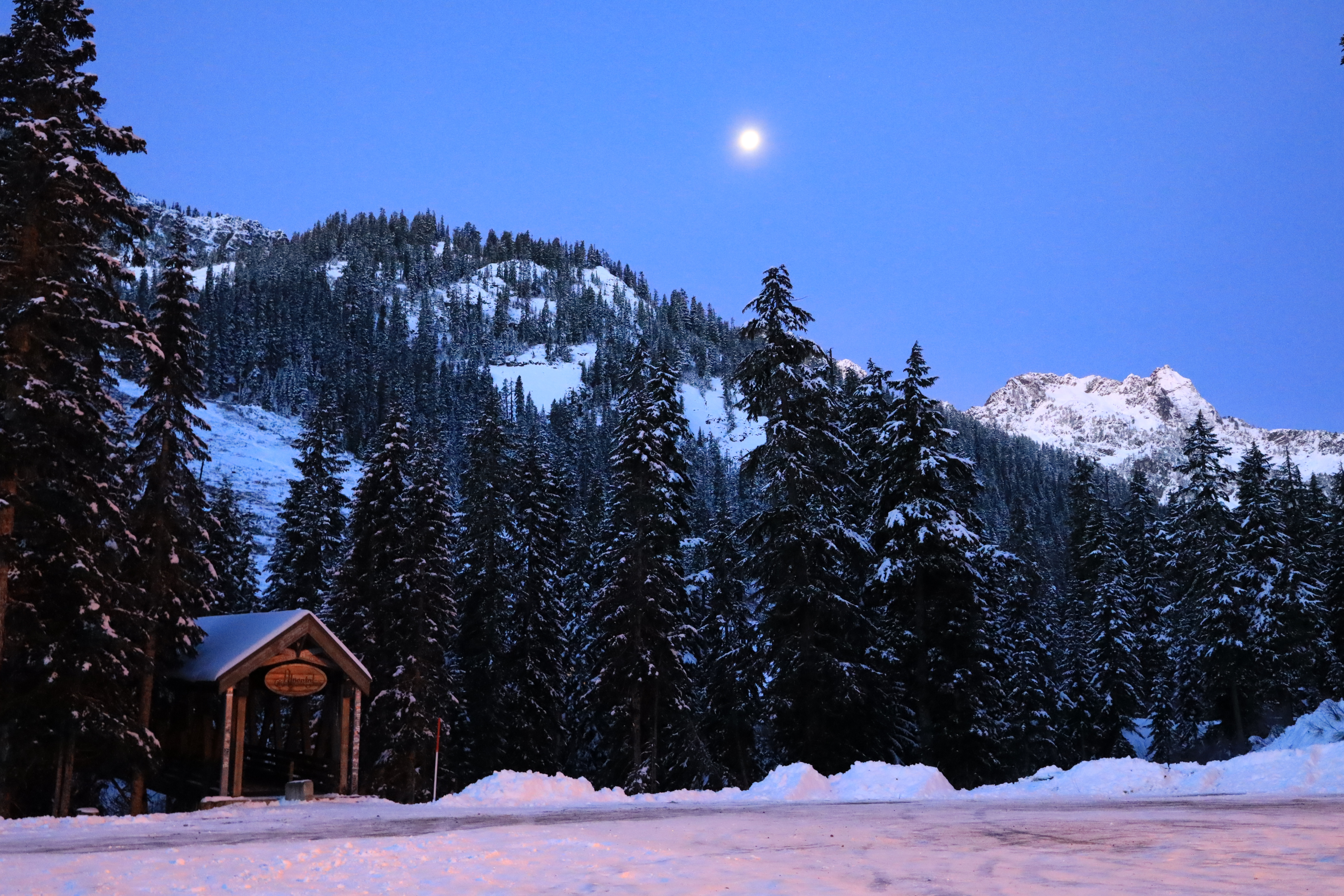 Gem Lake까지 가려면 눈길 산행 치고는 거리가 멀고 (왕복 10 마일, 16 Km) 해가 짧아 서둘러야 합니다. 해 뜨는 시간이 7시 반쯤이었지만 7시부터 달빛 받으며 산행을 시작하였습니다. (주차된 차를 보니 5 팀이 저 보다 먼저 출발했네요.) 해뜨기 전에도 눈 때문에 주변이 밝아 산행은 문제없었고 스키장 뒷산에 둥근달이 걸려 있습니다.