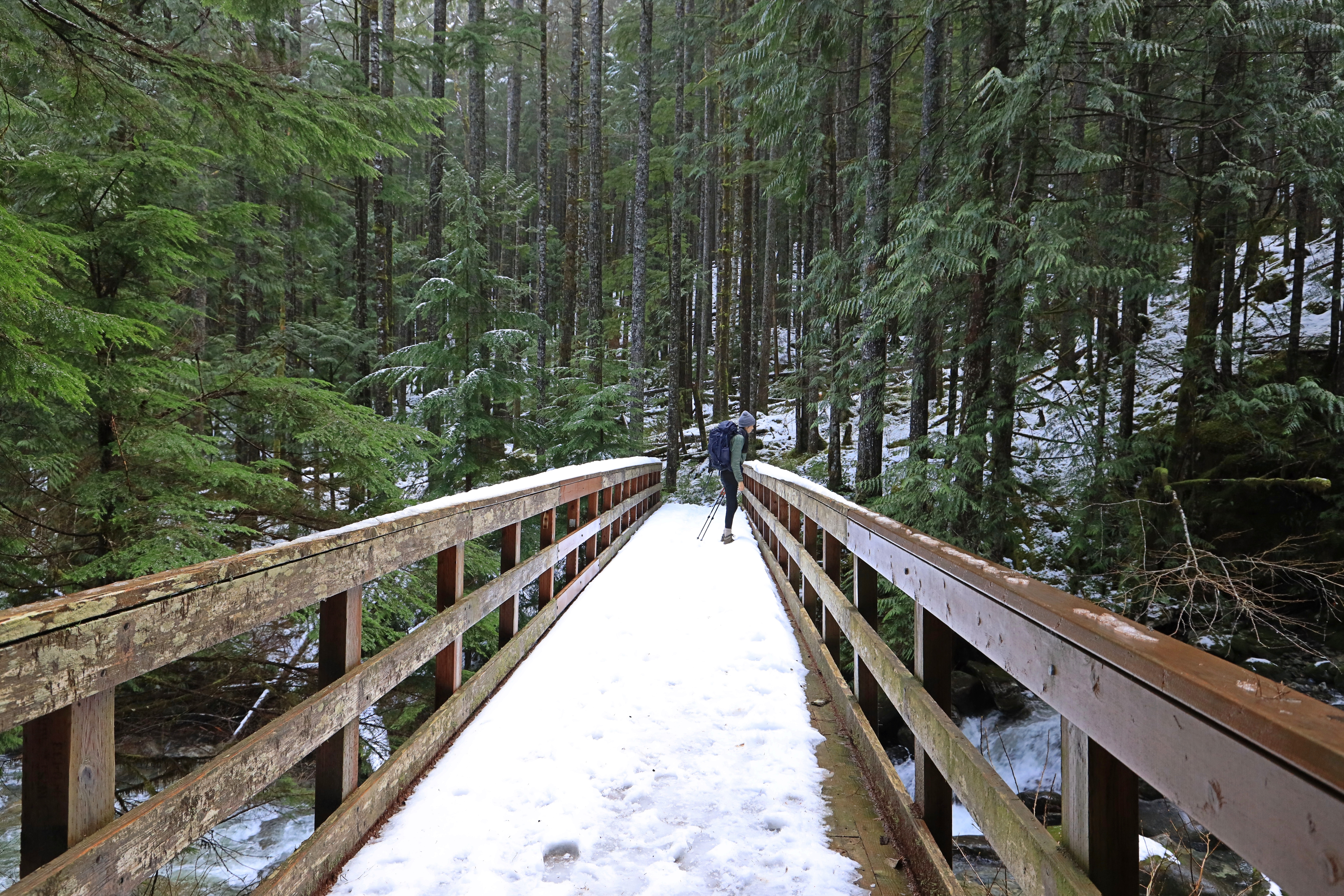 앞서거니 뒤서거니 같이 산을 오른 젊은이인데 Cripple Creek 다리 위에서 폭포를 보고 있습니다. 털모자 표식에 대하여 물어보니 'Green Seattle 자원봉사자'라고 하네요.