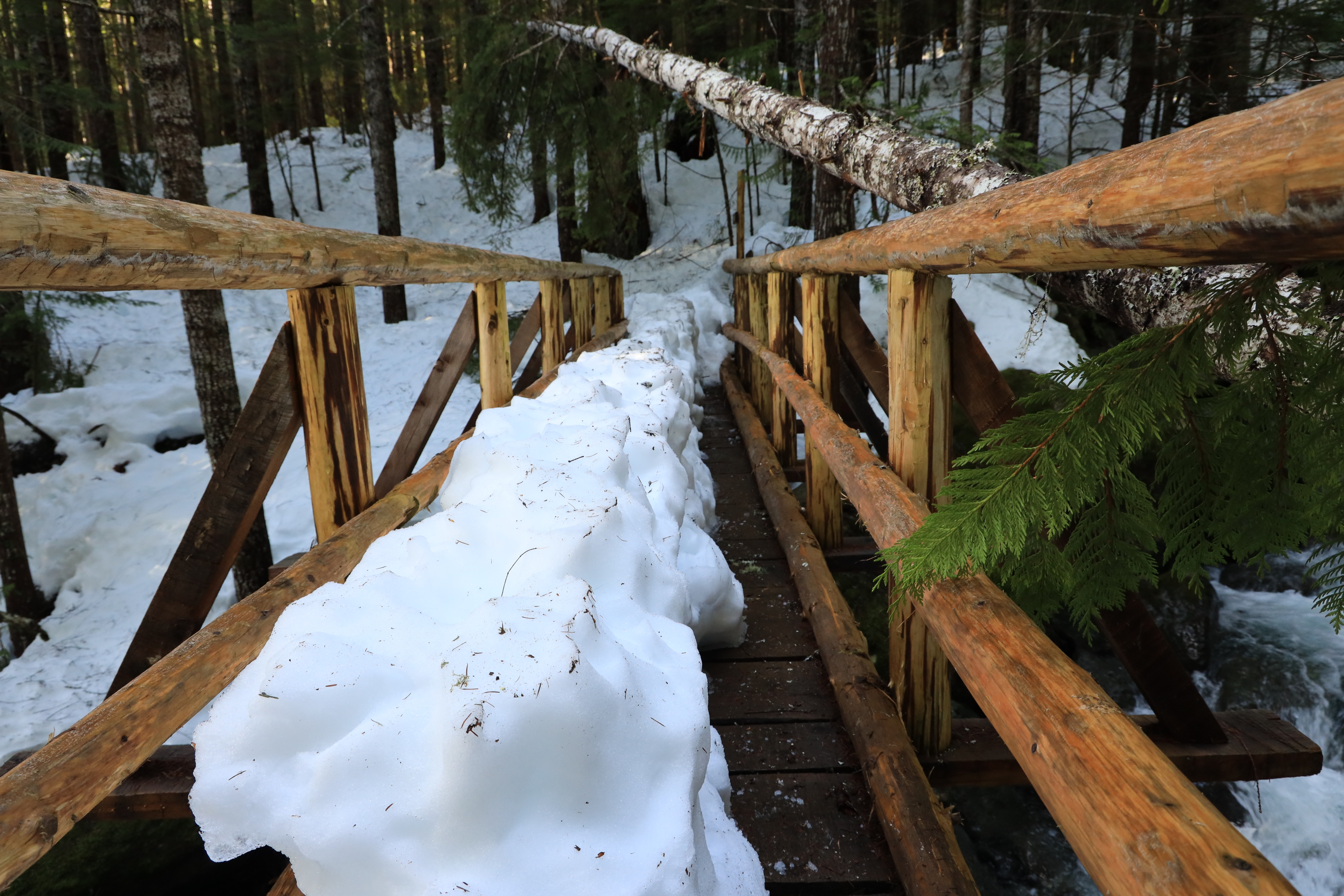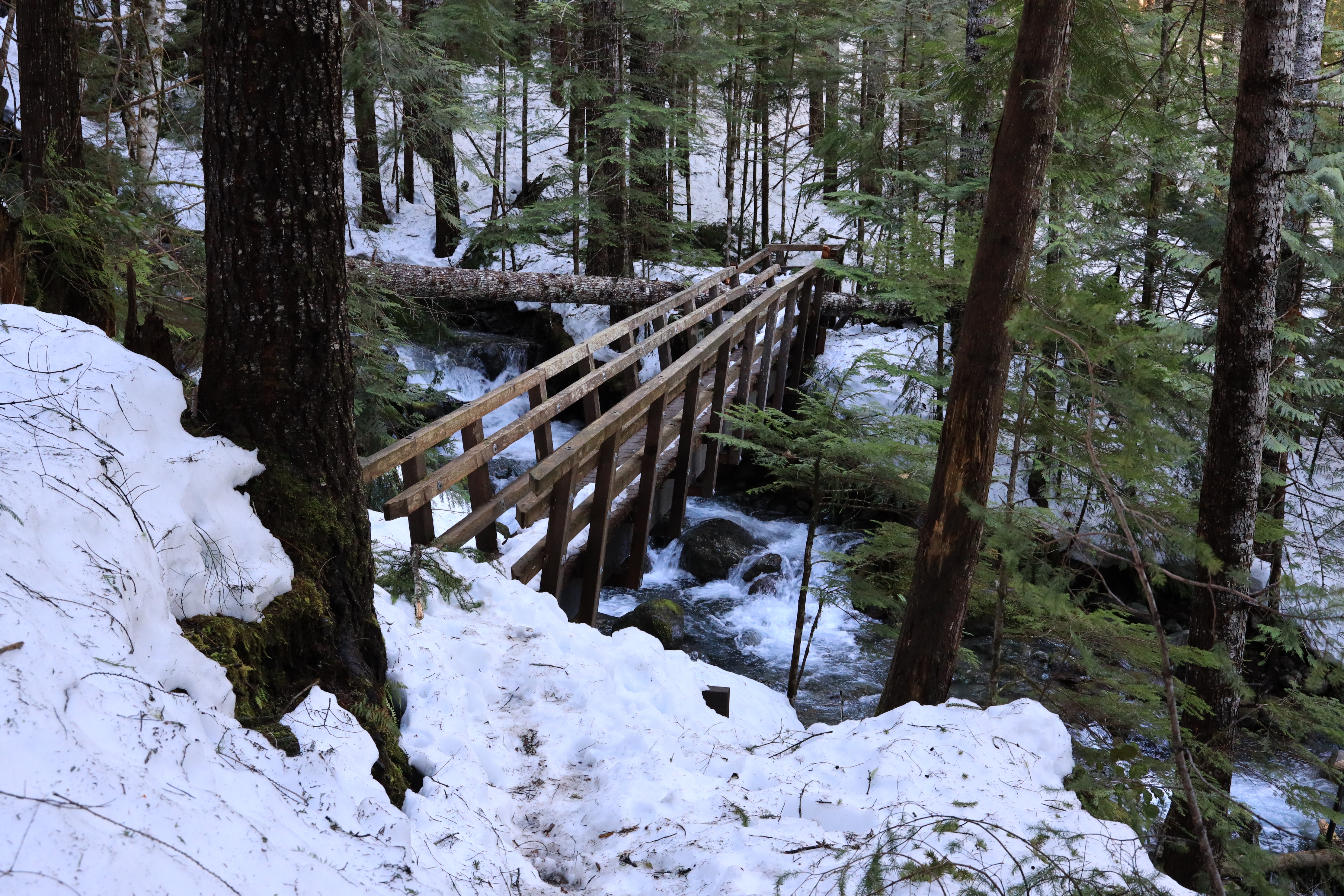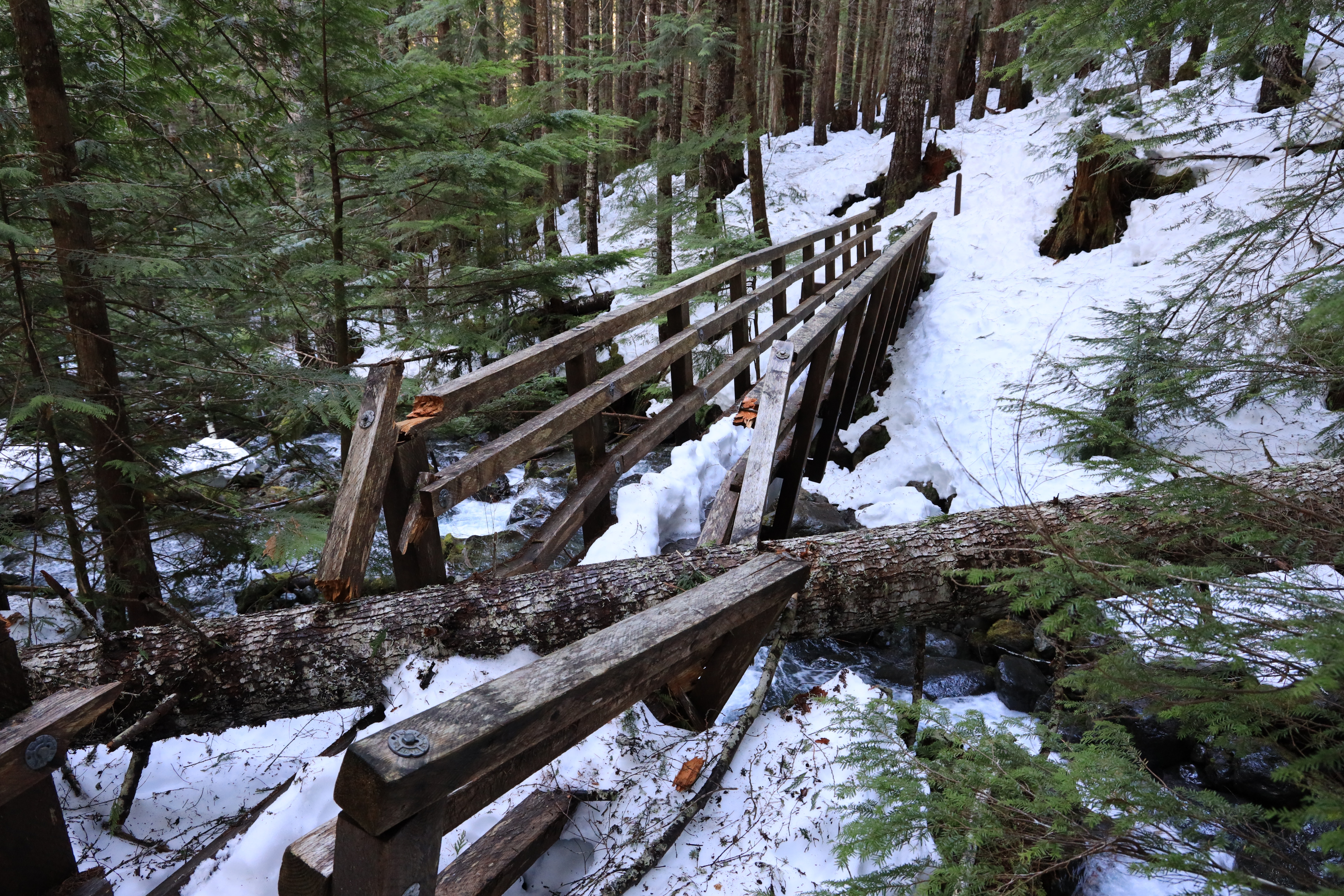 산 위에는 눈이 2 - 4 피트 (60 - 120 cm) 쌓여있어 다리 건너기도 조심스럽습니다. 먼저 왔던 산객들이 다리 위 눈을 일부 치웠나 보네요.