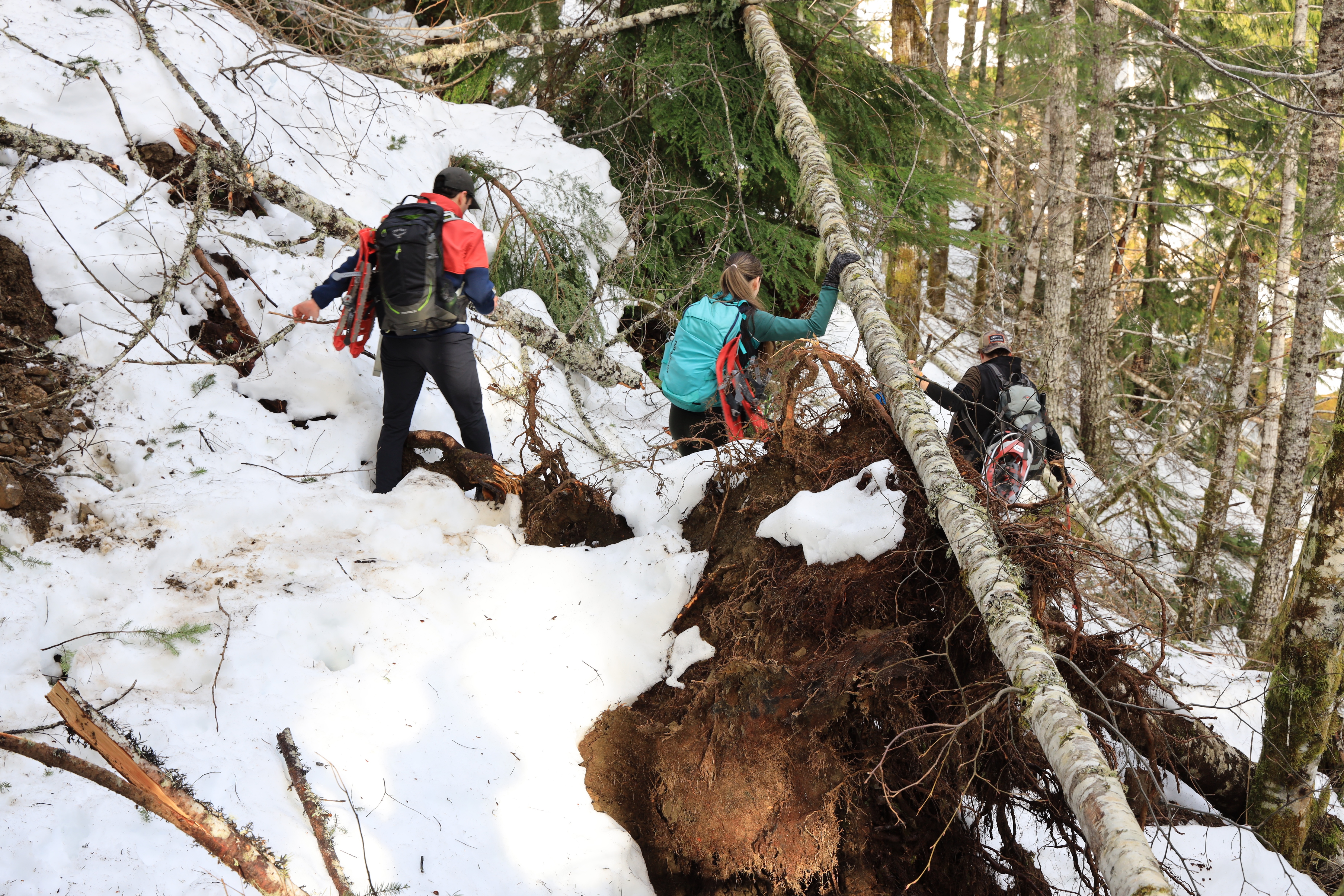 등산로 위로 쓰러진 나무가 수백 그루가 넘어 종합 장애물을 통과하는 눈길 산행을 하였습니다.