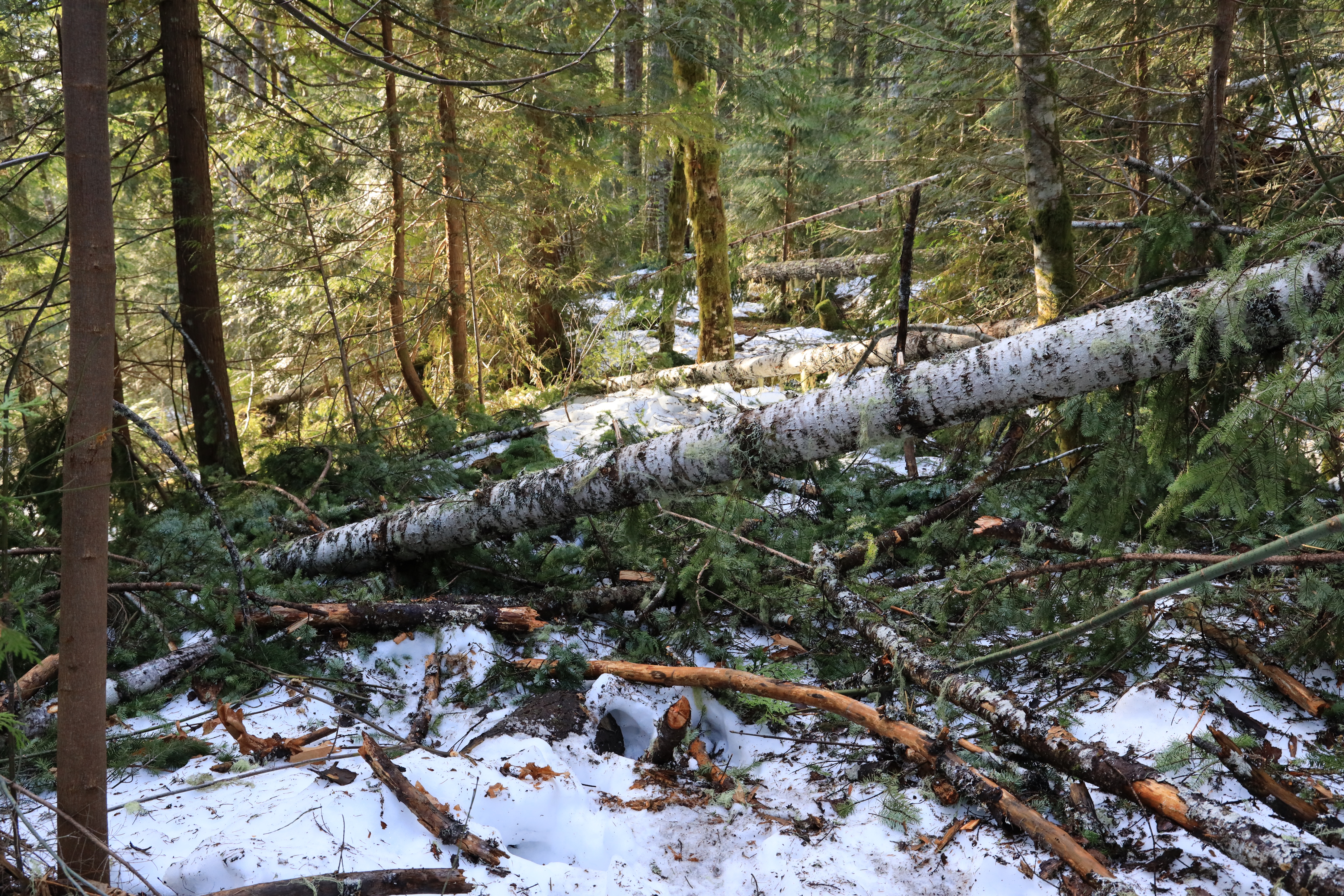 계곡에도 쓰러진 나무들이 가득 차 있습니다.