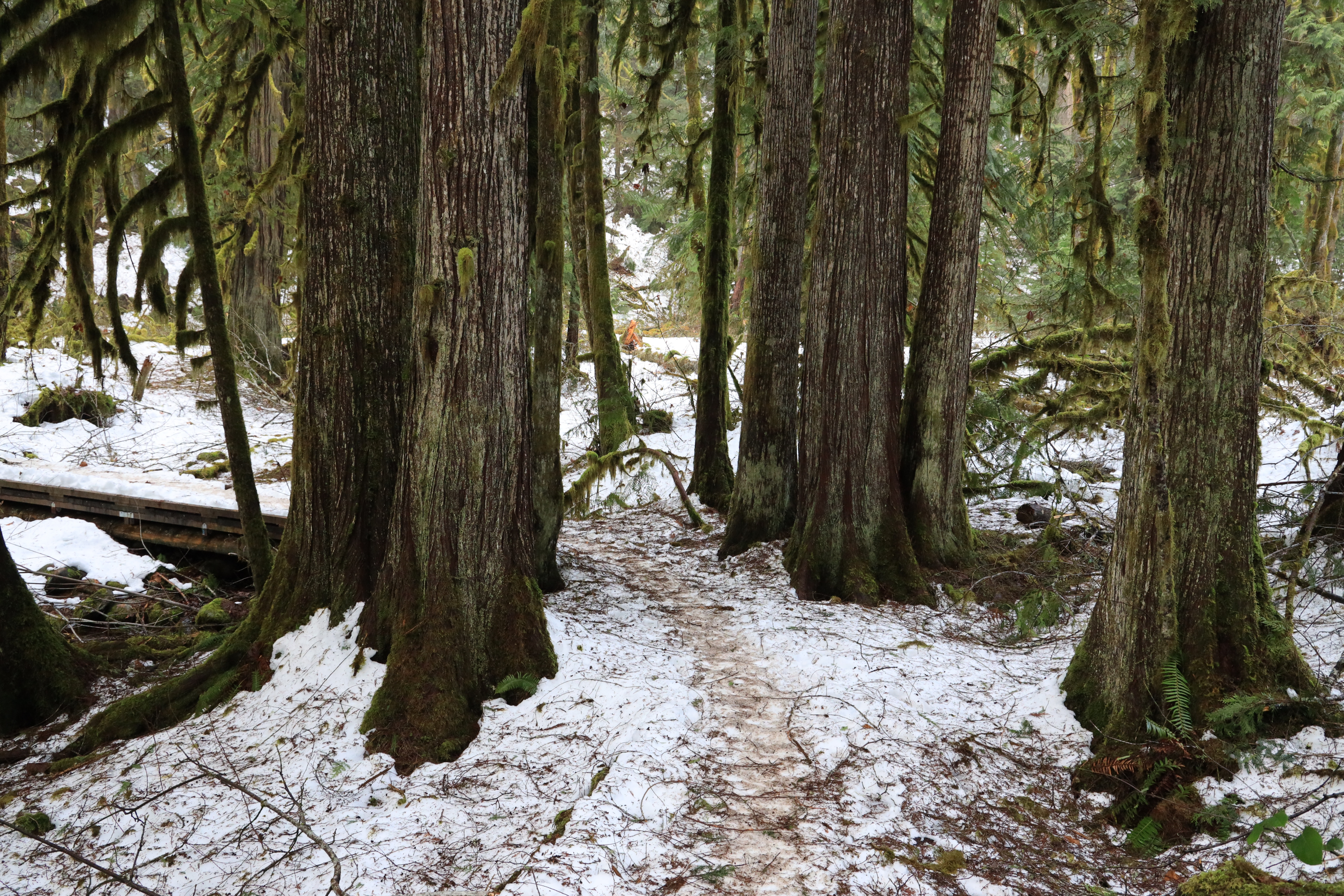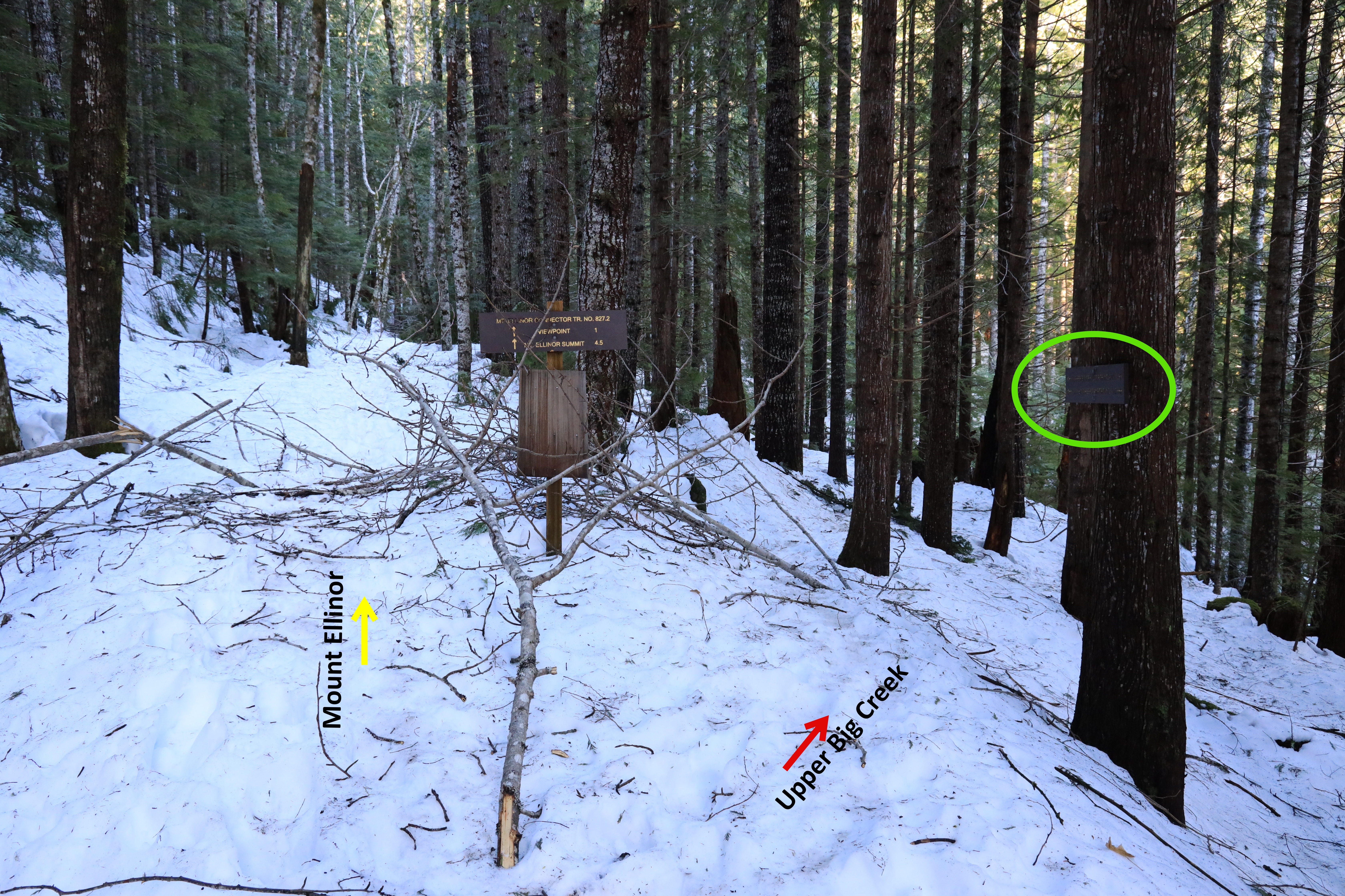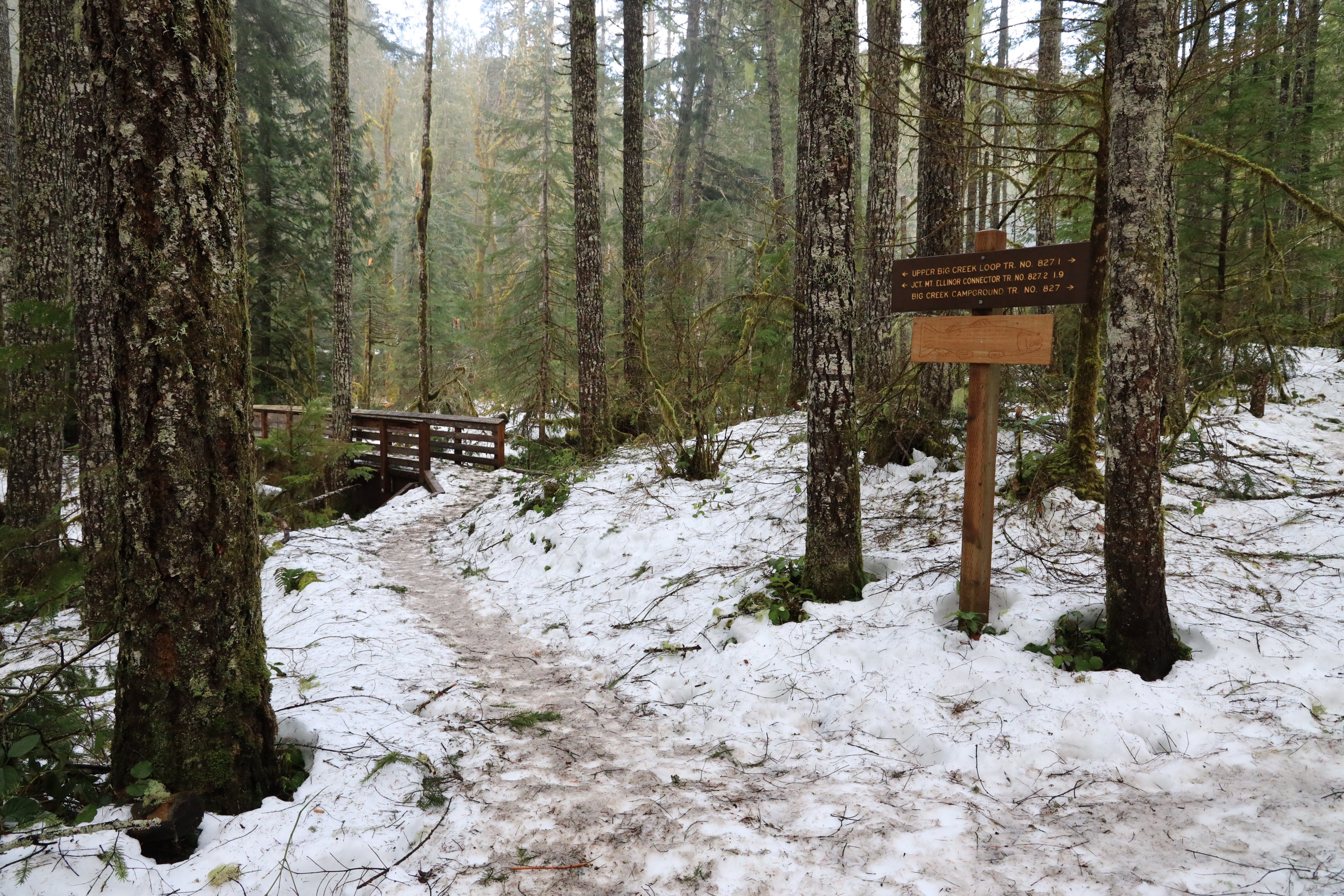 사진 가운데 있는 이정표를 보면 착각하기 쉽습니다. 전망대 (Viewpoint) 1 마일 남았다는 표시를 보고 직진하면 Mount Ellinor 오르는 길입니다. Upper Big Creek Loop는 오른쪽으로 언덕을 내려가야 되고, 나무에 있는 이정표는 잘 보이지 않습니다.