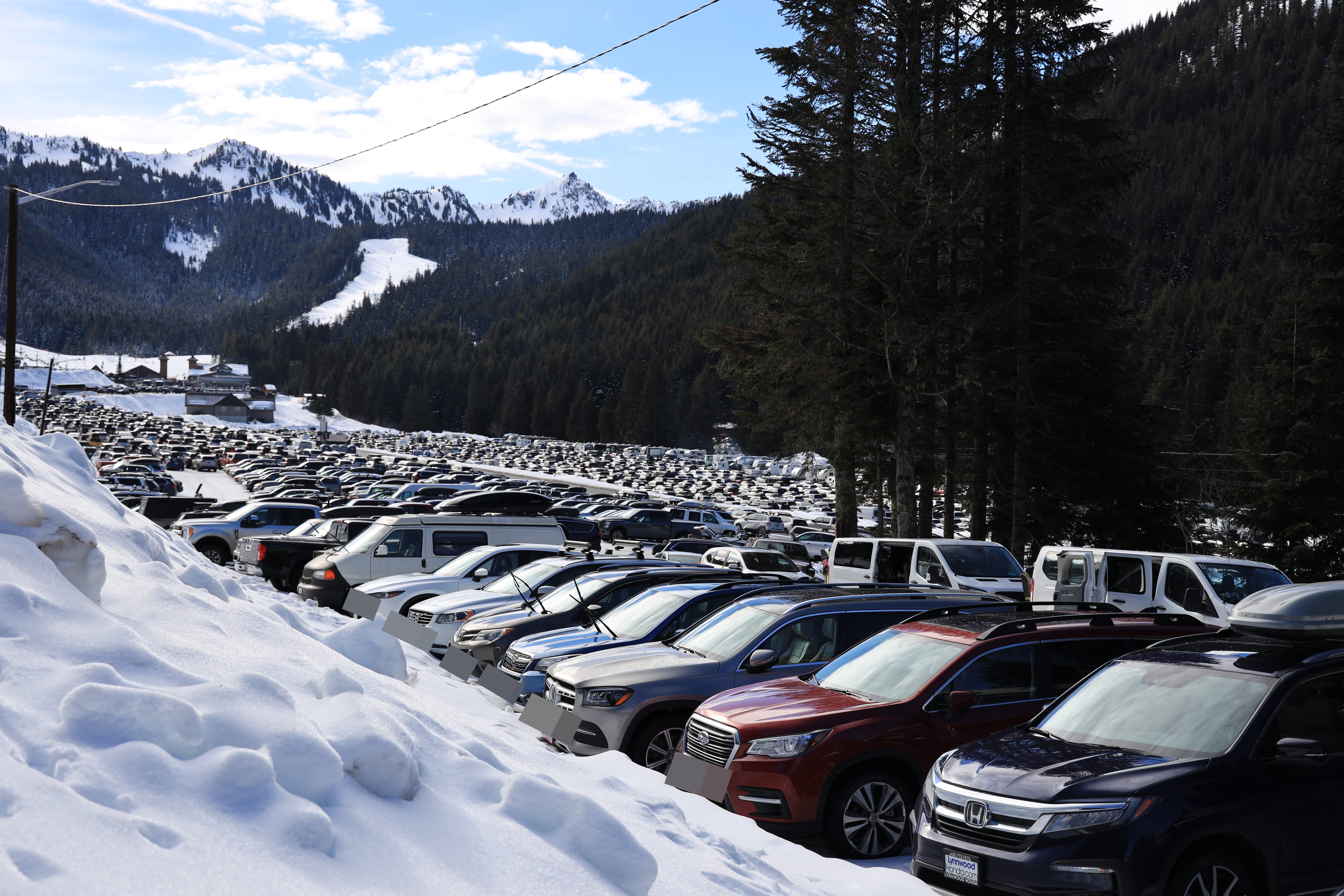 하산하니 스키장 (Crystal Mountain) 주차장이 차들로 꽉 차 있었고, 스키장에는 도로를 따라 커다란 주차장이 몇 개 더 있습니다.