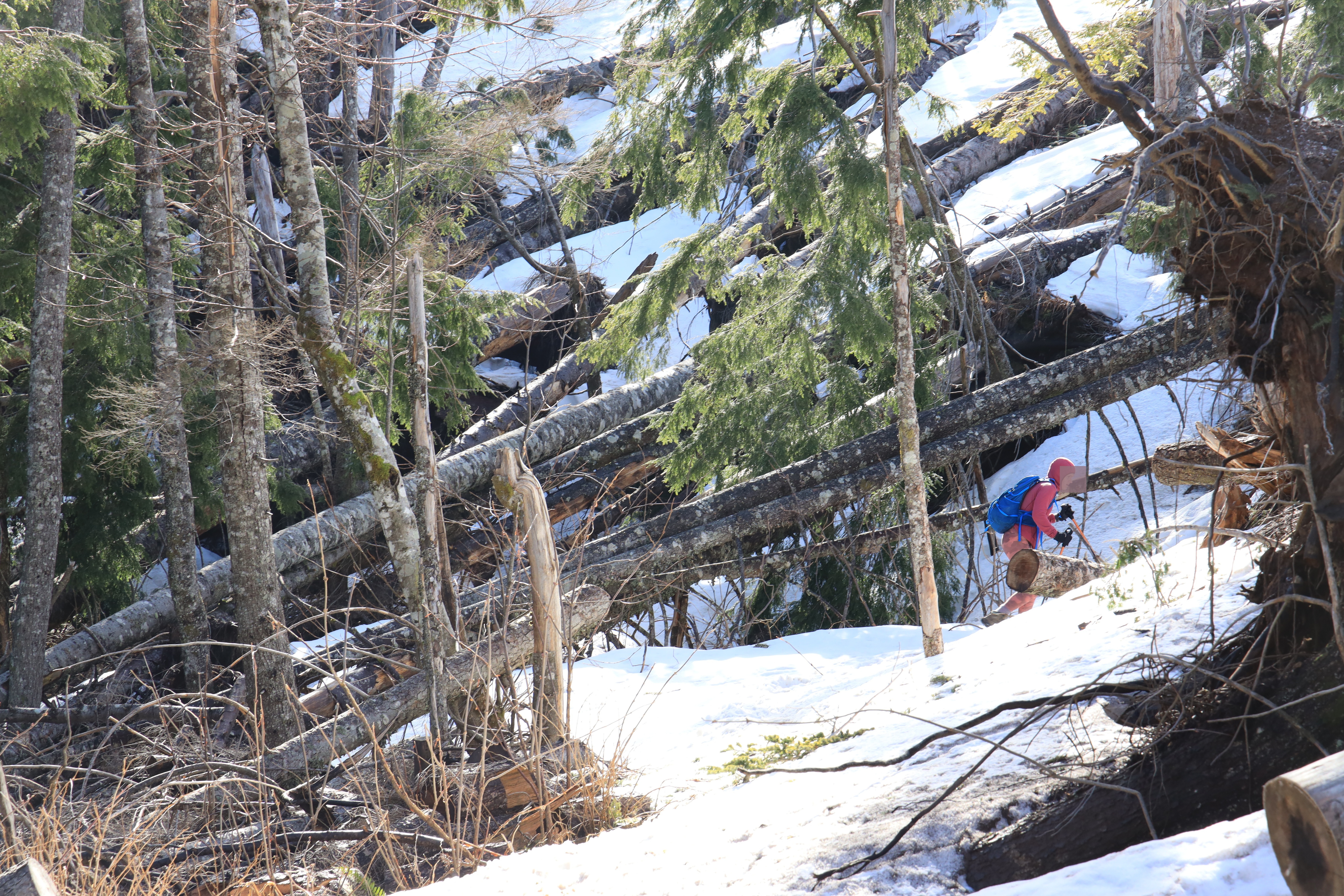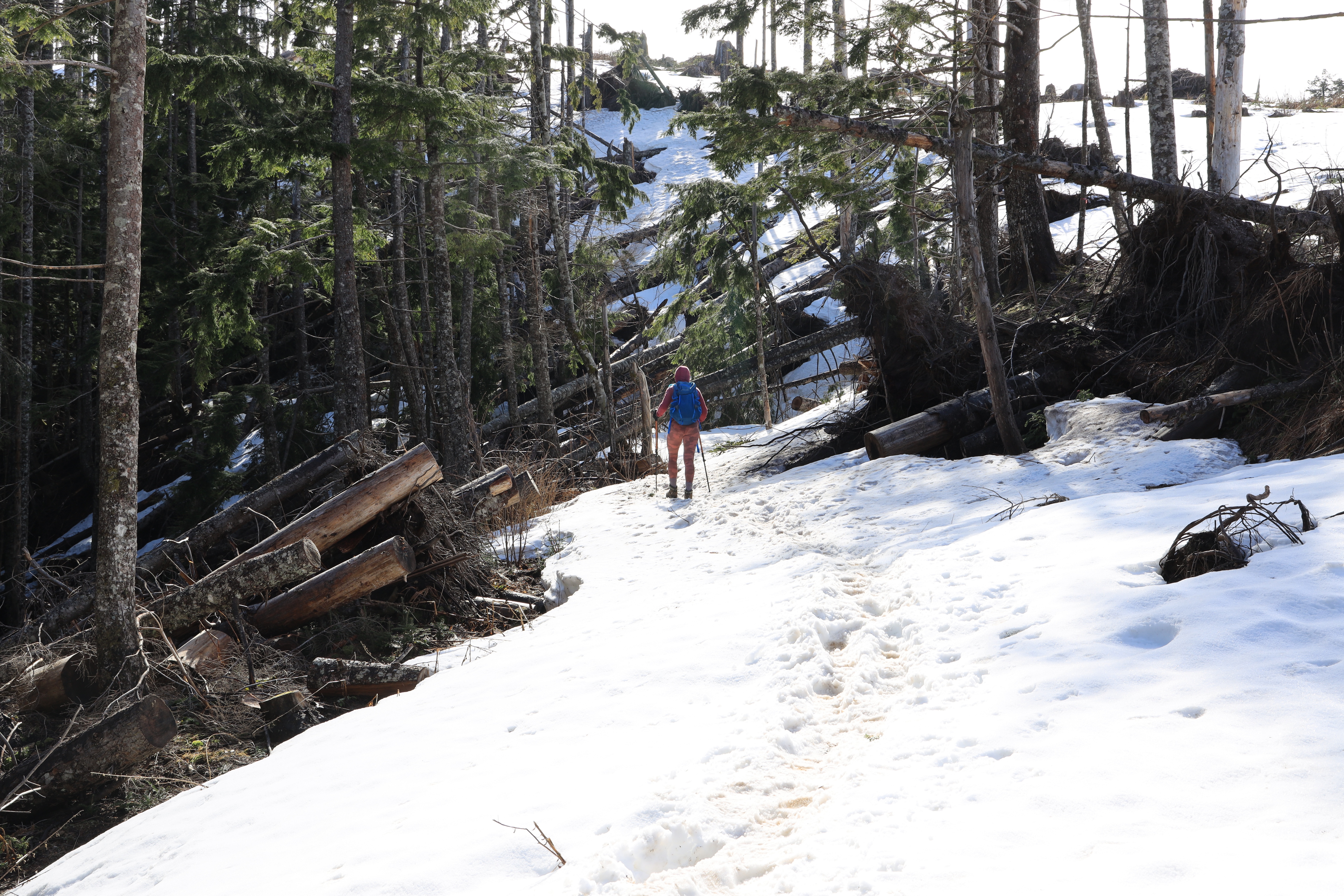 산 위에는 잔설이 1 - 2 피트 (30 - 60 cm) 남아 있었지만 다져져 있어 발이 빠지지 않았고 아이젠 (Micro Spikes)도 사용하지 않았습니다.