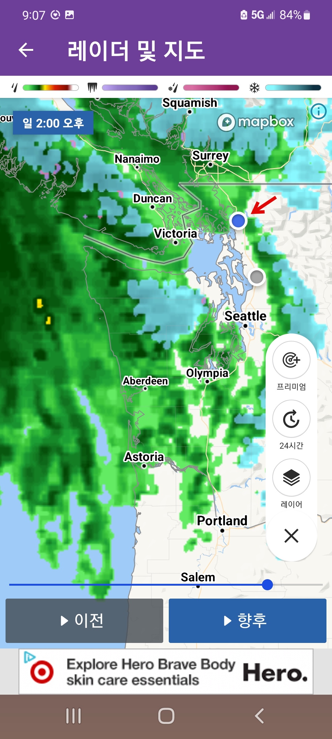 커다란 비구름이 태평양에서 몰려옵니다. (위 사진의 초록색이 비구름이고 빨간 화살표가 제가 있던 곳입니다) 큰 비 오기 전에 서둘러 하산하면서 만난 산을 오르던 산객들은 평상복 차림으로 배낭도 메지 않았습니다. 날씨도 손이 시릴 정도로 쌀쌀한데 그분들 비 때문에 고생 많이 하겠네요.