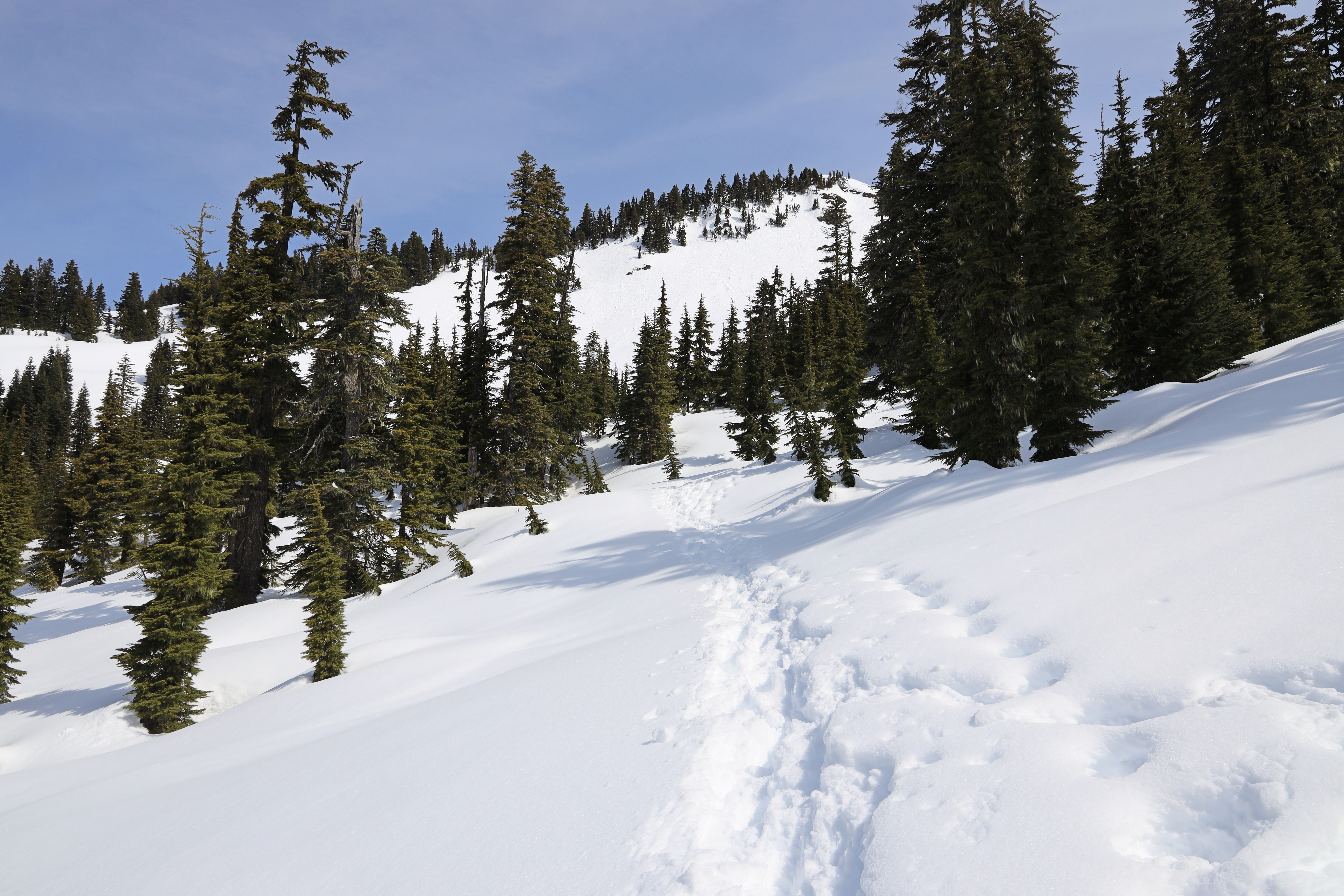 등산로 입구에서 약 1 마일 지점부터 눈길이 시작되었고, 십 여개의 발자국이 남아 있습니다.