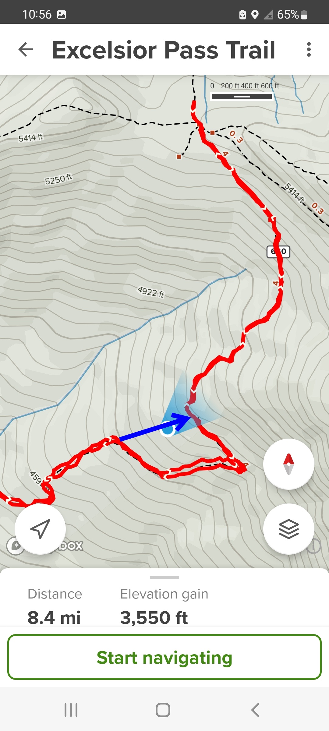 위 사진은 아래 지도의 갈림길 'B 지점' 근처이고 뒤에 보이는 봉우리가 산행 목적지인 Excelsior Peak입니다.