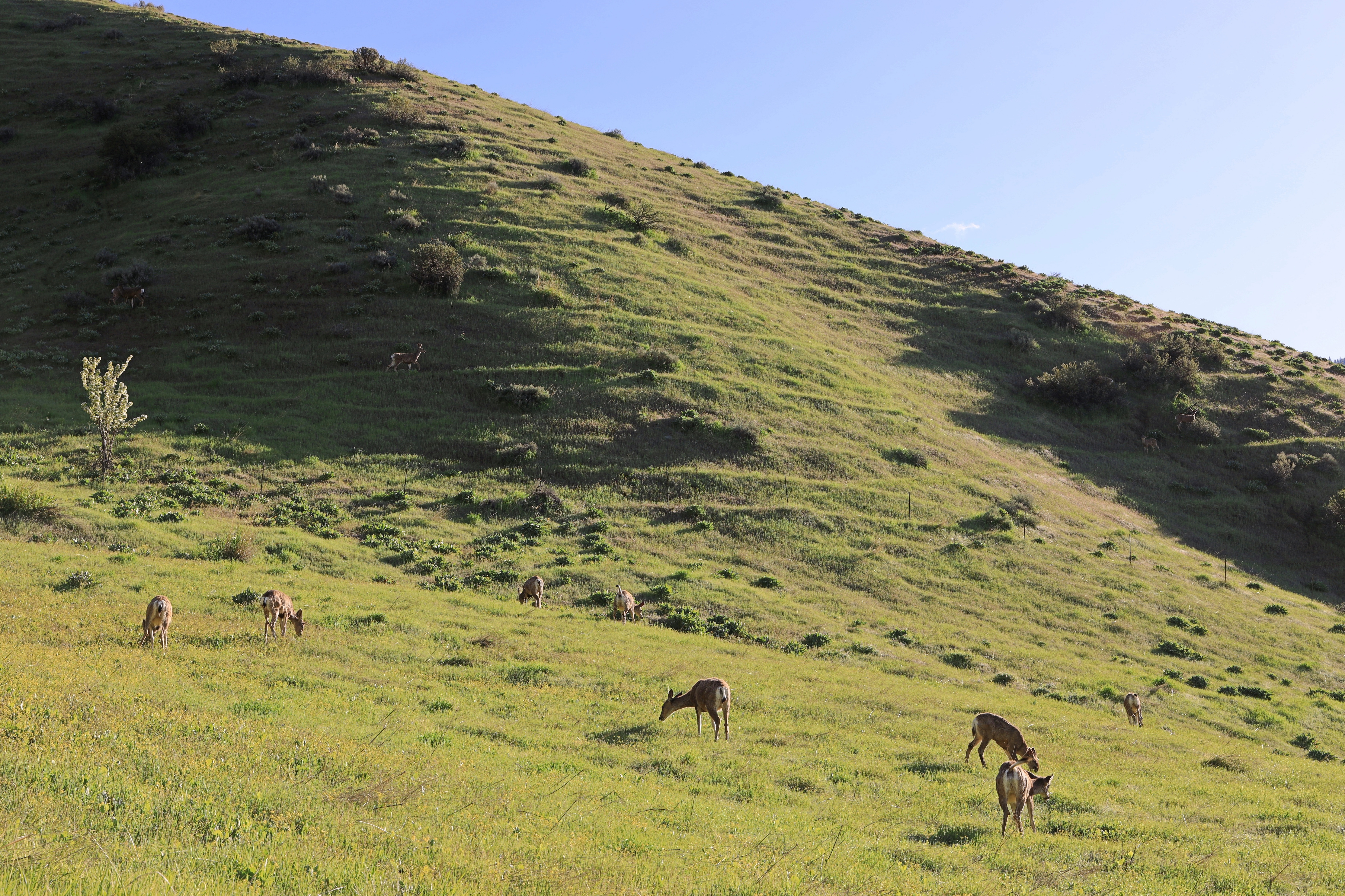 이 사슴 무리는 11 마리가 보이네요. 초원에서 숨은 사슴 찾기 하는 것 같습니다.