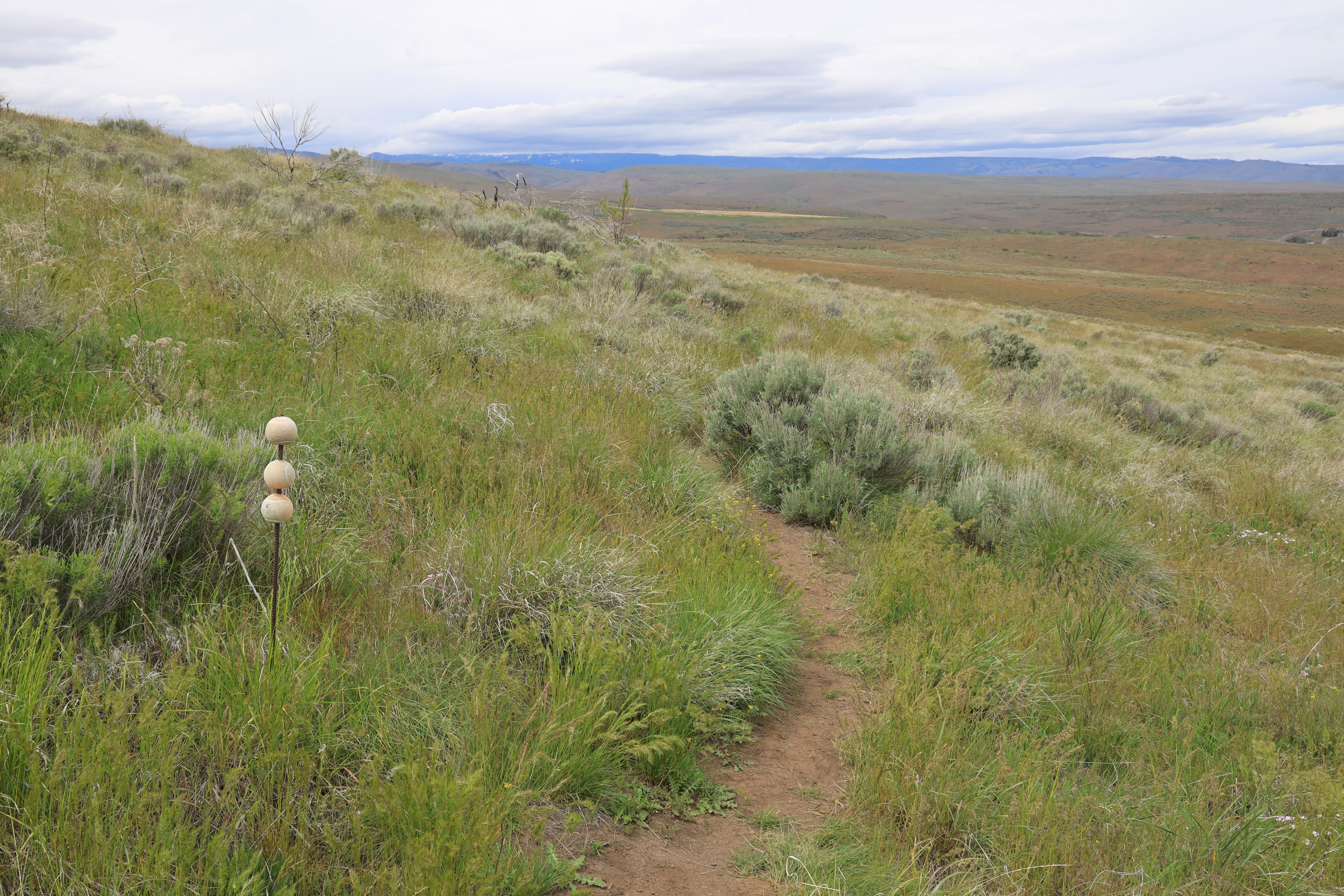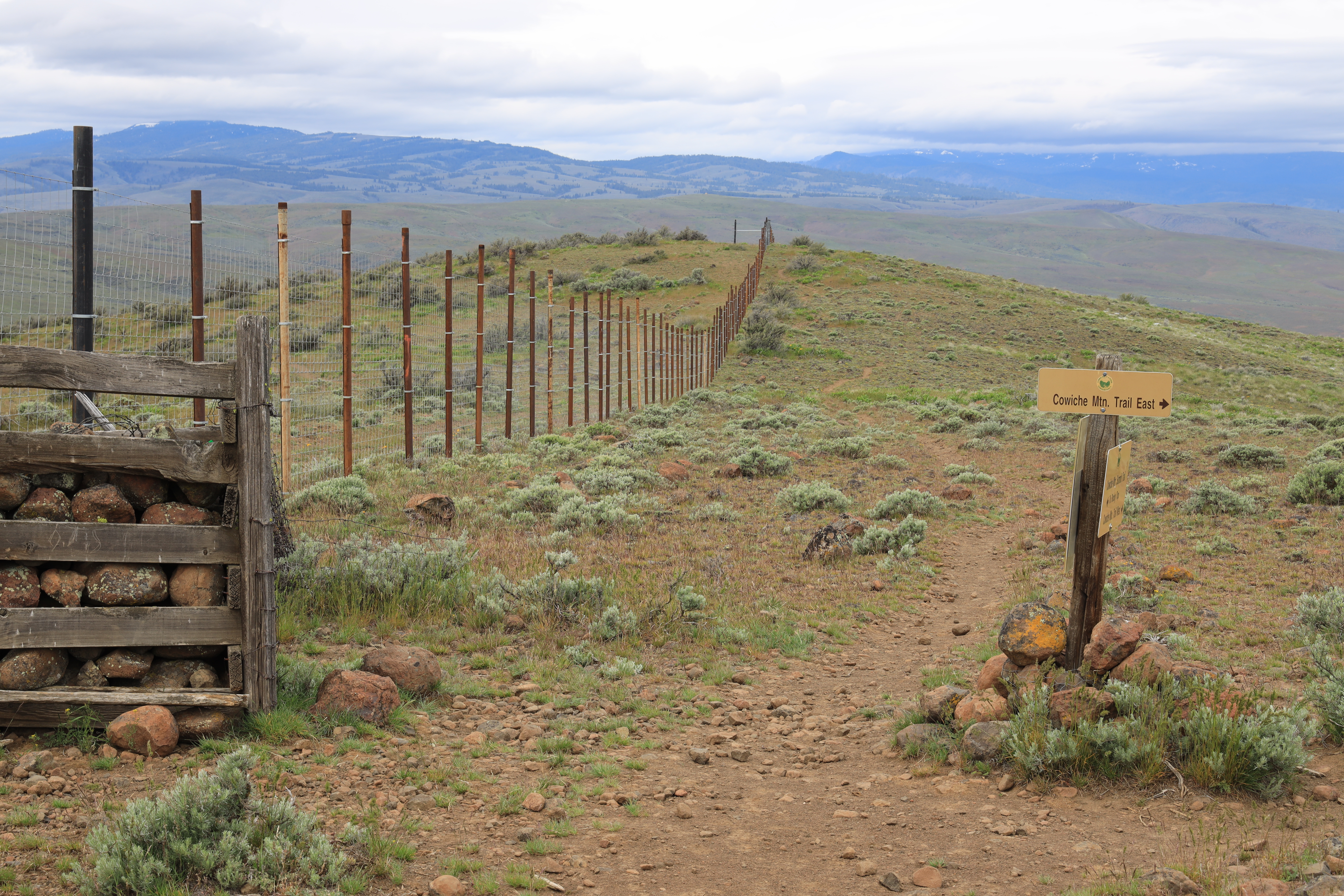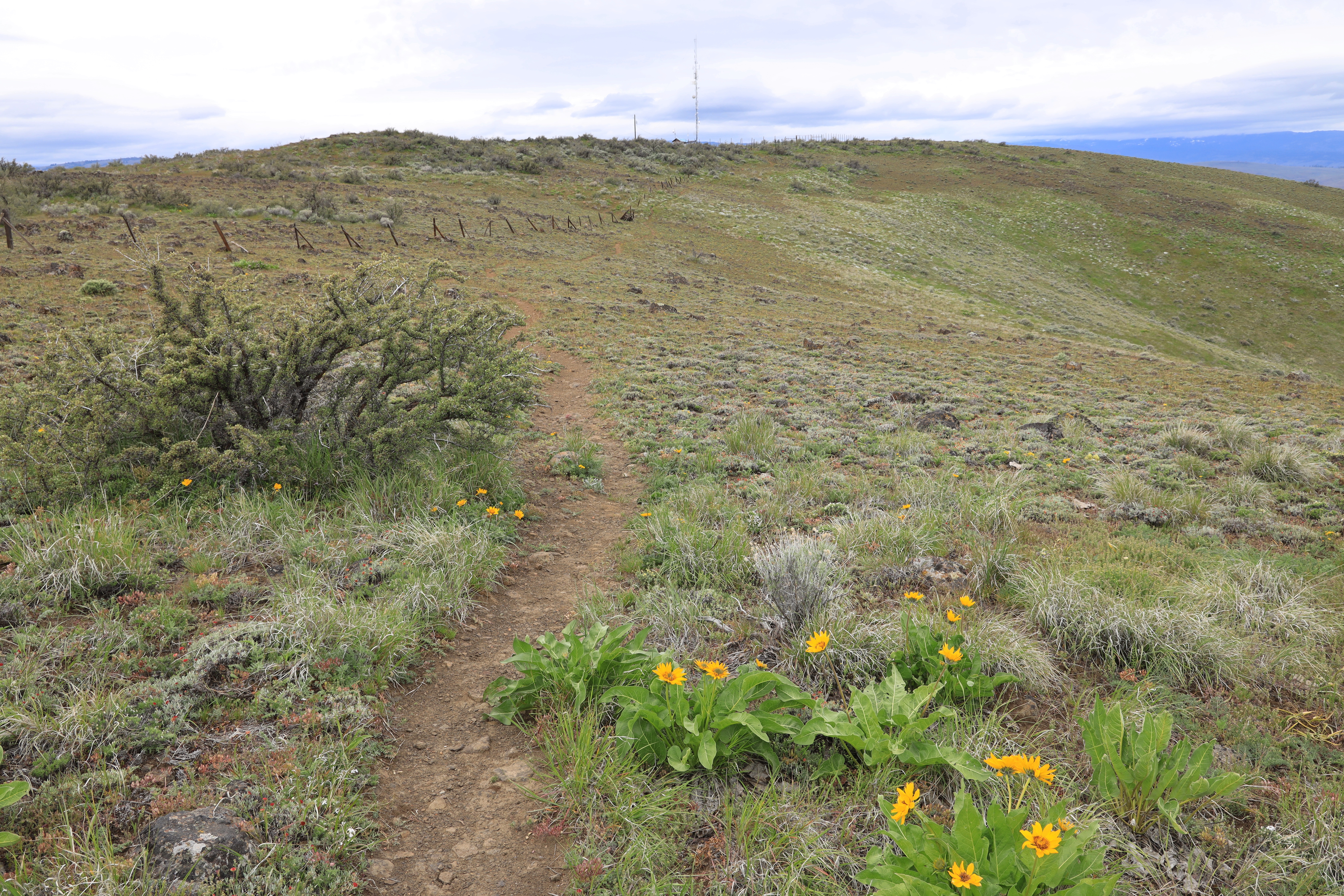 등산로 입구에서 산 정상이 빤히 보입니다. 산이라고 밋밋해서 언덕같이 보이는데, 땡볕에 오르려면 고생길 같네요. 그런데, 여기에 짙은 야생화 향기와 시원한 전망이 더해지니 또 예상 밖의 놀라움이 있습니다. 산행은 Cowiche Mountain West 등산로로 올라, Rocky Top까지 갔다가, Cowiche Mountain East로 하산하였습니다.