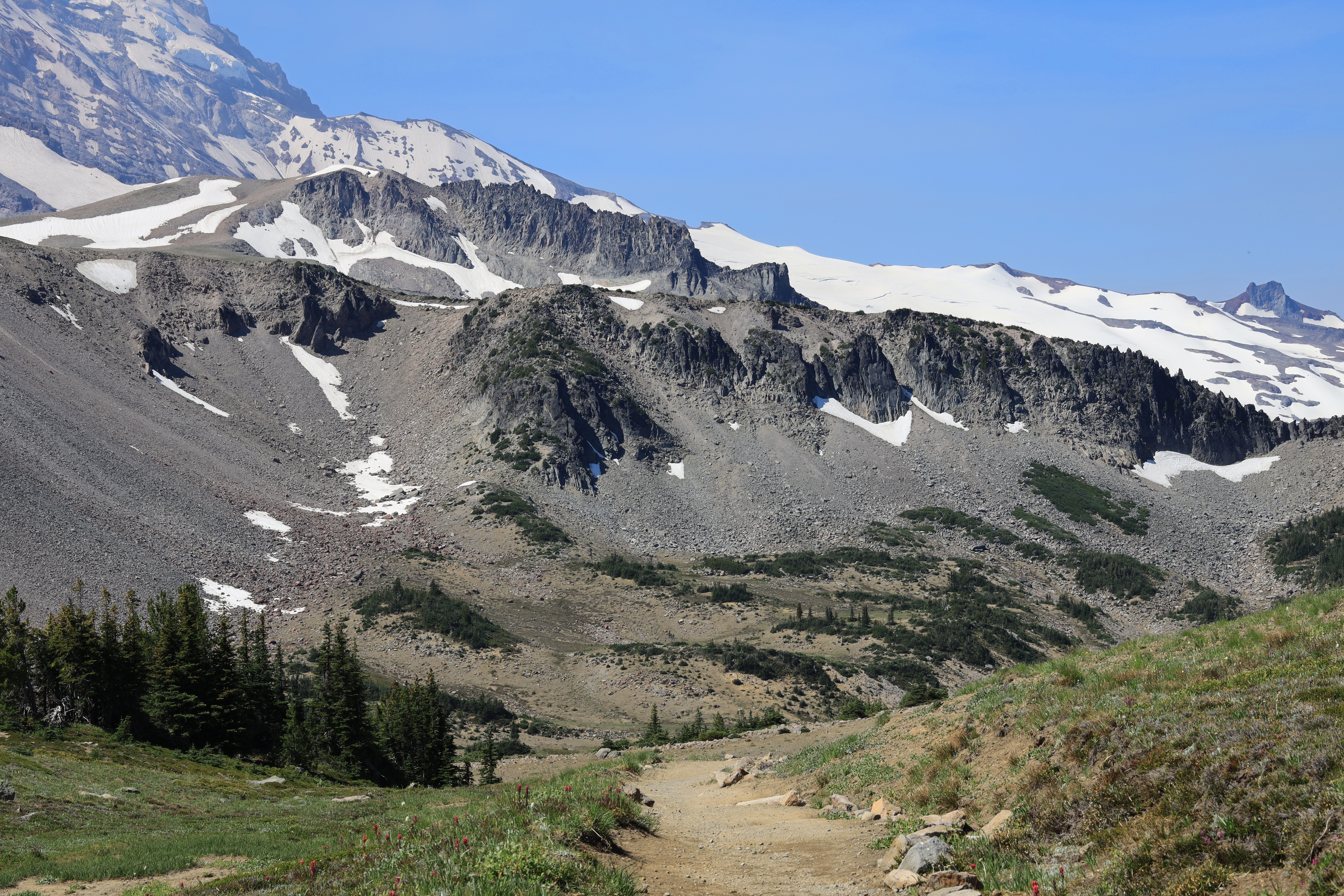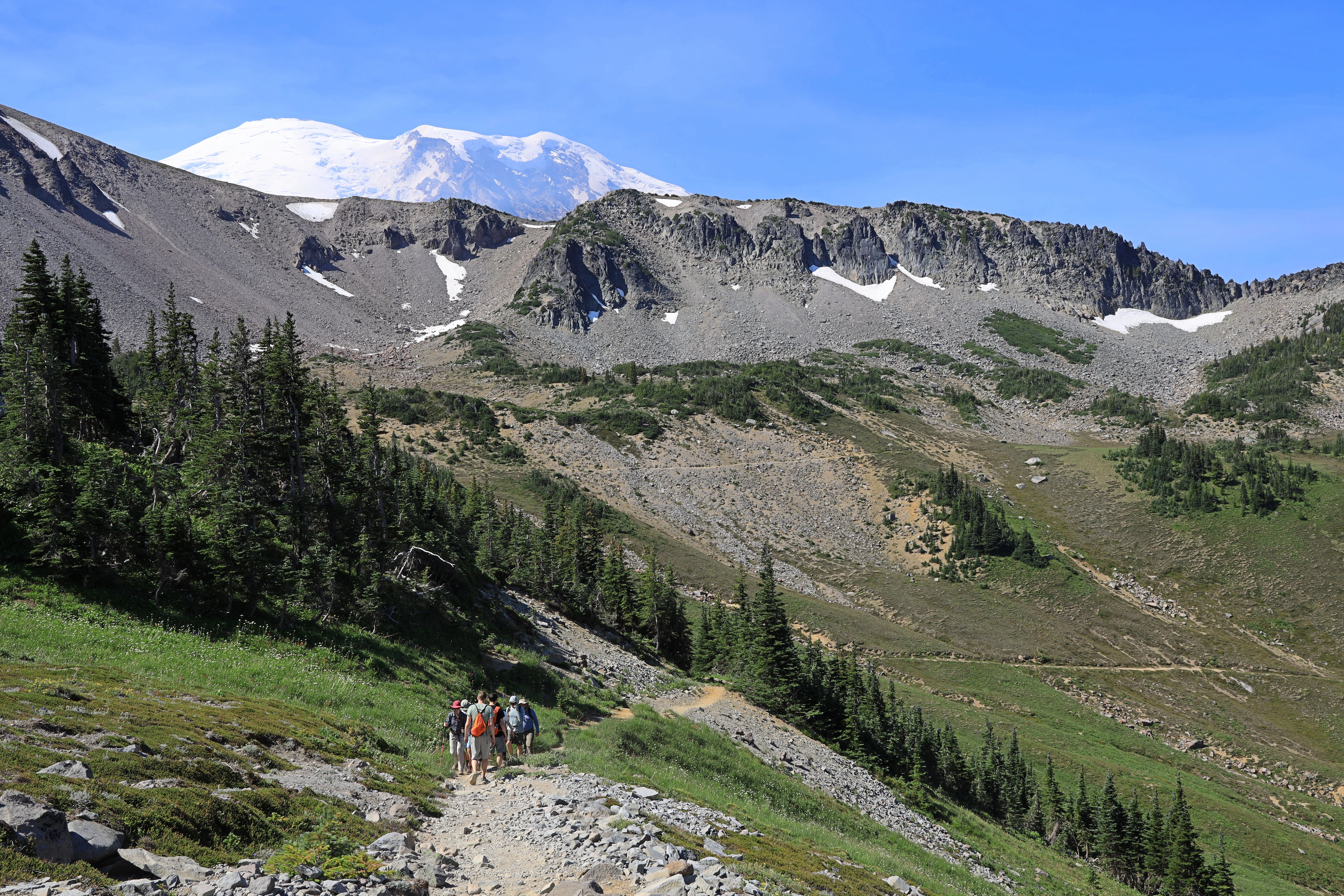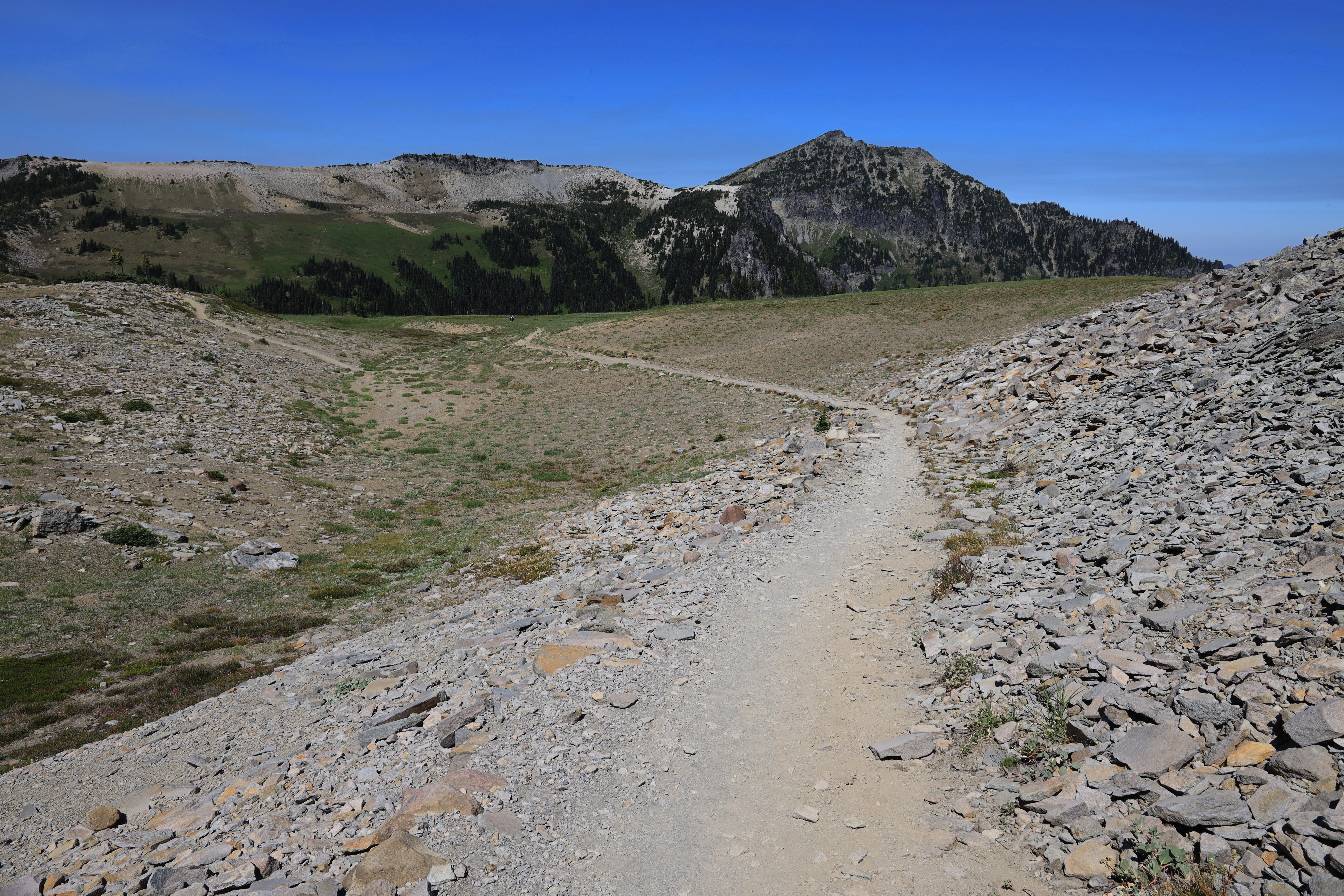 Frozen Lake 다섯 갈림길 (나무 뒤쪽)에서 산 위로 오르는 사람들은 Burroughs Mountain, 산 아래 방향은 Fremont Lookout 가는 길이며, 이 두 등산로는 산객과 관광객들로 항상 붐비는 곳입니다. 저는 한산한 사진 아래쪽 Wonderland Trail로 버클리 공원을 갑니다.