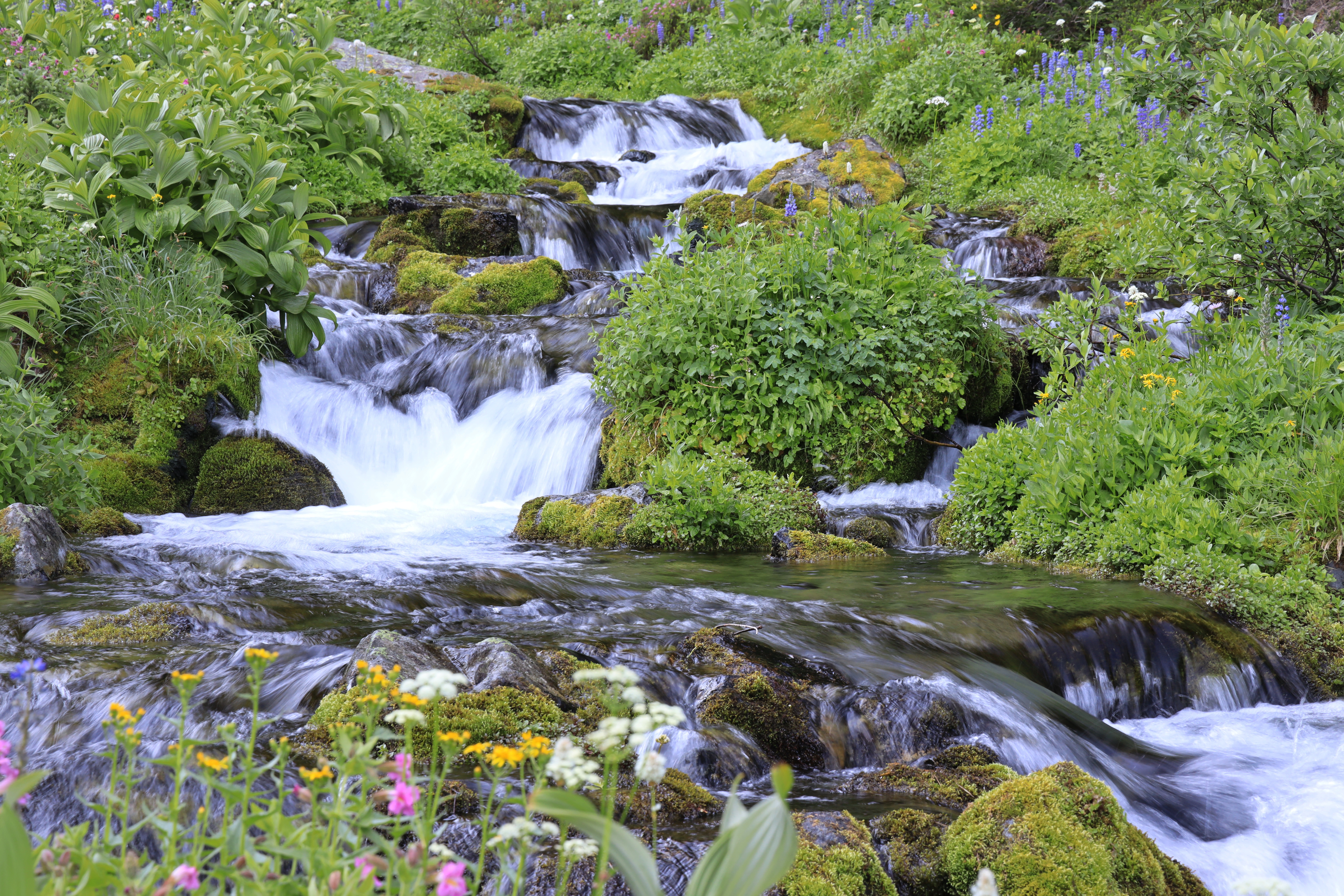 드디어 계곡에 도착했습니다. 계곡이 넓지는 않지만 땀을 식히기 충분하고 물소리가 청량합니다. 여기서부터는 전망이 확 바뀌어서 야생화 숲이 계속되며 야생화가 피기 시작했습니다.