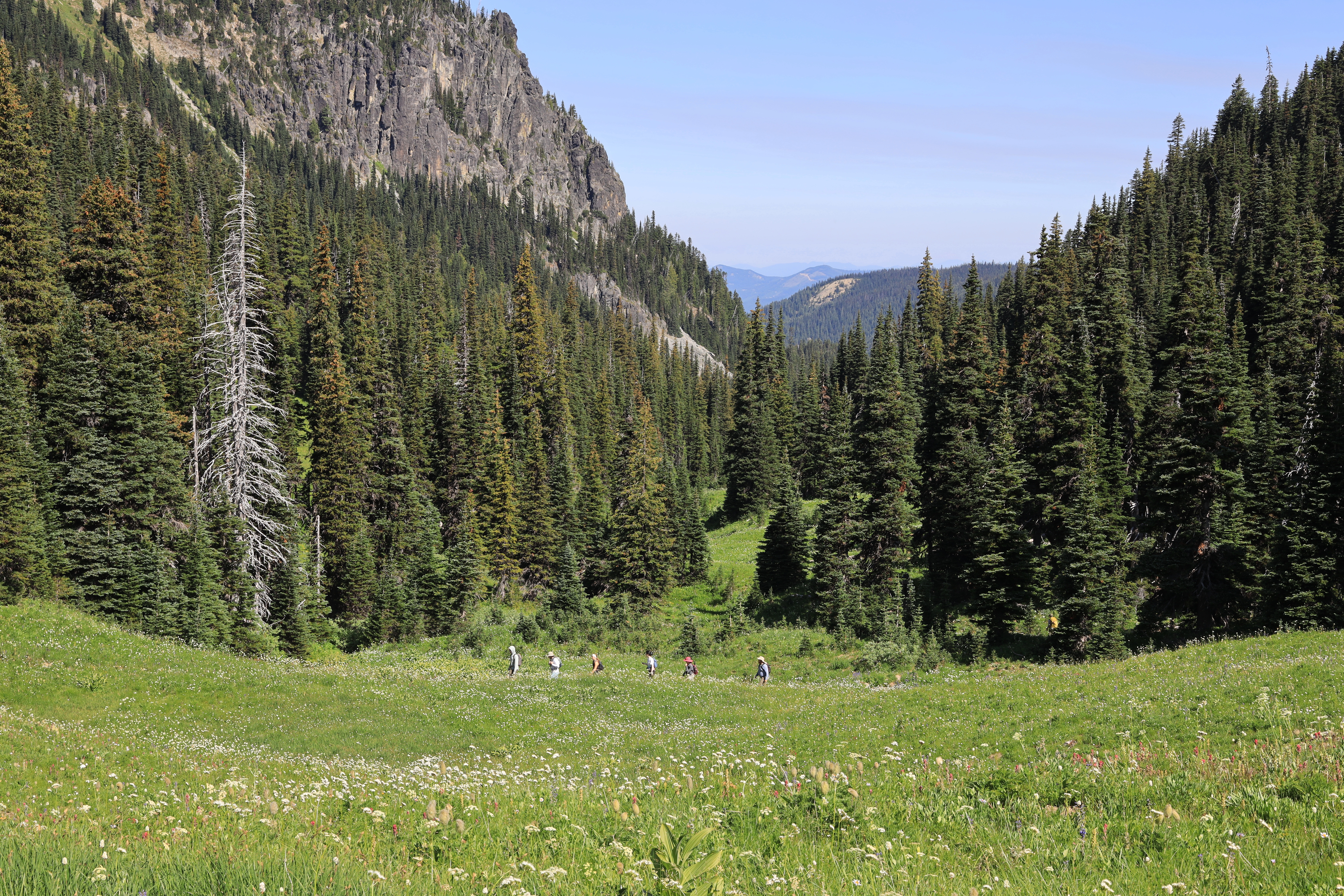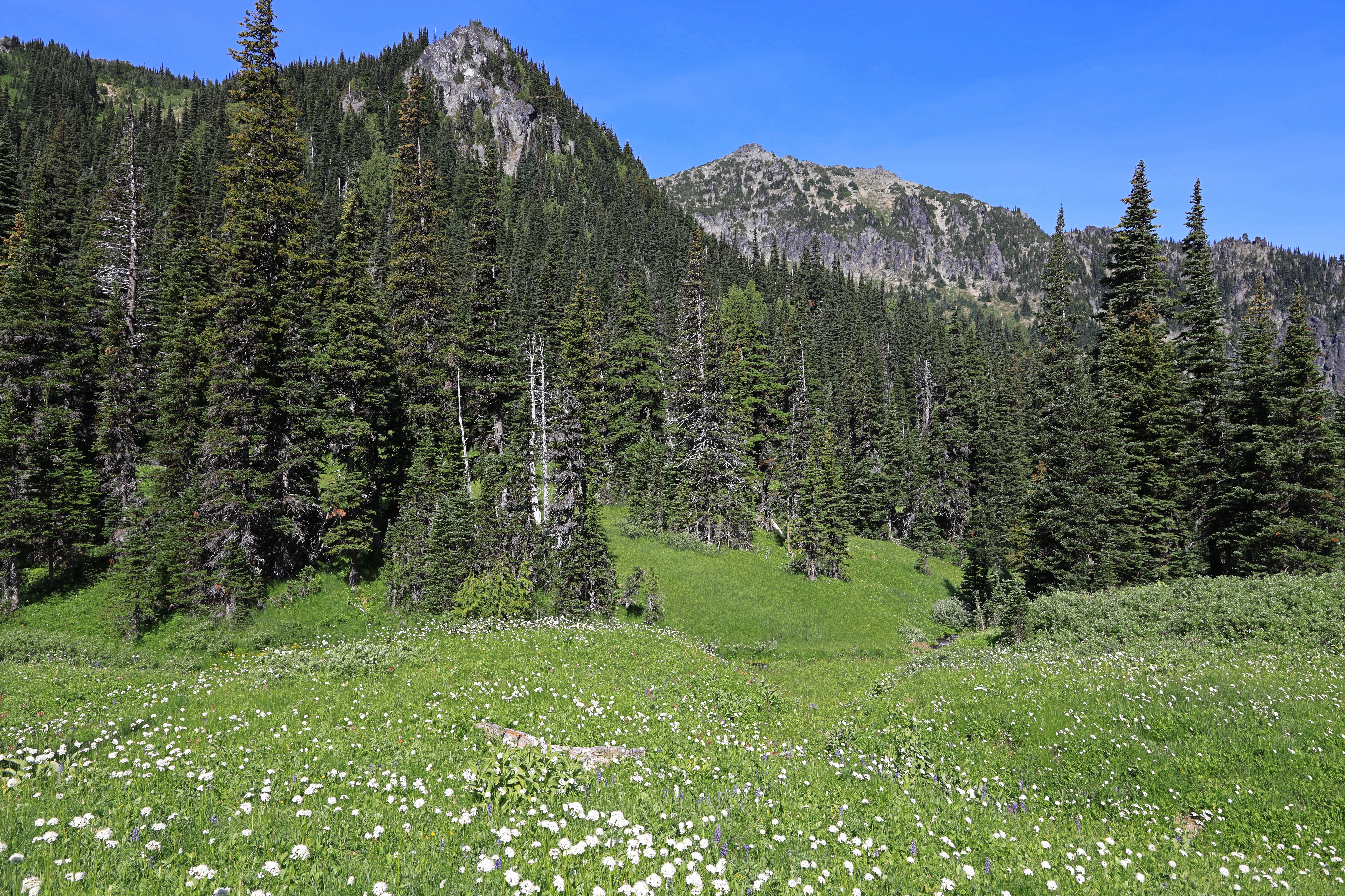 화산이 만든 벌판을 지나면 계곡을 따라 야생화 숲이 이어집니다. 야생화 꽃밭에서 야영하기 좋지만 여기도 검은 곰이 살고 있습니다. 곰도 나름 바쁘고 사람에게는 관심을 주지 않는 것 같지만, 곰을 만났을 때 안전수칙은 주지하세요. 예를 들면 야영하면서 음식물을 멀리 놓고, 곰을 놀라게 하지 말고, 곰과 눈을 마주치거나 뒤로 돌아 도망가지 마세요.