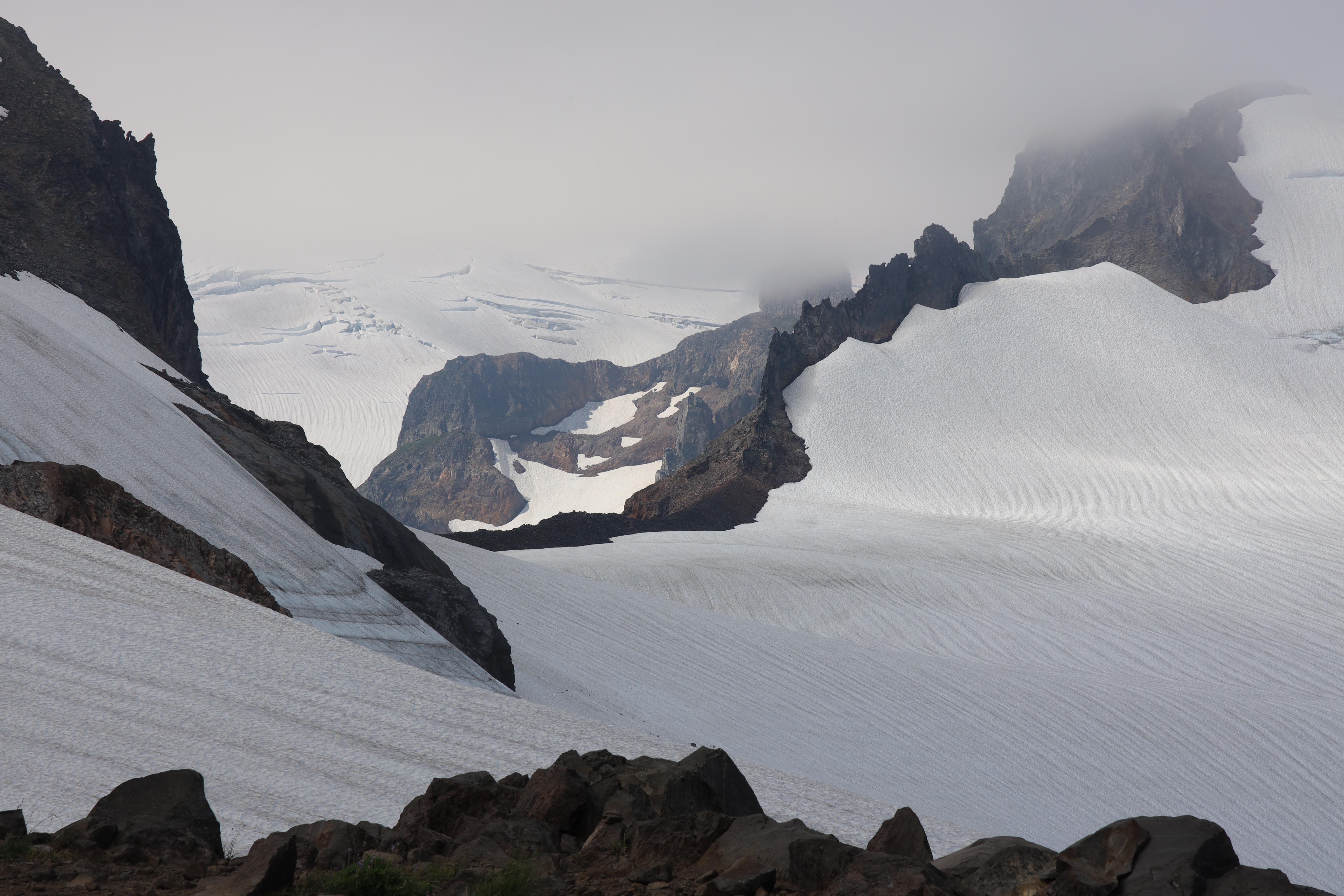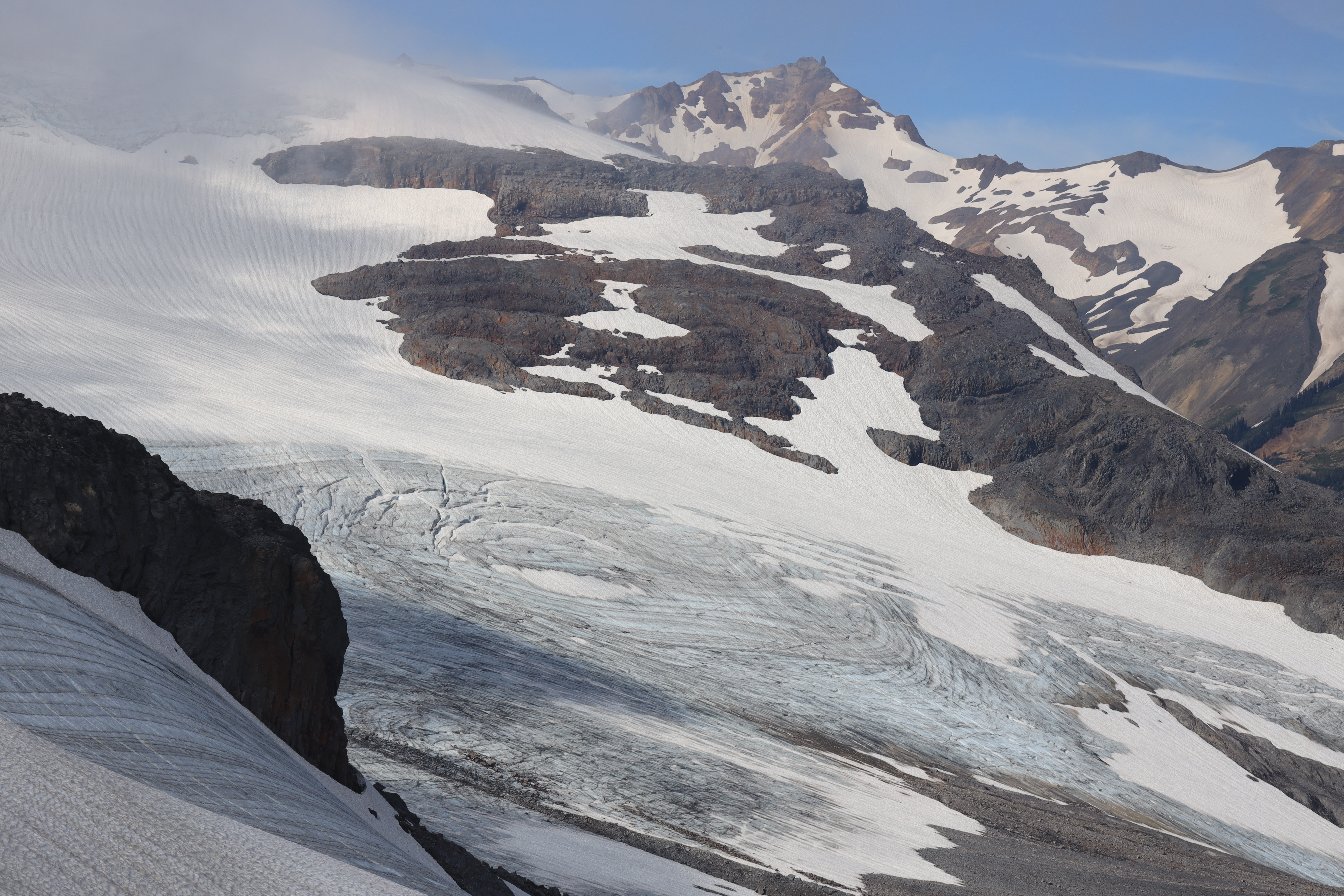 빙하를 건너온 바람이 냉기를 몰고 와서 배낭에서 재킷을 꺼내 입었습니다. 광풍에 눈 날리던 어느 여름날에 베이커산 동쪽 봉우리 (The Portals East)를 올랐습니다. 이 등산로는 베이커 산 정상을 오르는 Park Glacier Route로 이어집니다.