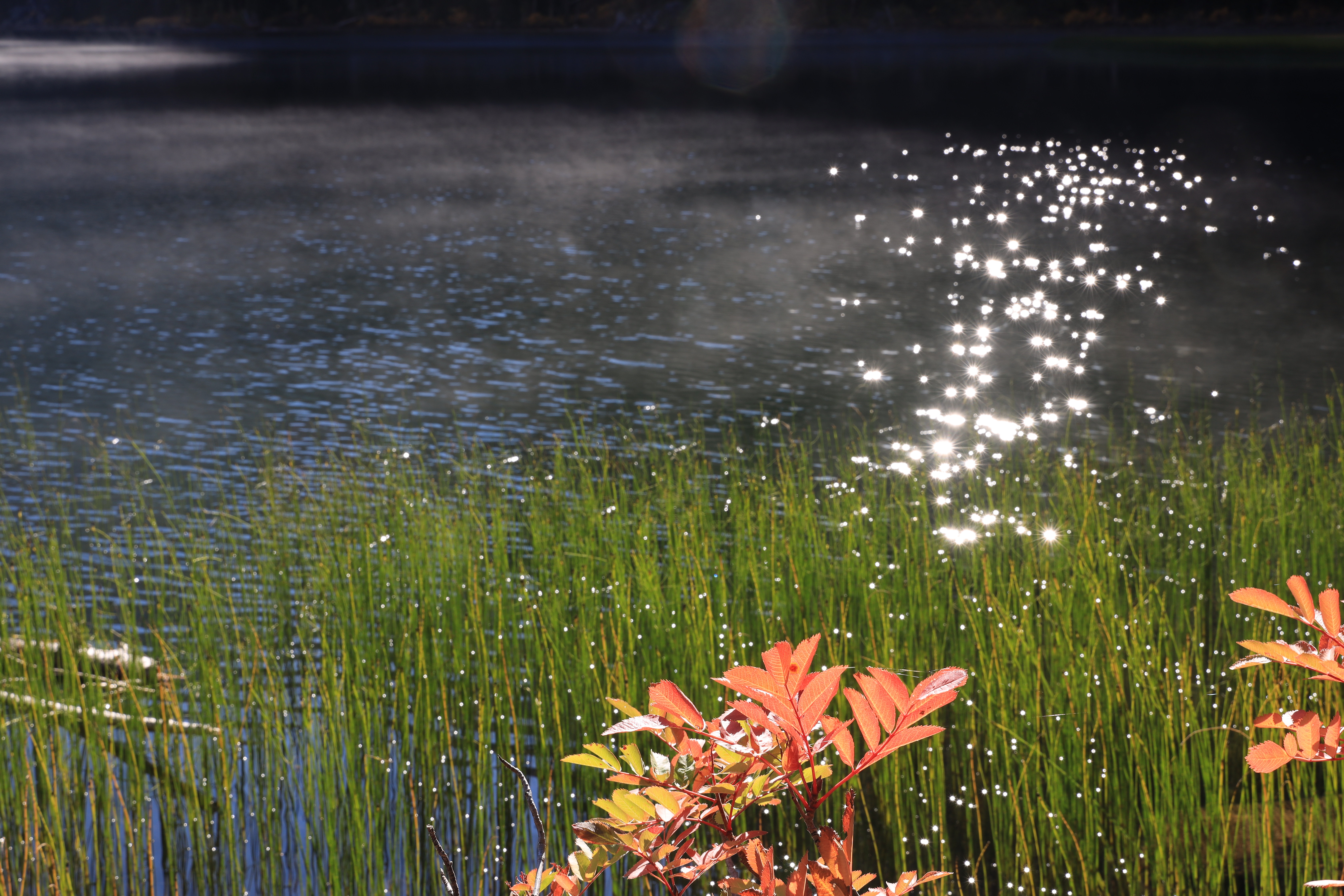점심을 먹는데 이제야 산 봉우리 너머에서 햇볕이 들어옵니다. 그런데, 햇빛이 들면서 물안개가 조금 피어오르고 역광과 산불 연기가 몽환적인 분위기를 만들었지만, 밝기 차이가 워낙 심해서 사진은 삼각대가 없이 더 이상은 어려웠습니다. (해가 더 높이 올라갈 때까지 기다리면 되겠지만 귀갓길이 멀어요.)