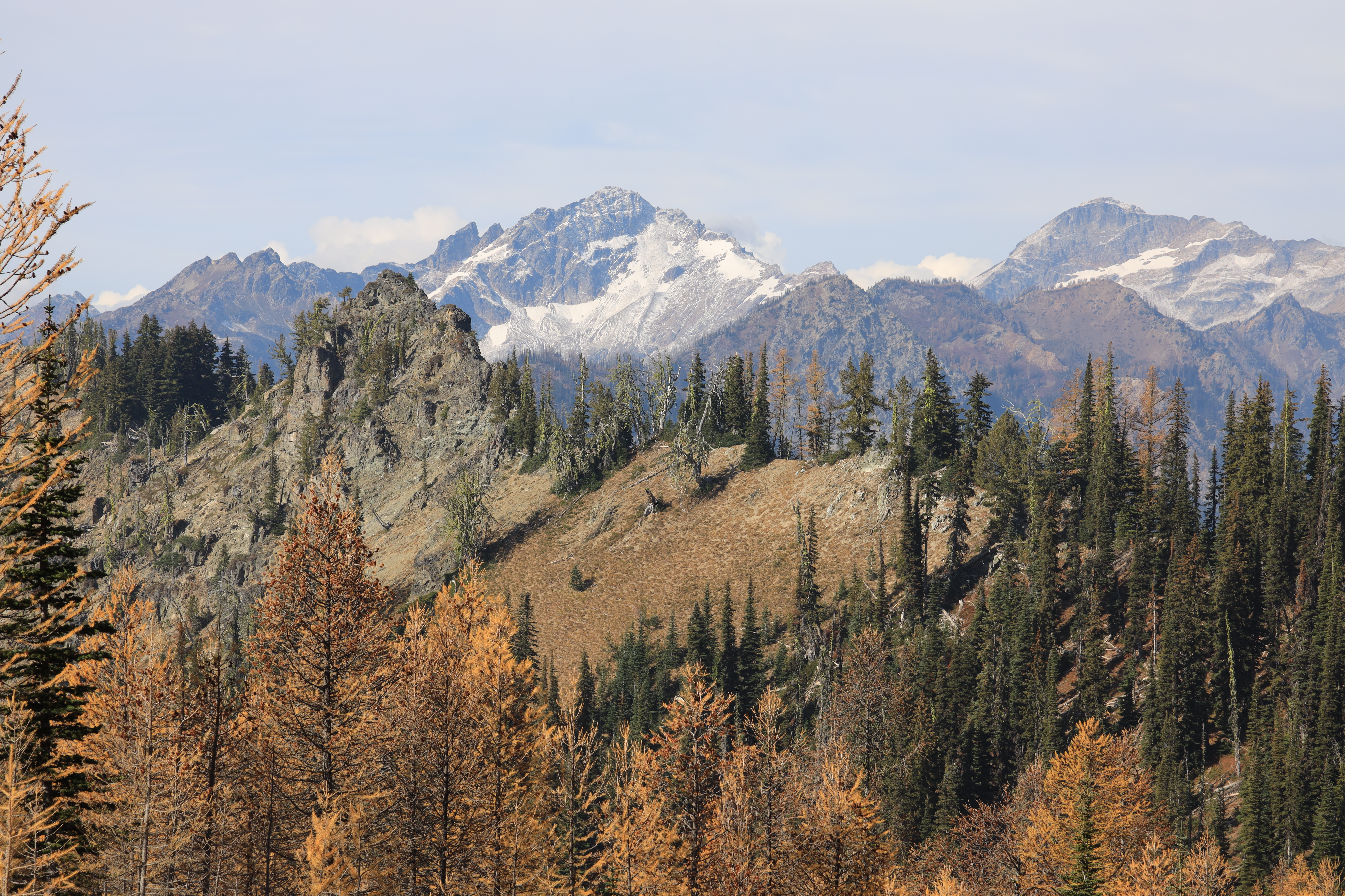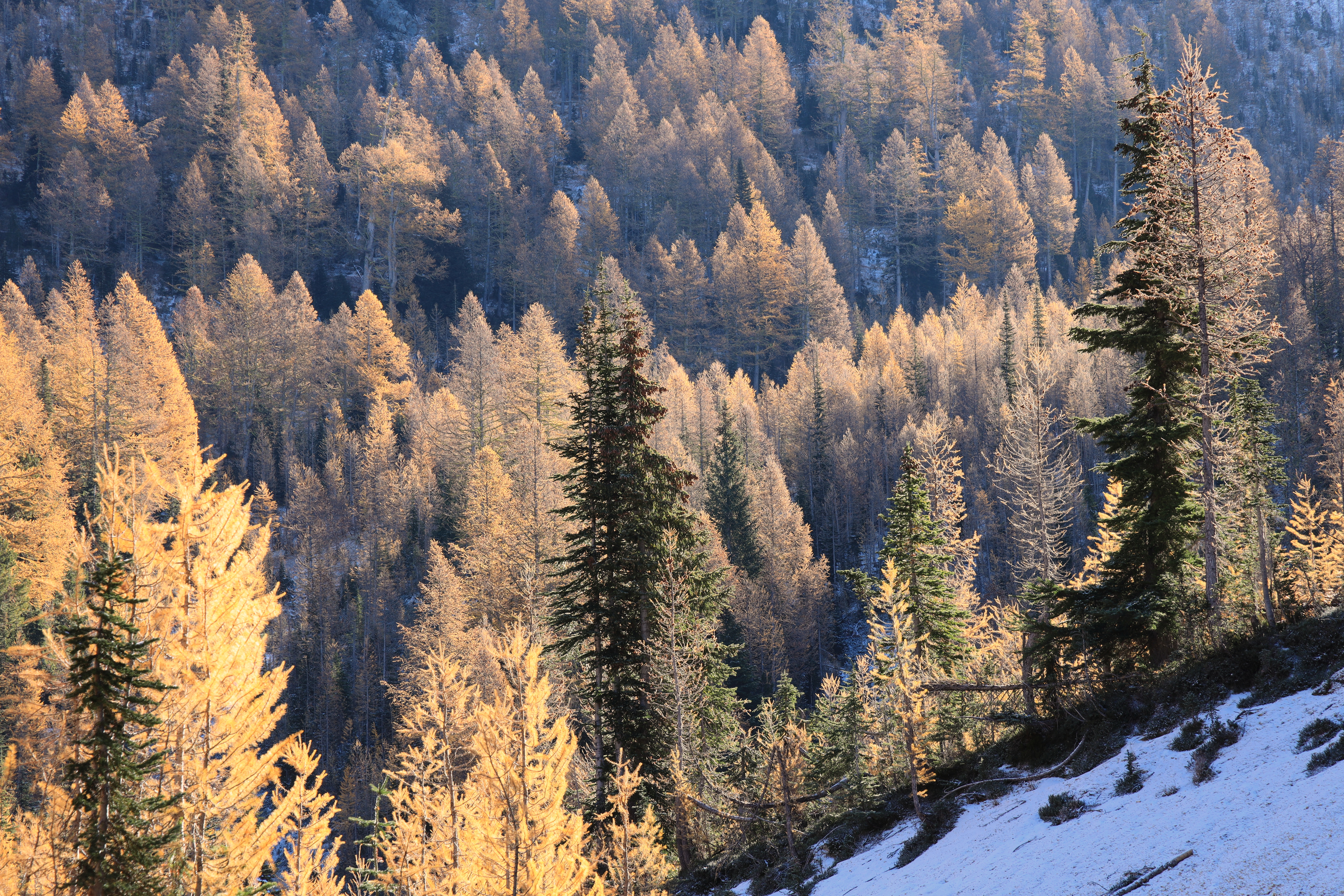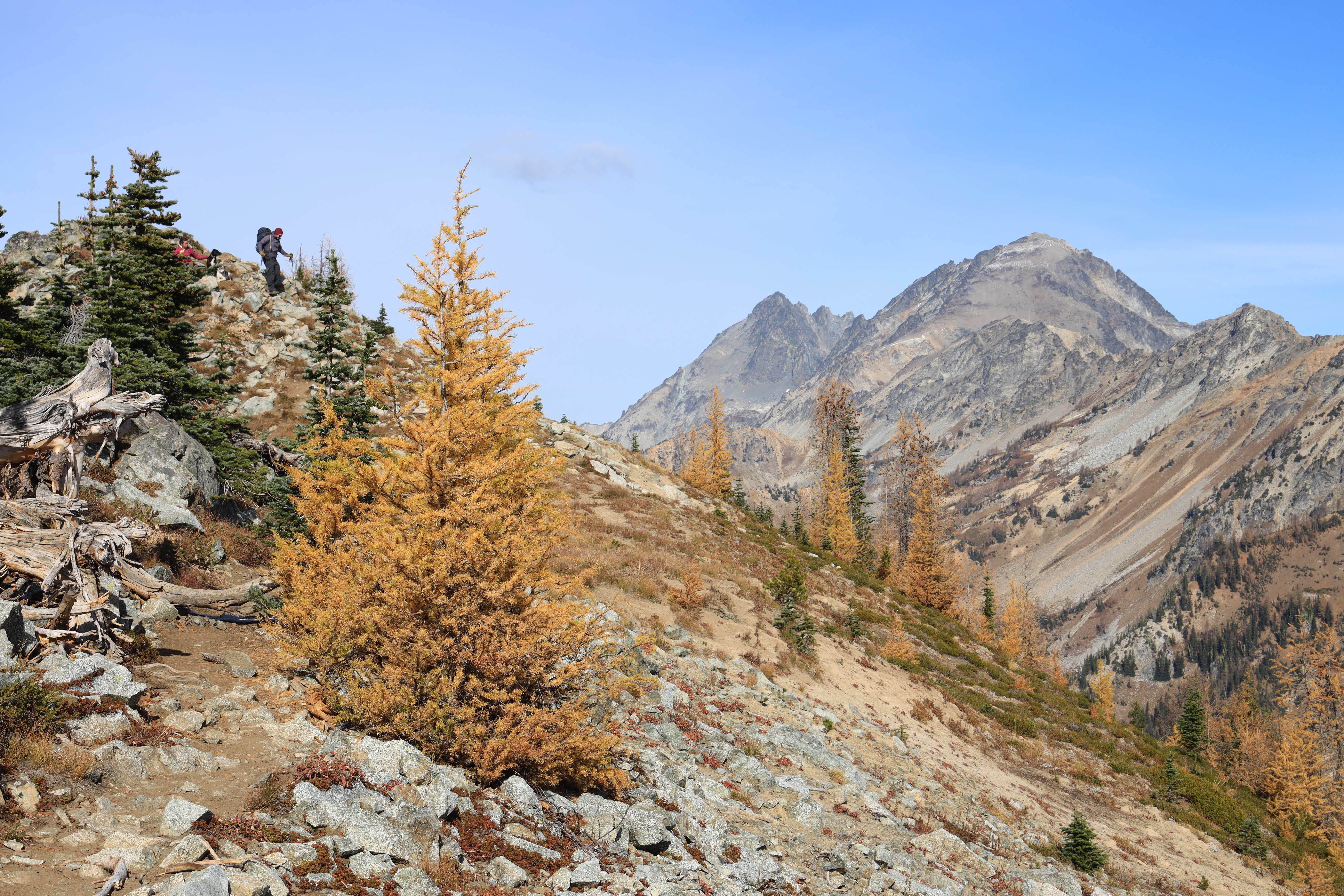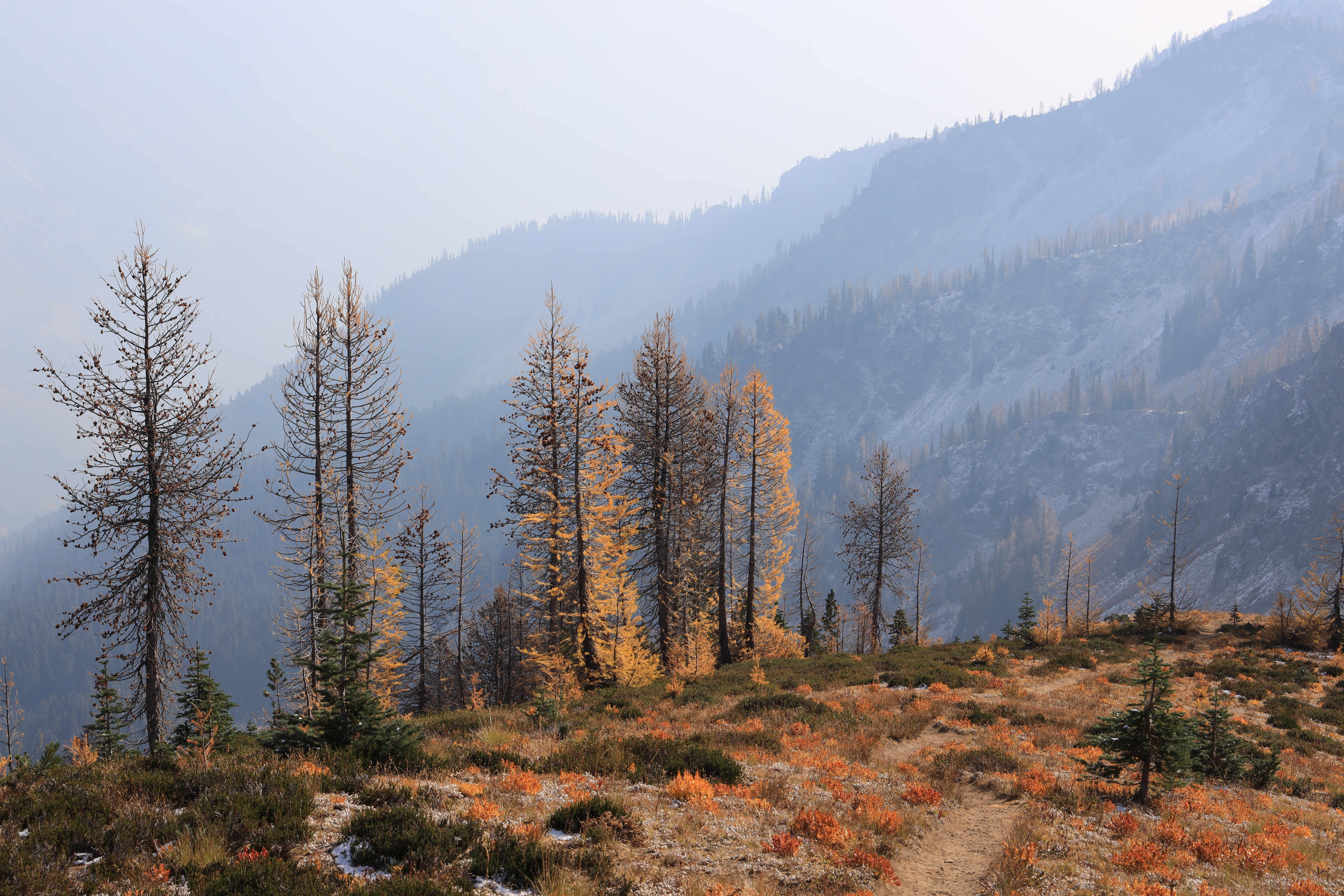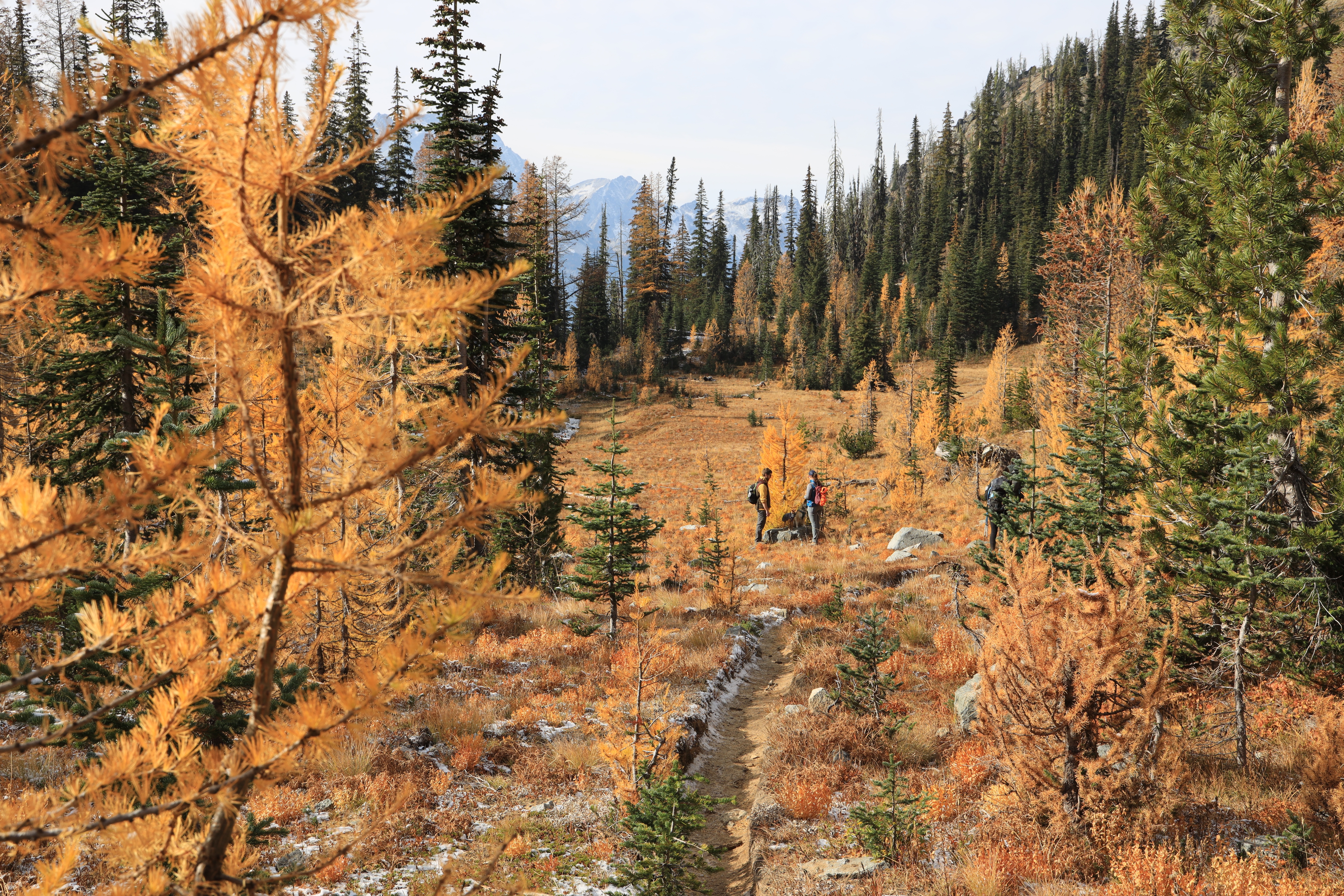 가파른 숲길을 올라 Carne Basin Camp에 도착하면 전망이 열리면서 소나무 단풍 (Yellow Larches)을 만나게 됩니다.