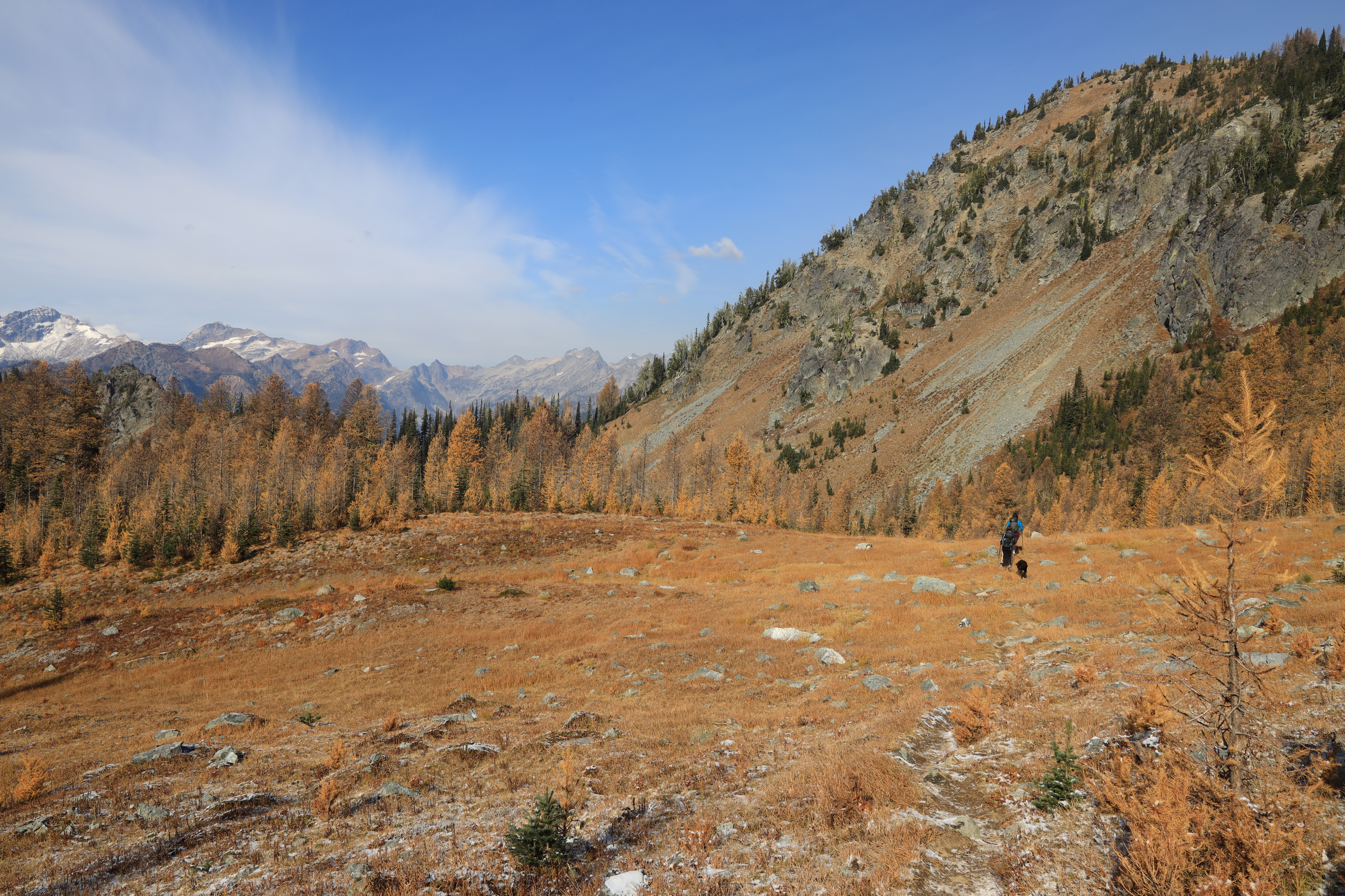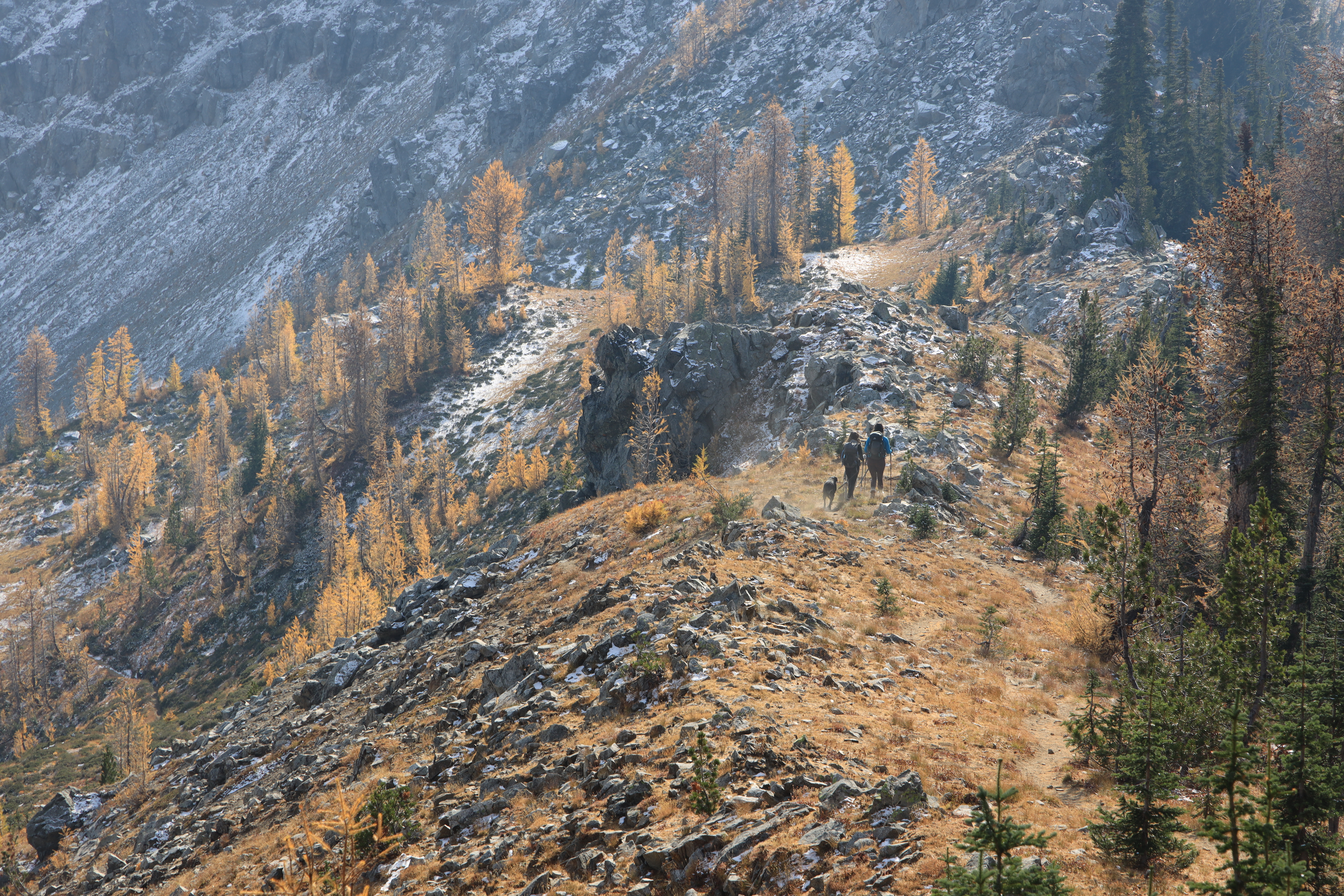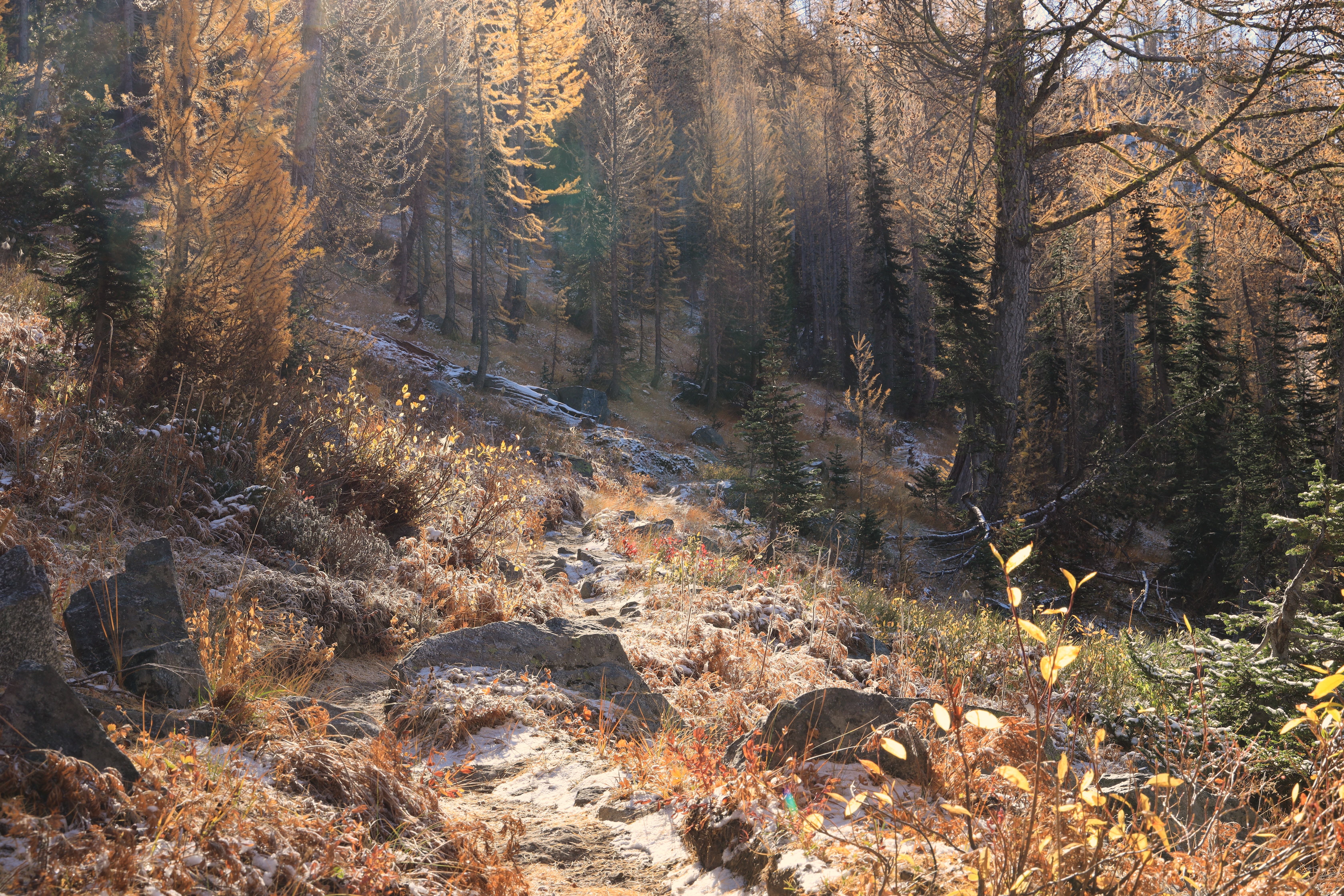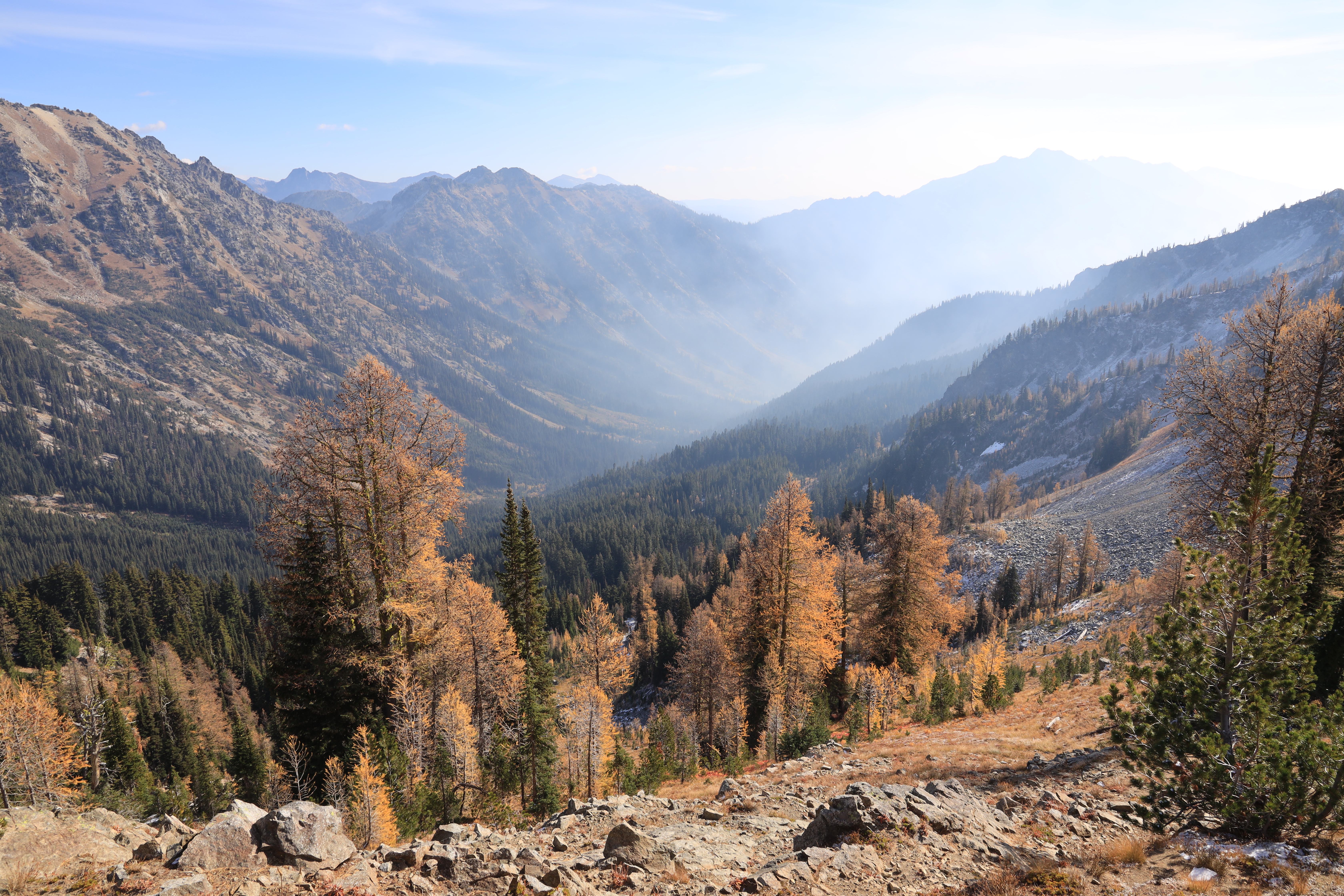 가파른 숲길을 올라 Carne Basin Camp에 도착하면 전망이 열리면서 소나무 단풍 (Yellow Larches)을 만나게 됩니다.