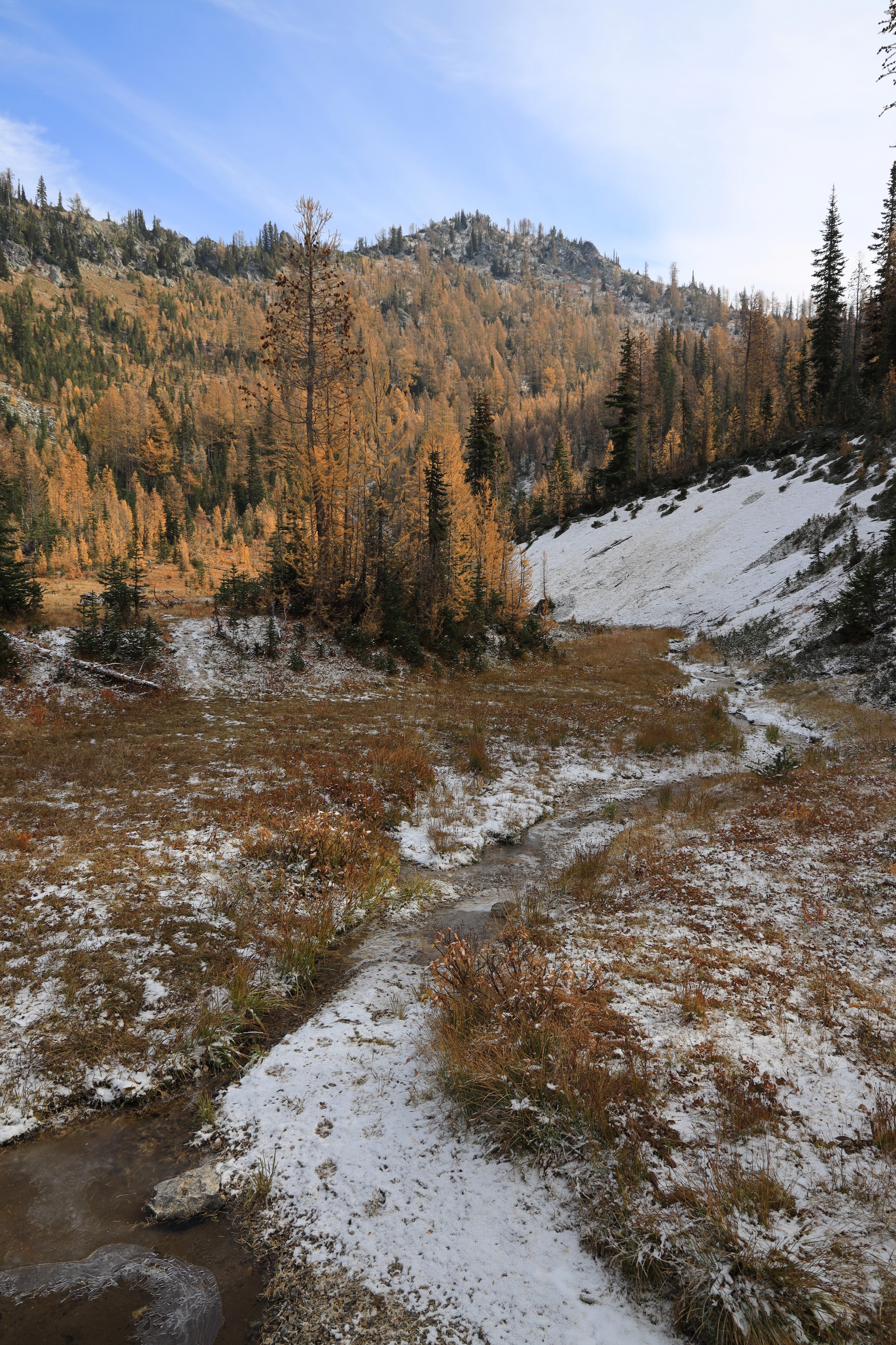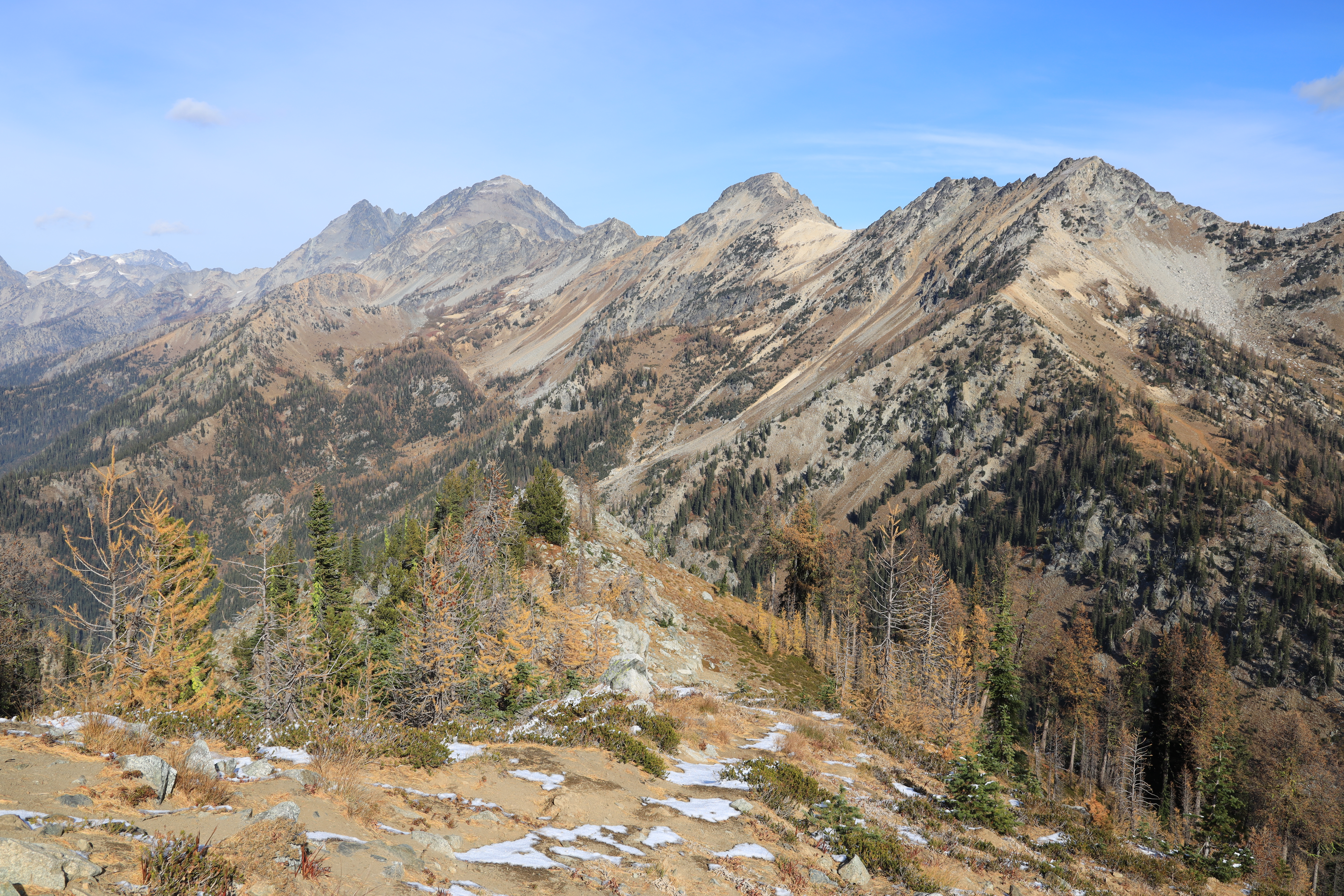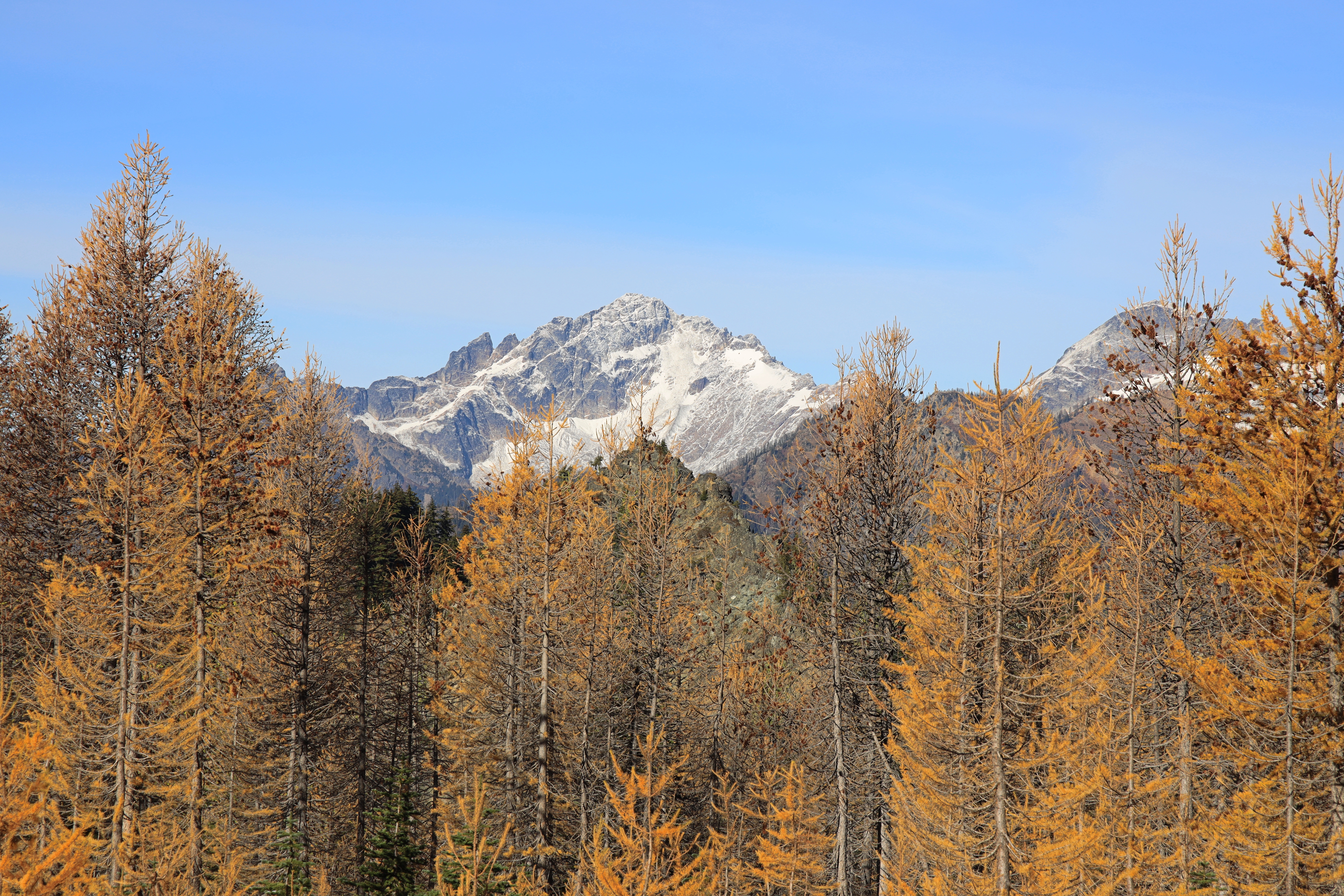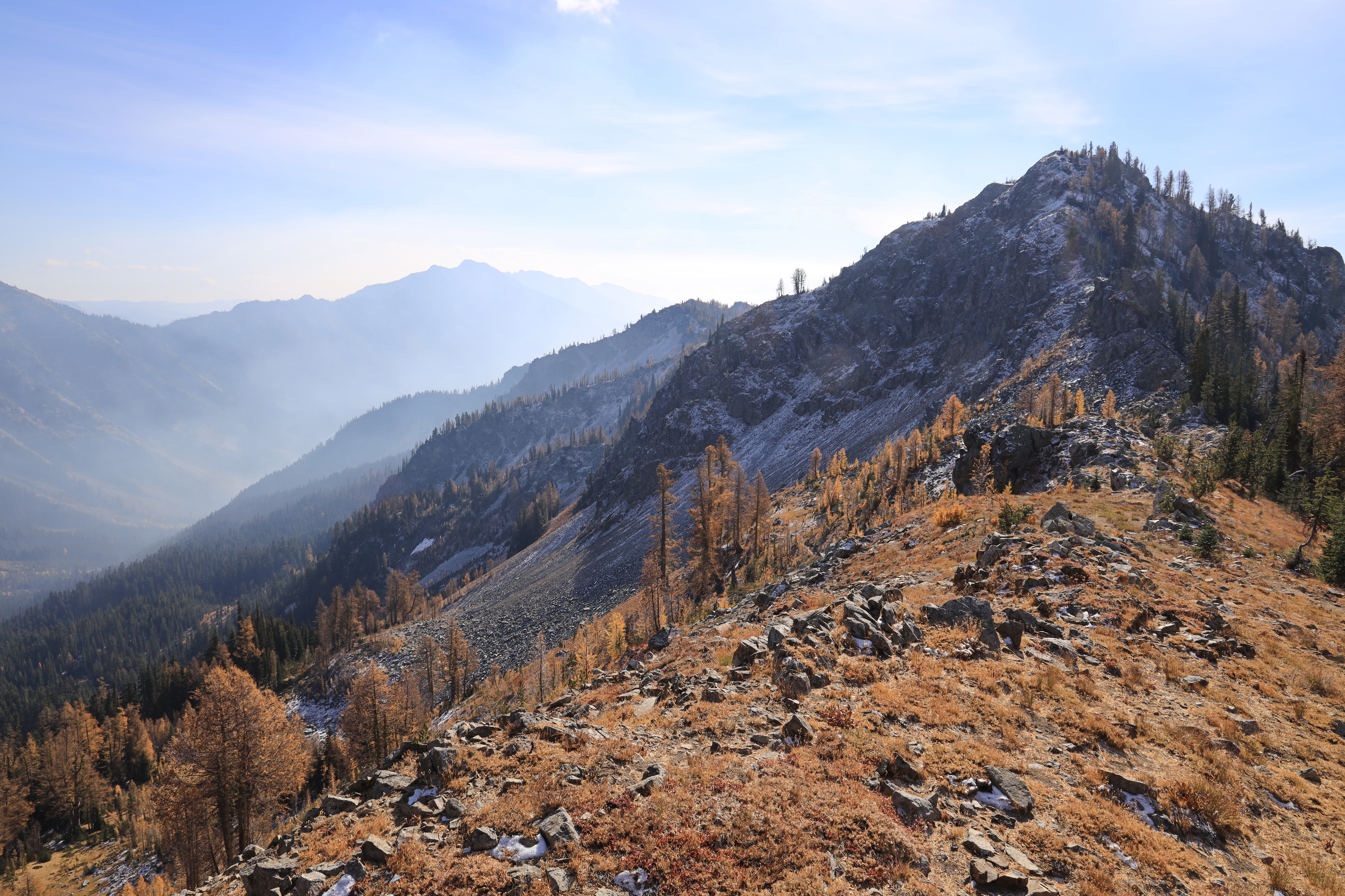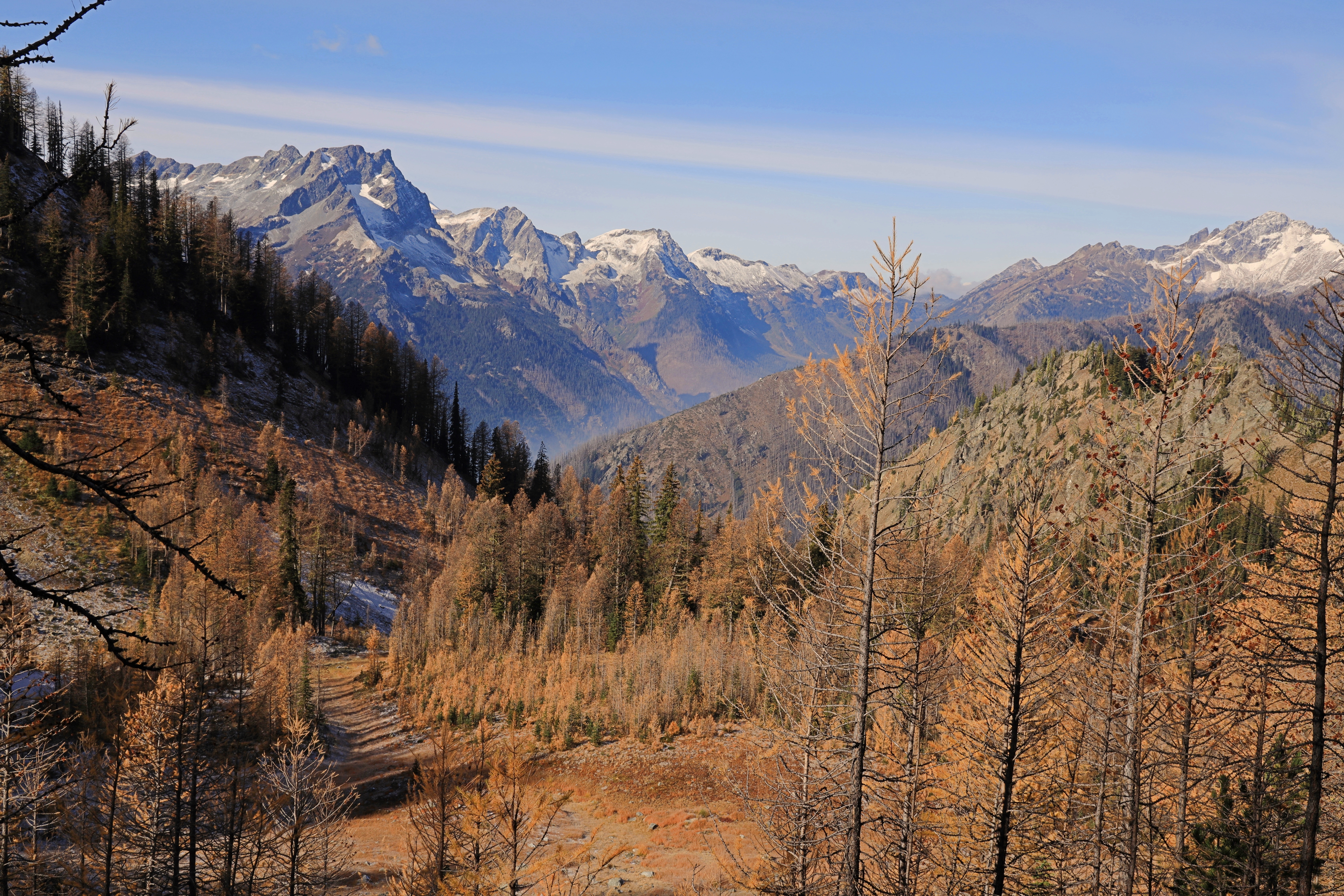 가파른 숲길을 올라 Carne Basin Camp에 도착하면 전망이 열리면서 소나무 단풍 (Yellow Larches)을 만나게 됩니다.