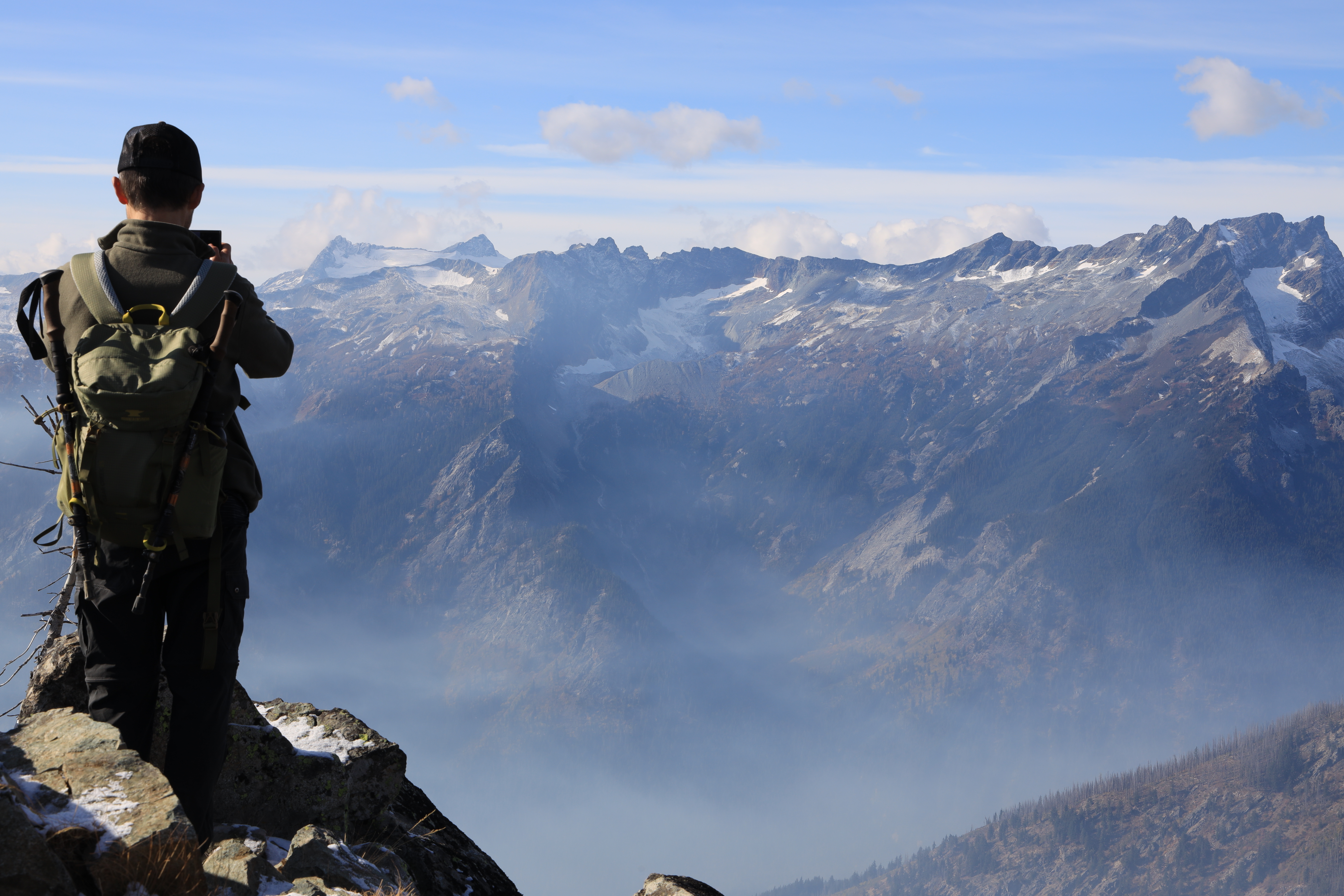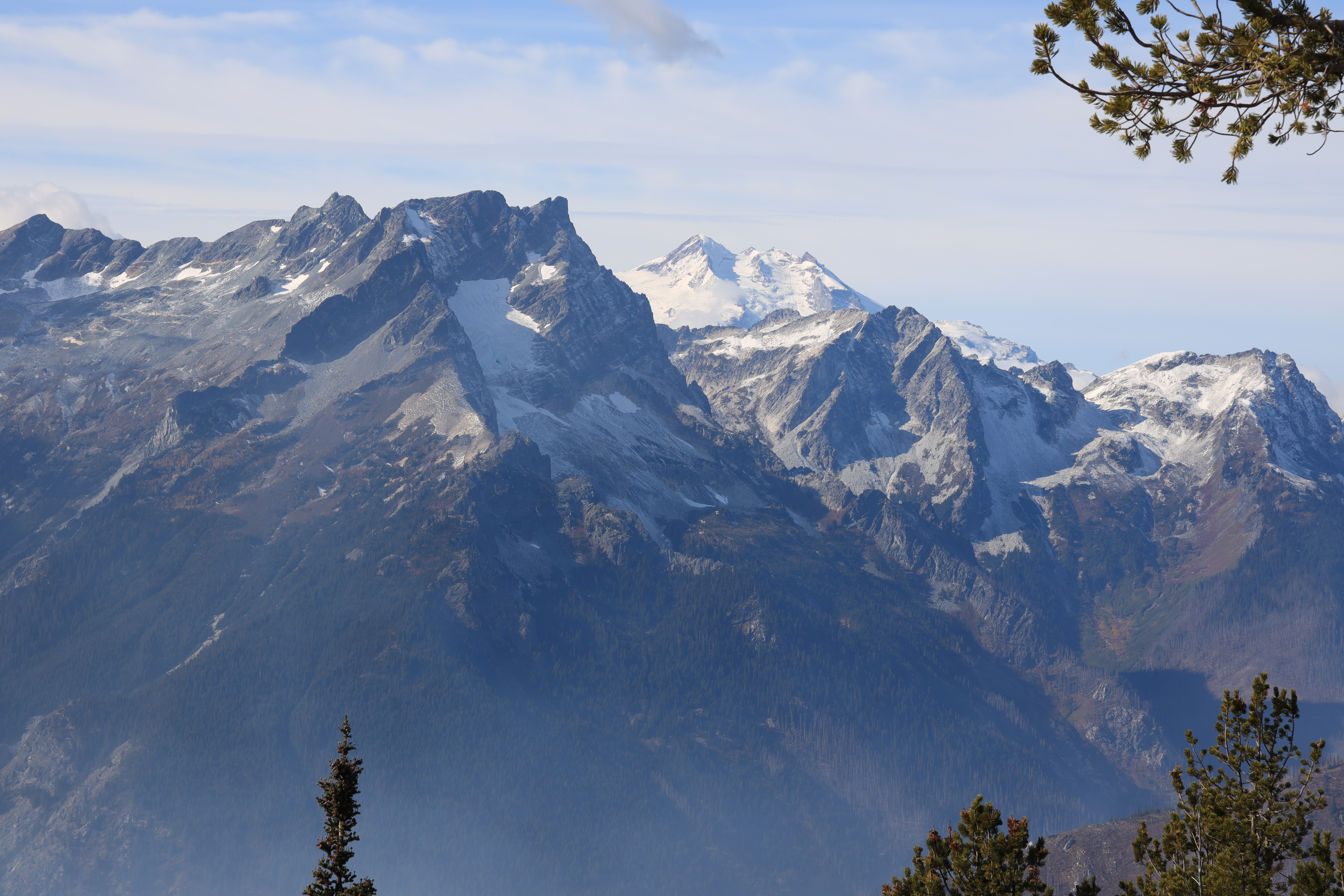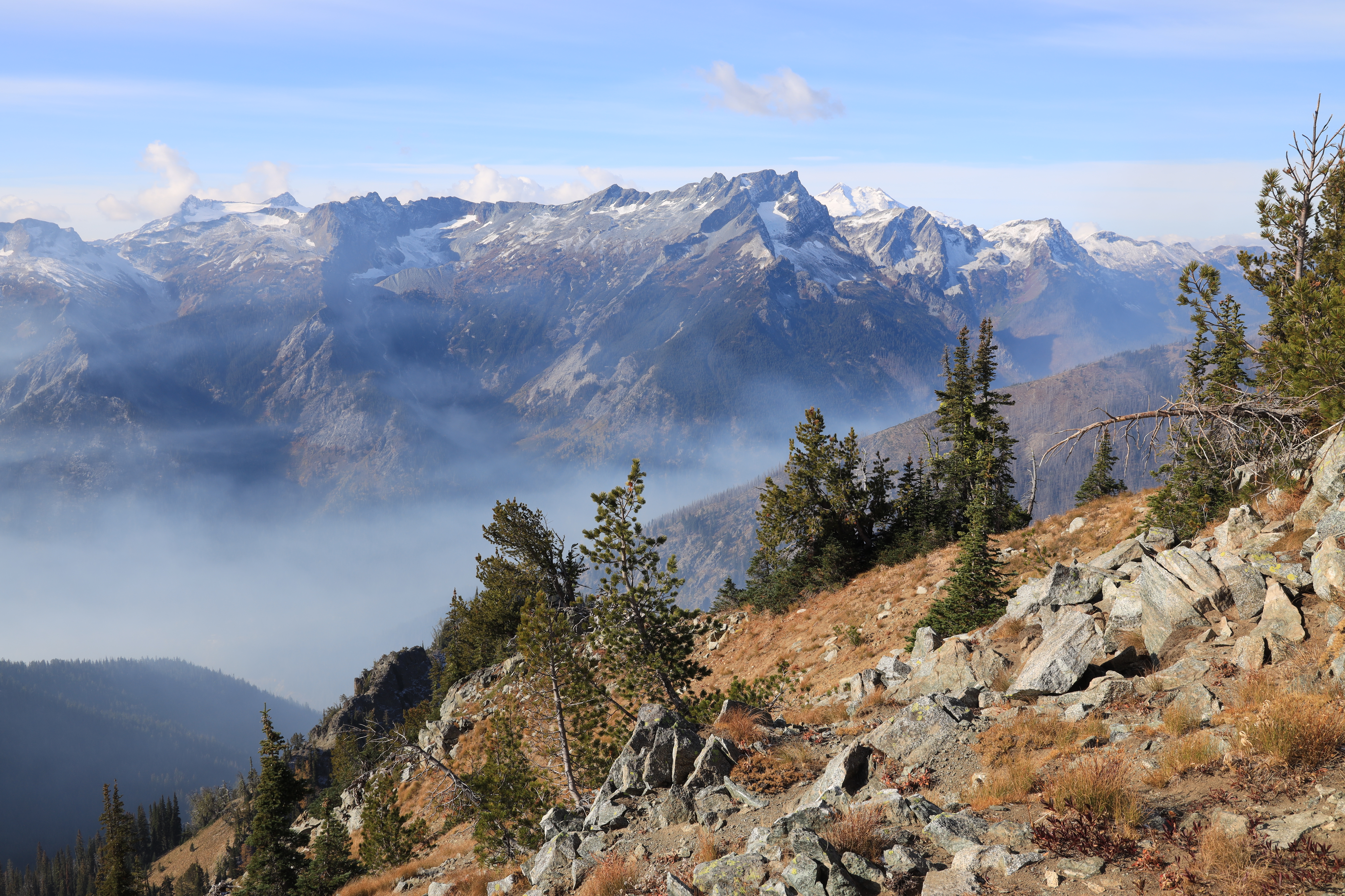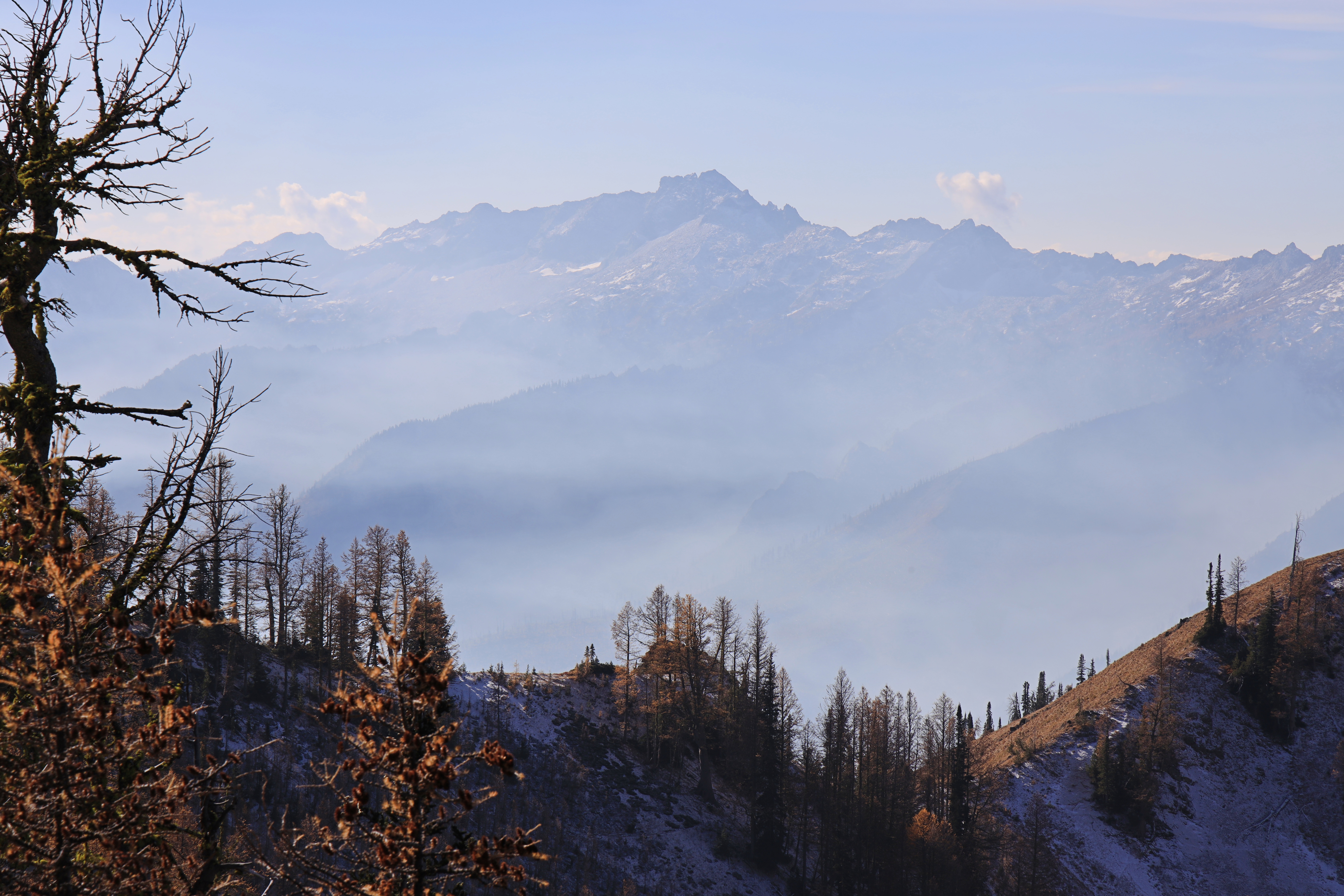 Carne Basin Camp에서 산 정상 오르는 길에 보이는 전망입니다. 산행 전 이틀 동안 비가 와서 캐스케이드 산맥 서쪽 산불은 많이 꺼진 것 같은데 이곳 (캐스케이드 산맥 동쪽)은 산맥 때문에 비가 조금 왔나 보네요. 산악도로를 지나는데 연기 냄새가 났고 산을 오르며 보니 바람 방향이 바뀌면서 연기가 계곡부터 차 오릅니다.