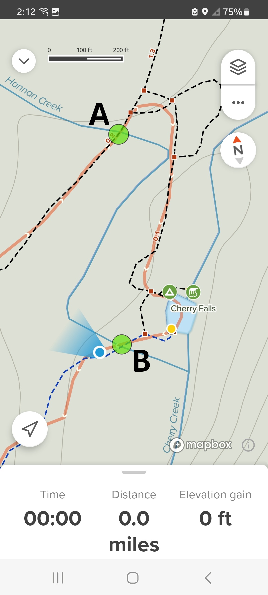산을 오를 때는 윗길로 가서 A 지점 계곡을 건넜습니다. 계곡 물이 불어 어찌할까 궁리하는데 하류 쪽에서 숲을 헤치고 사람들이 나옵니다. 내가 하류 쪽으로 가려니 어떤 분이 '그리 가도 별로 나을 것이 없습니다.'라고 하네요. 빠지면 말고, 그나마 얕은 곳으로 그냥 건넜는데 등산화로 물이 조금 들어옵니다.