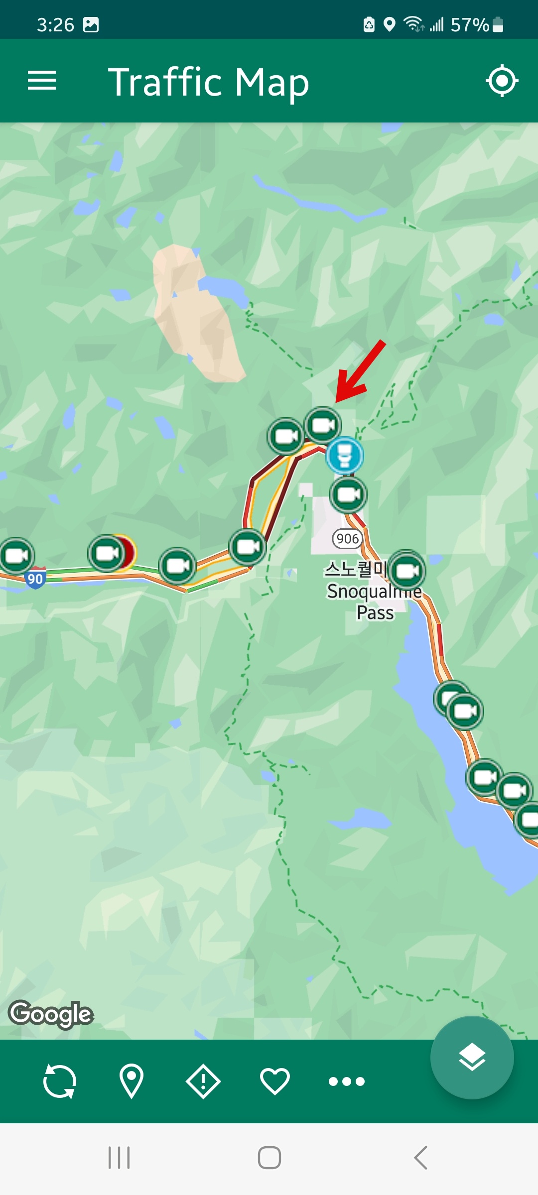 Traffic Map 메뉴에서 스노퀄미 고개 정상에 있는 카메라 (빨간색 화살표)를 즐겨찾기로 선택하였습니다.