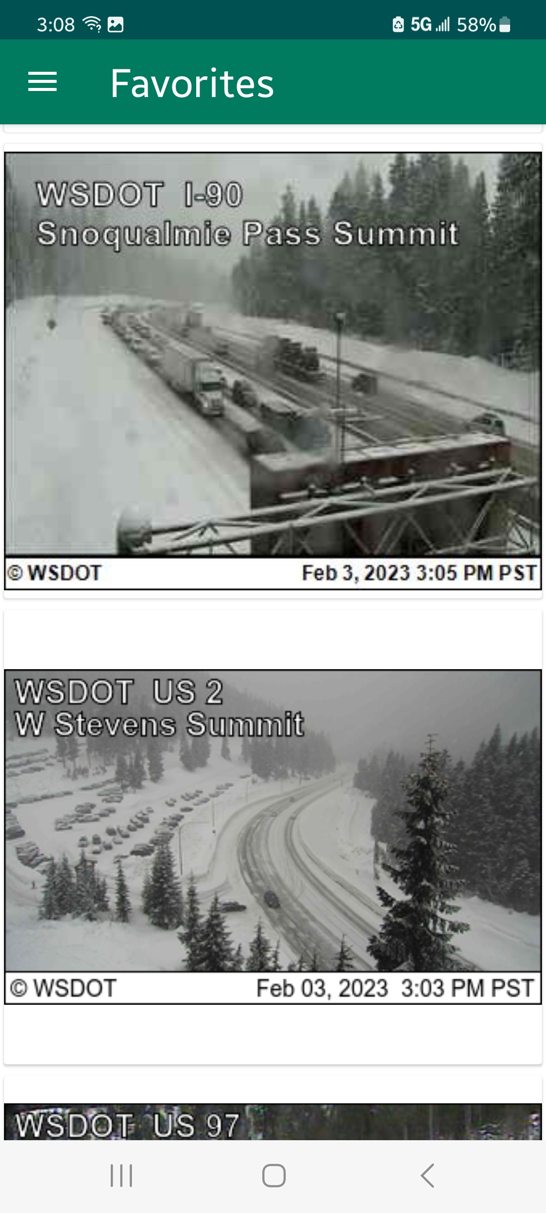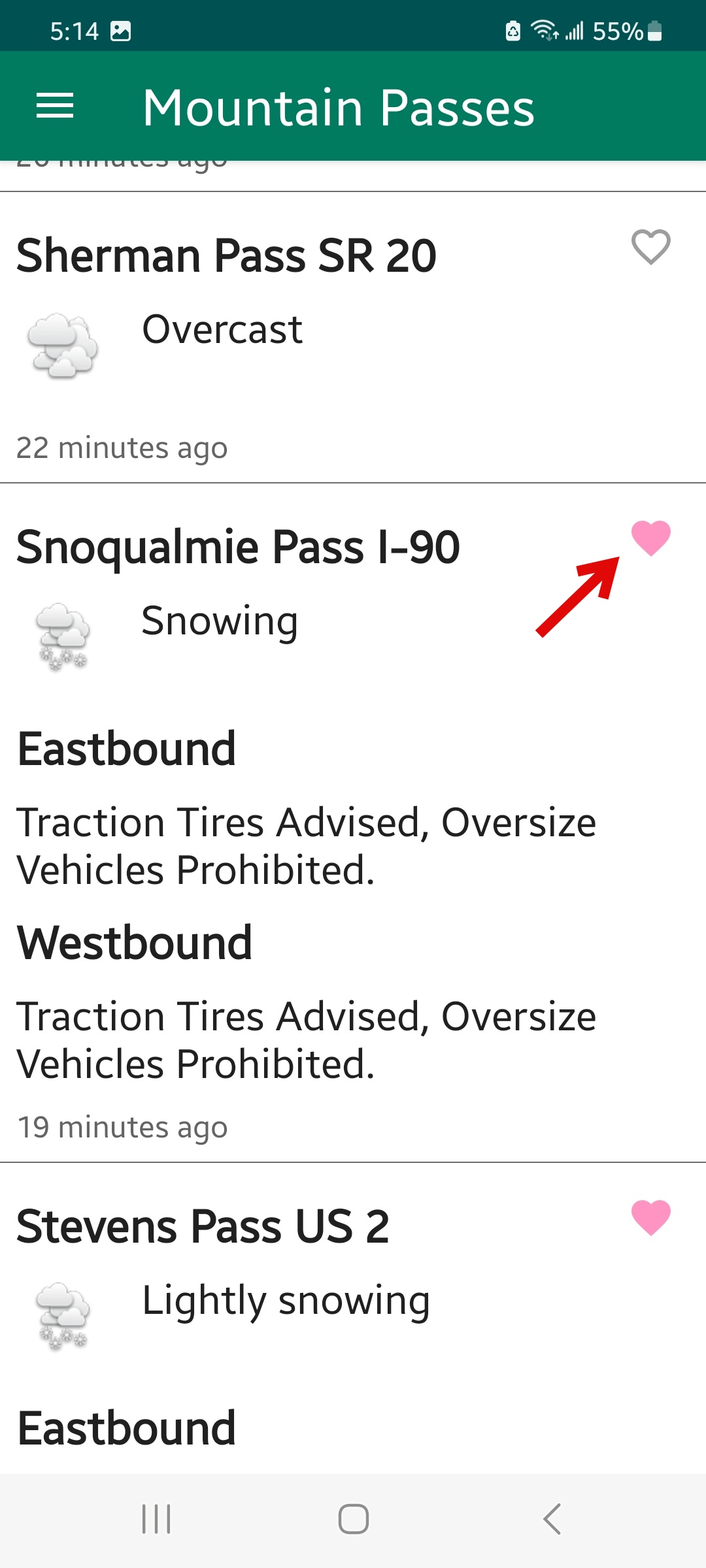 Mountain Passes 메뉴에서 스노퀄미 패스 (빨간색 화살표)와 스티븐스 패스를 즐겨찾기로 선택하였습니다. 즐겨찾기 선택이 다 되었으면 Favorites 메뉴에서 카메라 화면과 경보상황을 한눈에 확인할 수 있습니다.