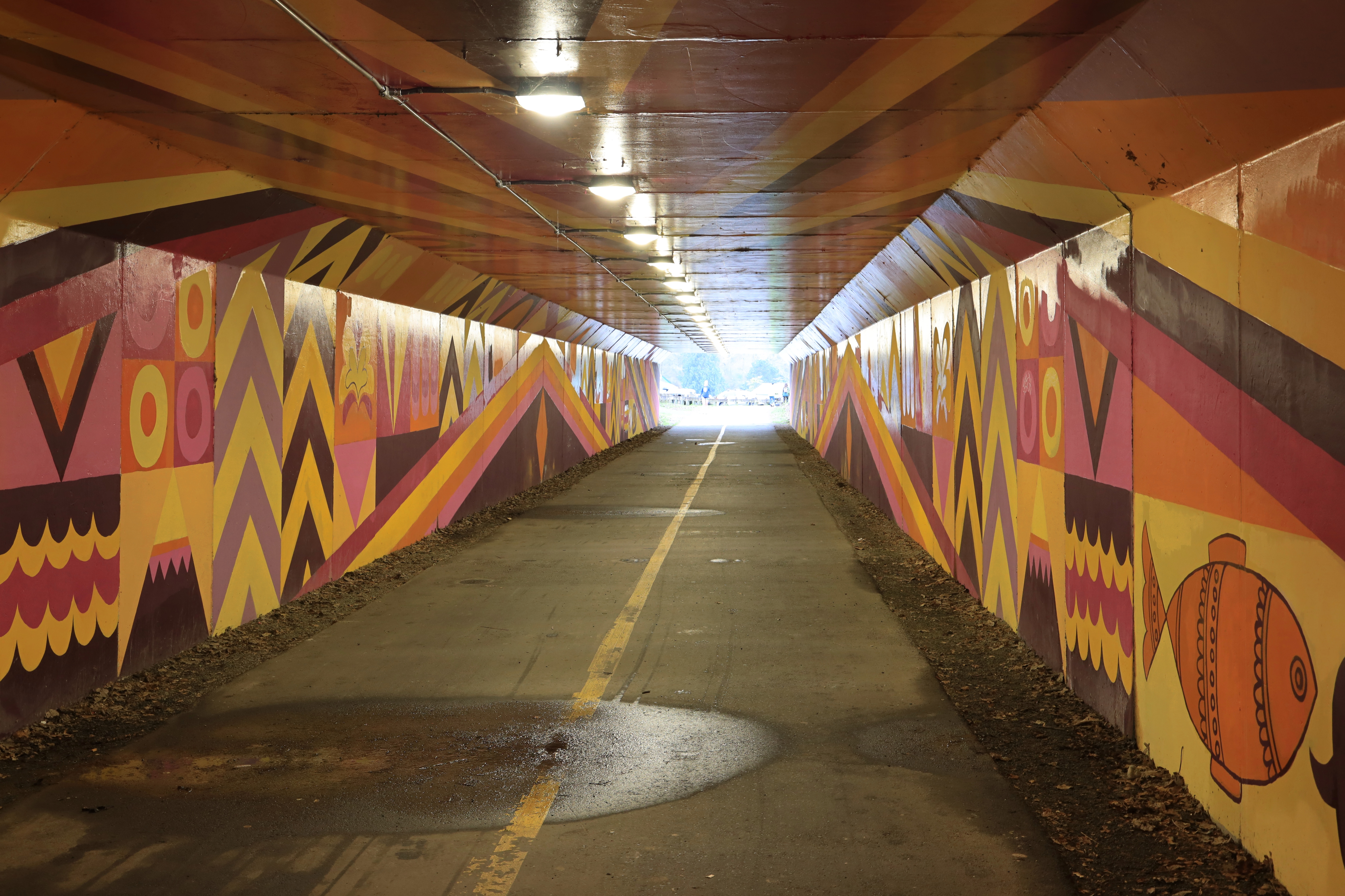 지하도 벽에 그림이 있고 전등을 켜 놓았습니다. 누가 이 지하도를 기증했답니다.