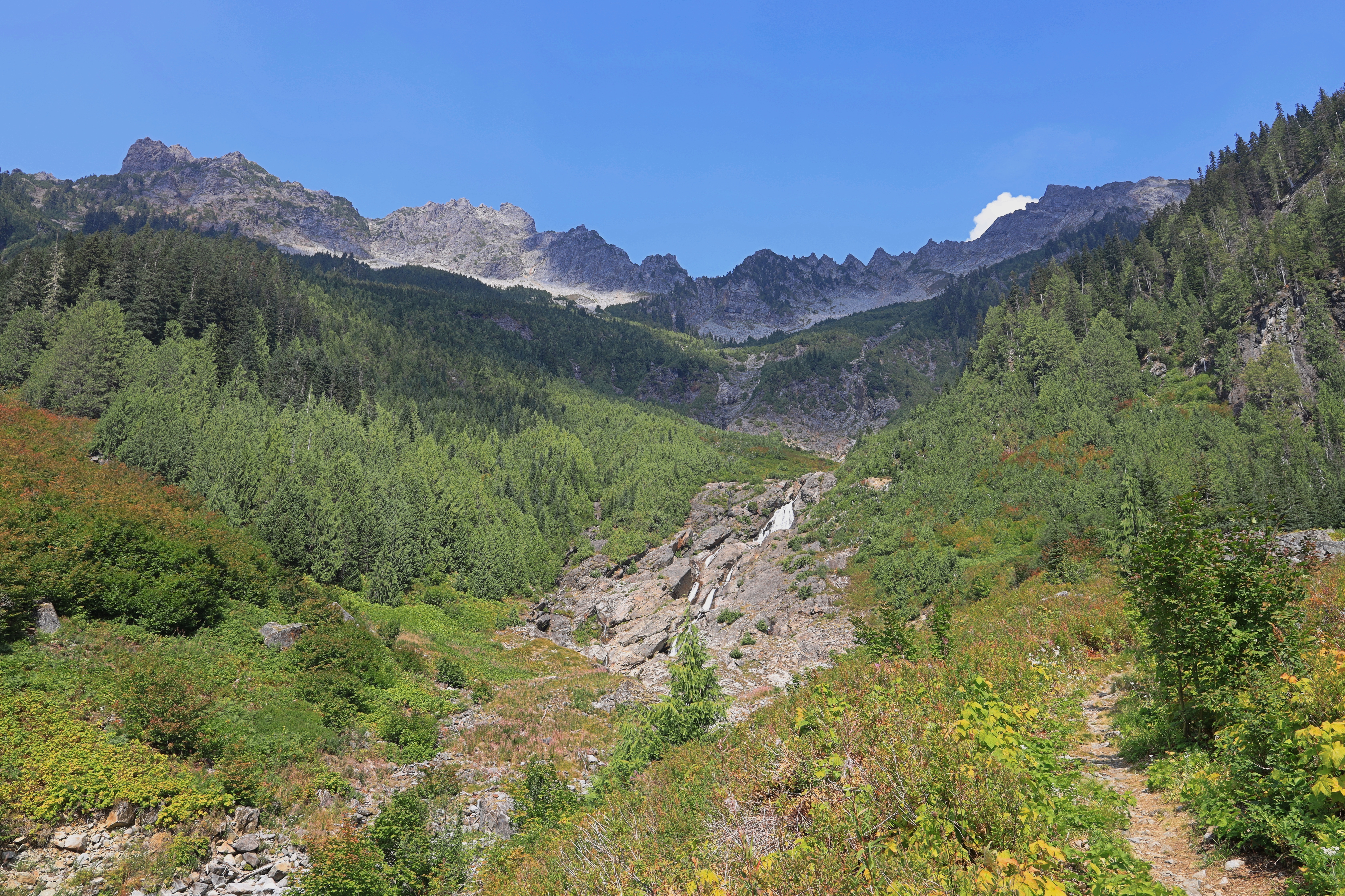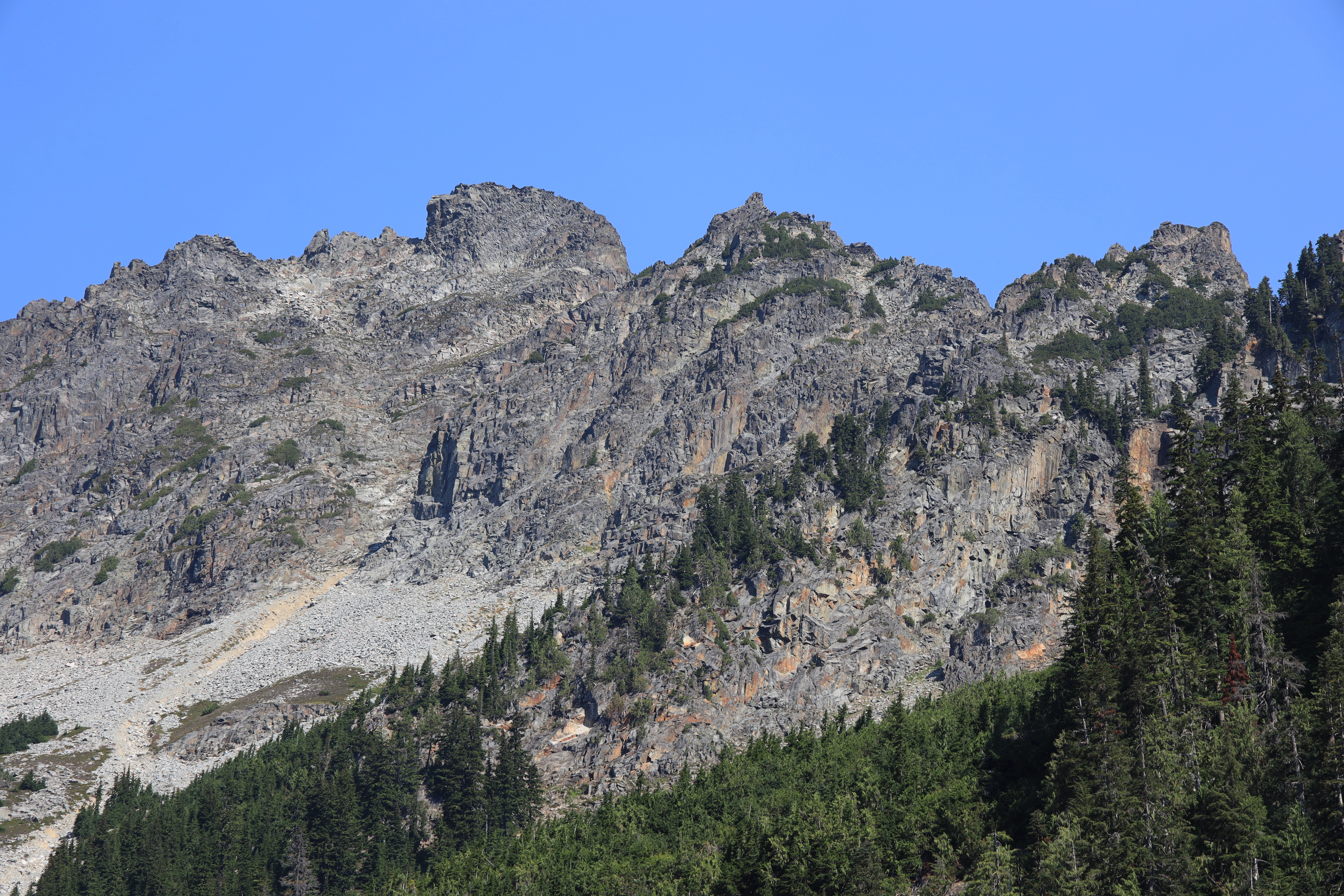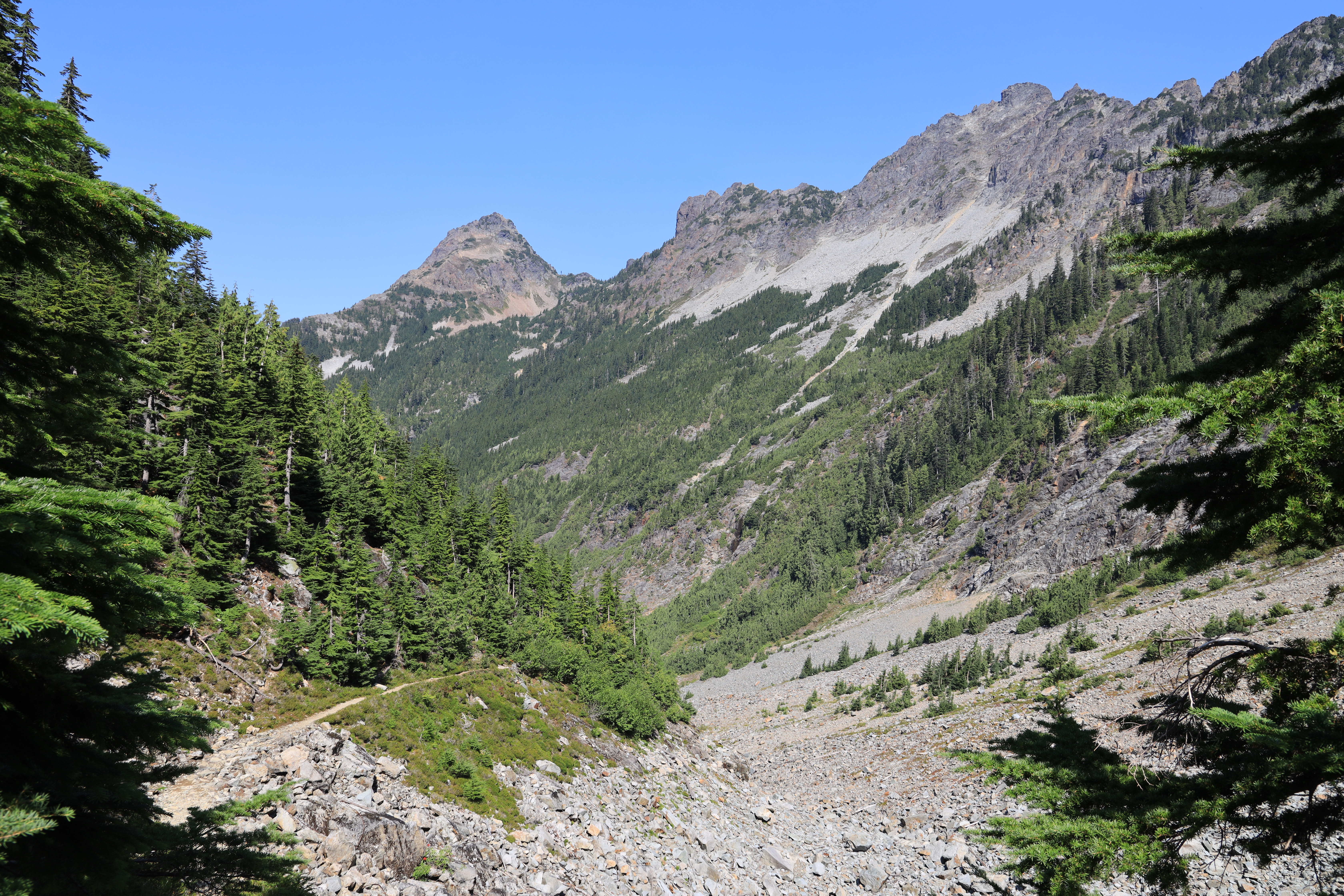 Glacier Basin에서 보는 전망이며 산불연기가 옅게 깔려있어 원경이 흐릿합니다. 왼쪽 봉우리가 Cadet Peak이고 오른쪽은 Monte Cristo Peak입니다. 이쪽은 빙하가 거의 다 녹았고, Monte Cristo Peak을 넘어가면 컬럼비아 빙하가 있습니다