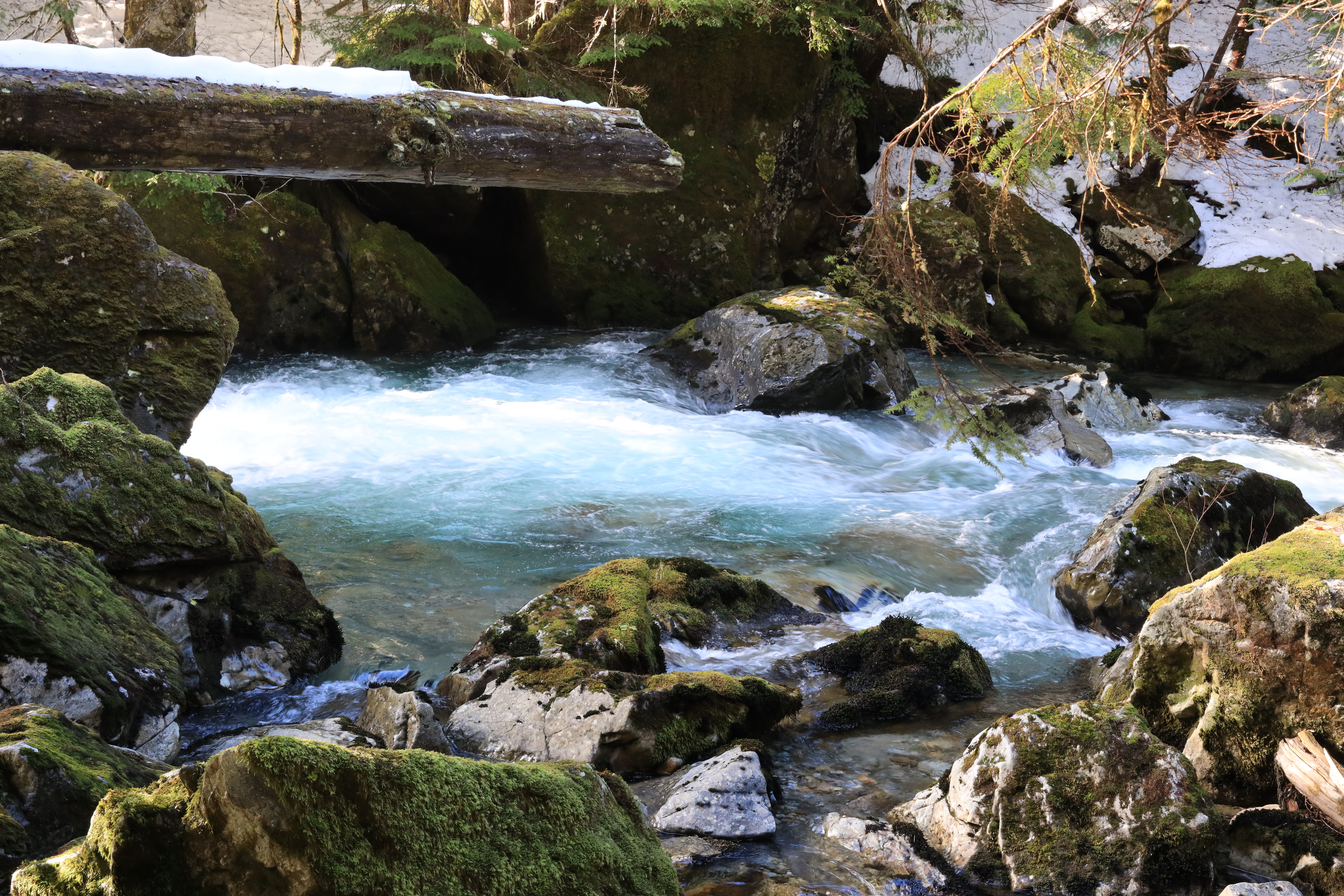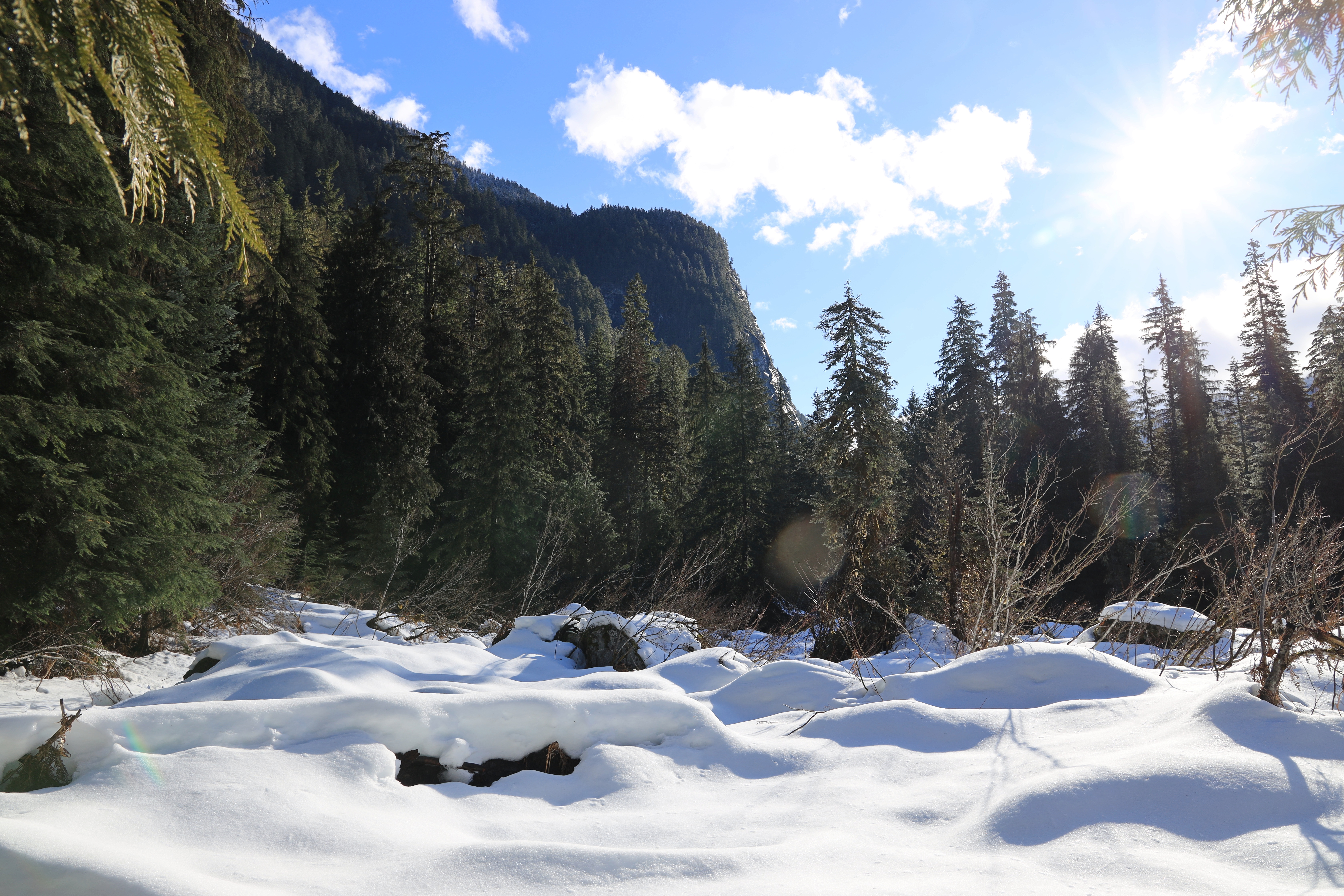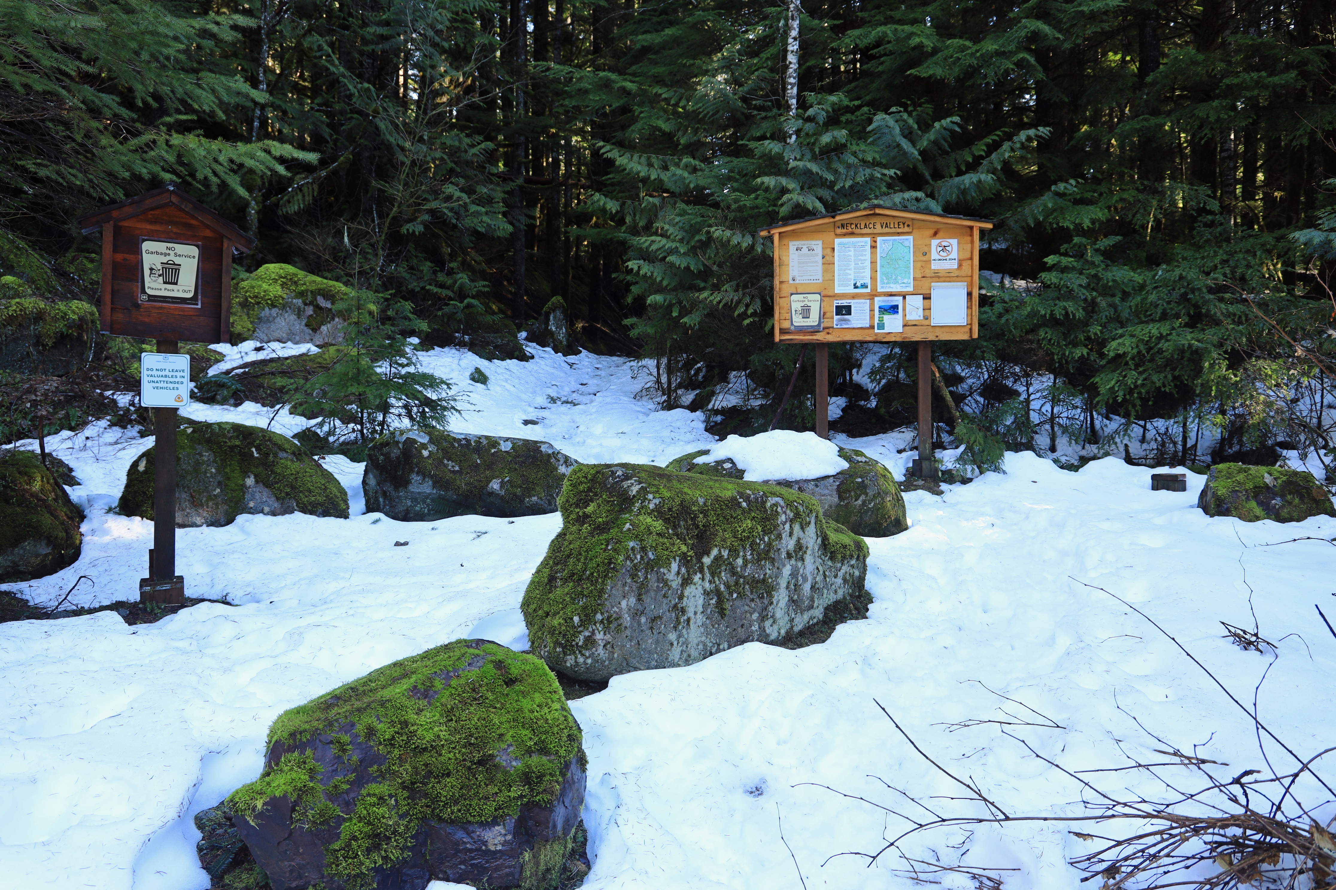 이 근처 산의 최근 산행 리포트가 없어 무작정 눈길산행을 출발하였습니다. 산 아래쪽 기차 철교 (Foss River Bridge)에서 강을 따라 오르려 했지만 눈이 모두 녹았네요. 그런데, 마침 목걸이 밸리 (Necklace Valley)로 가는 산악도로가 열려 있습니다.