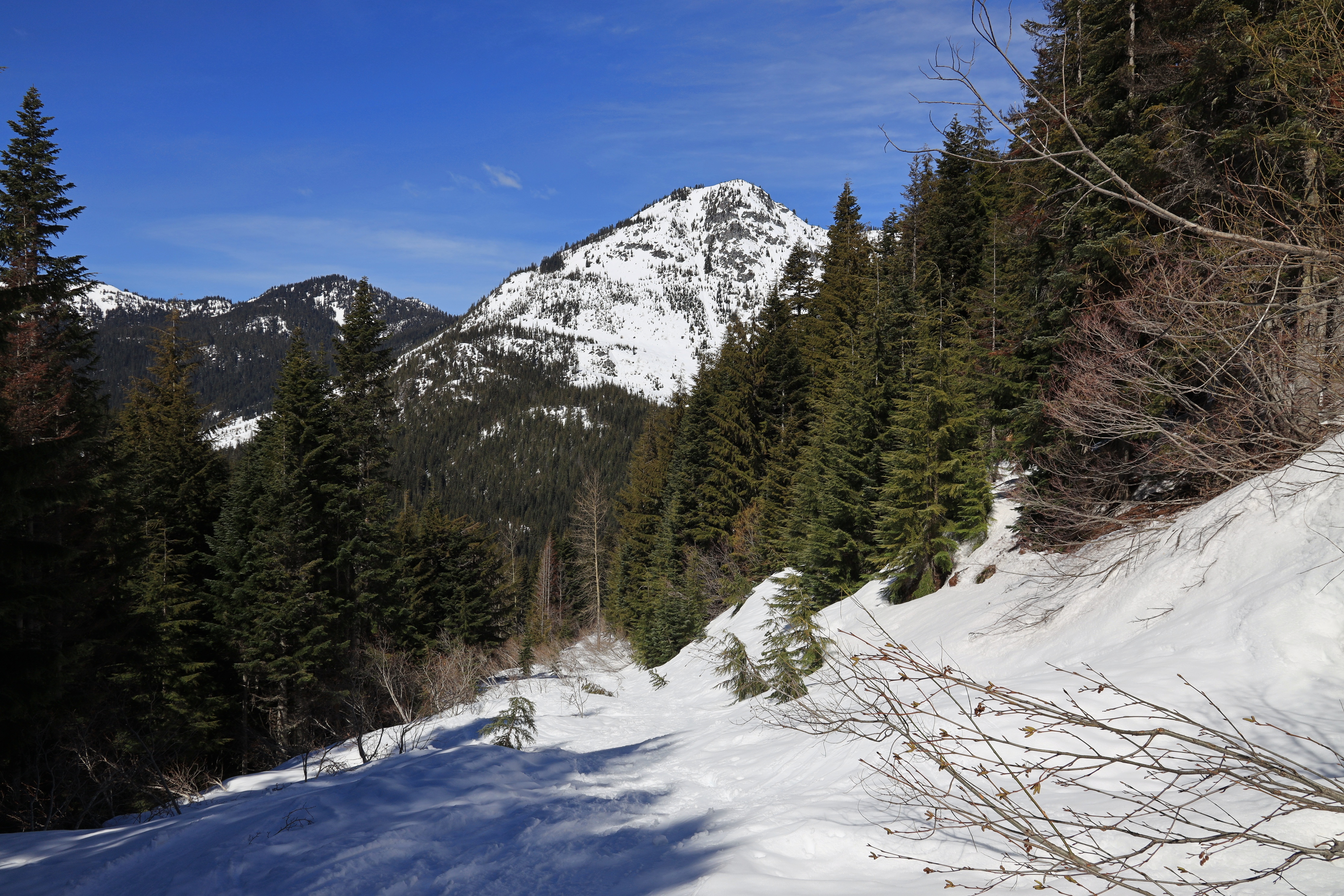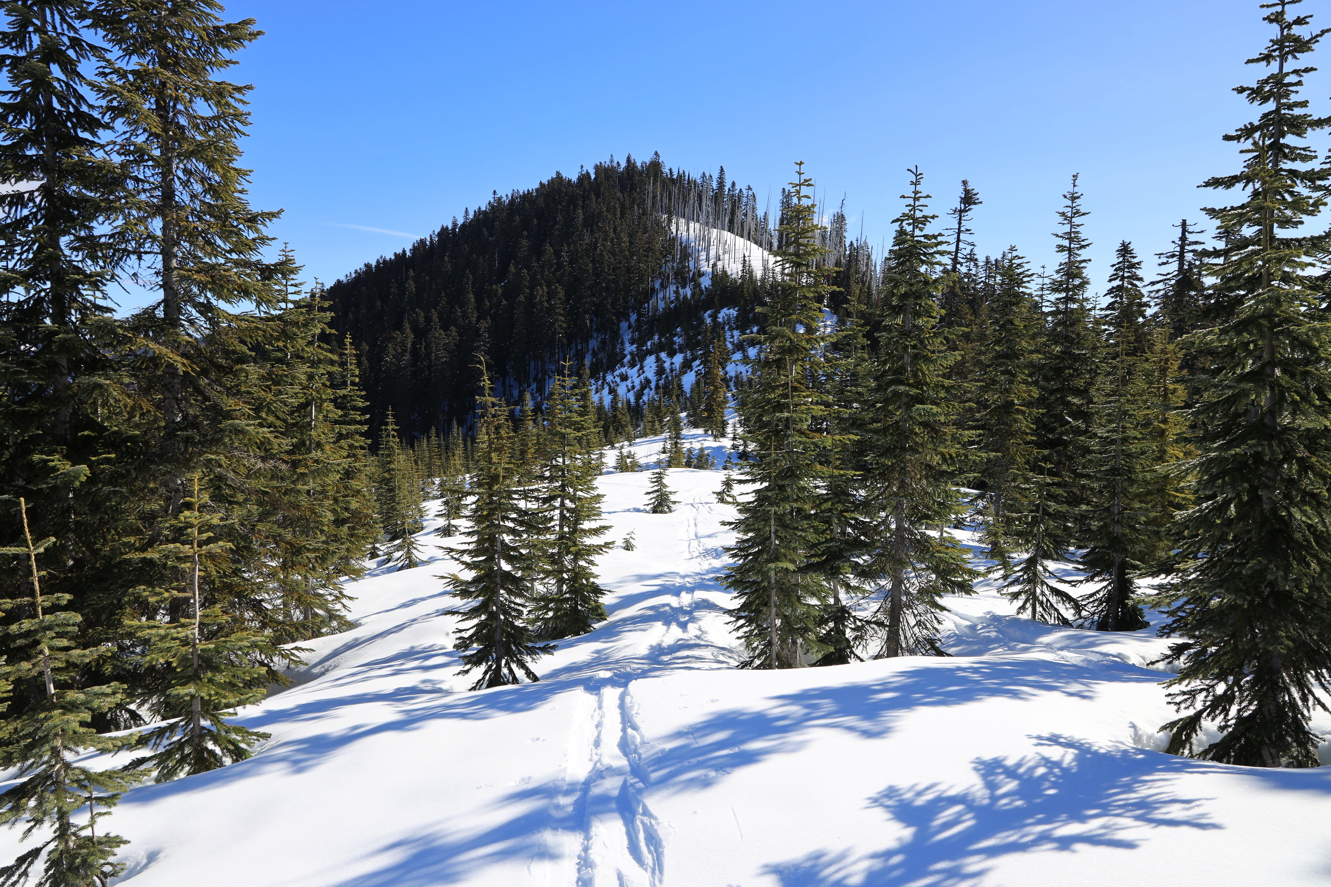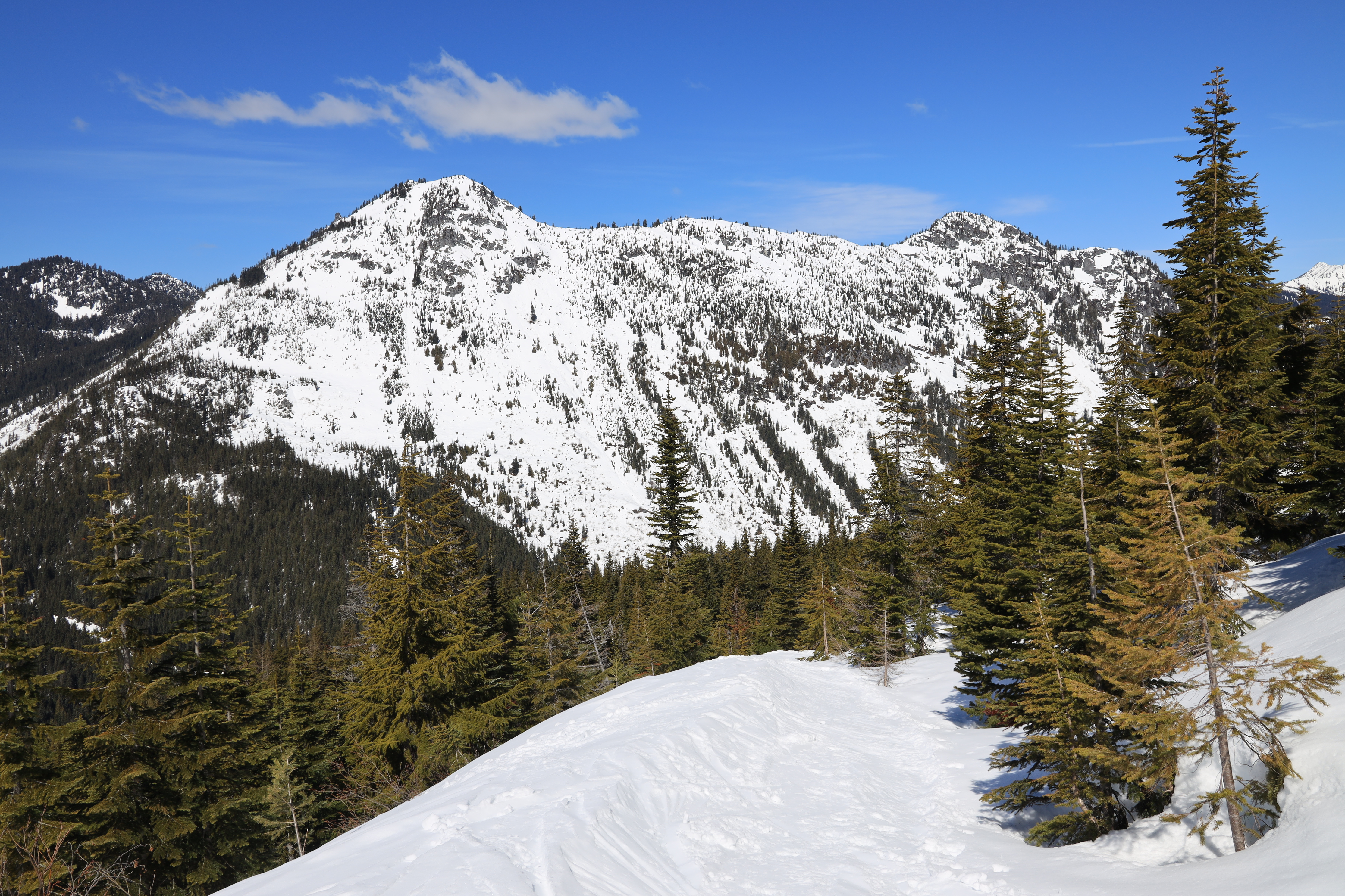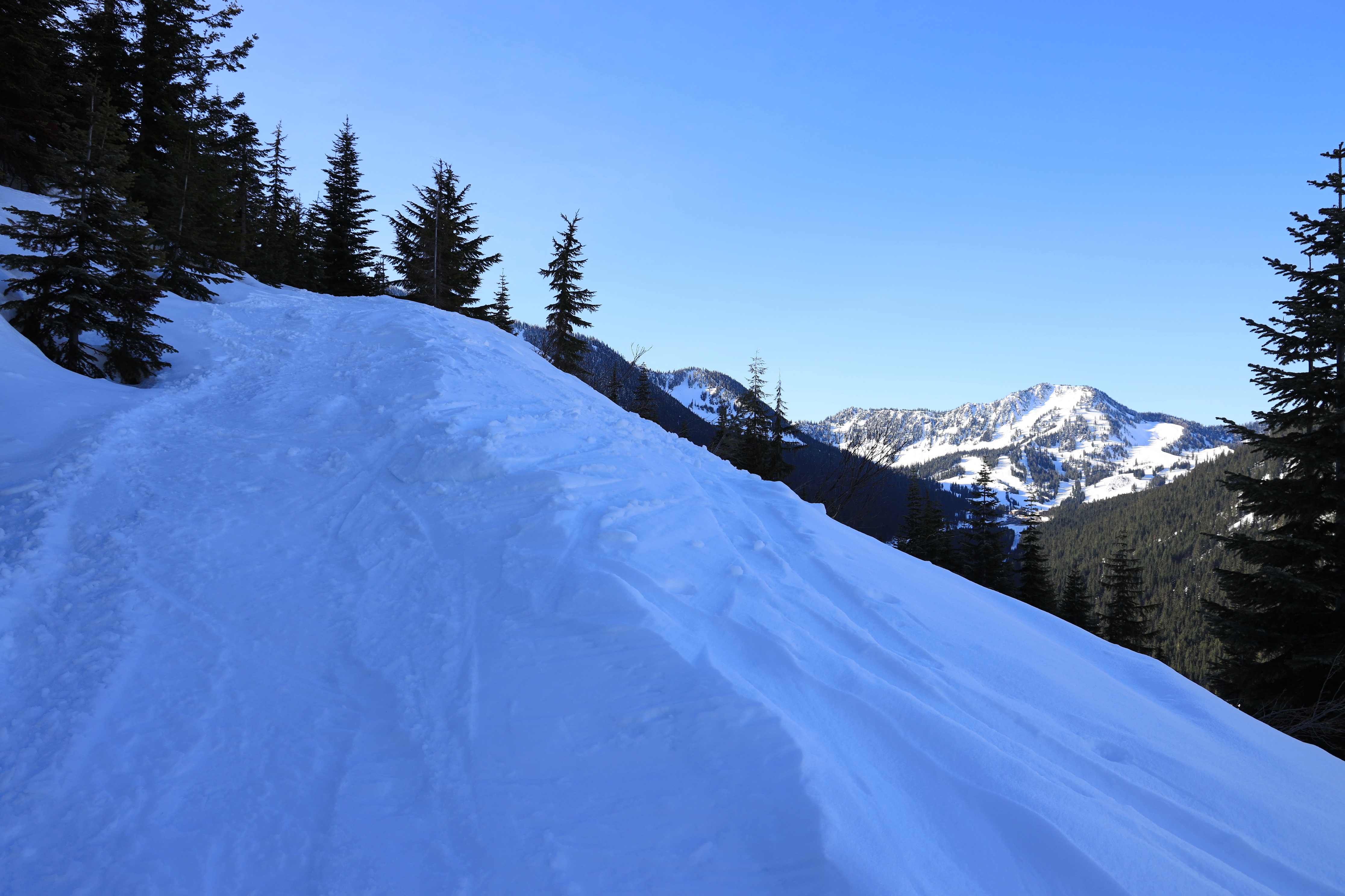 산을 오르는 경사는 눈길산행이나 산악스키를 타기 좋은 정도이고, 눈사태 위험도 비교적 낮은 곳 같습니다.