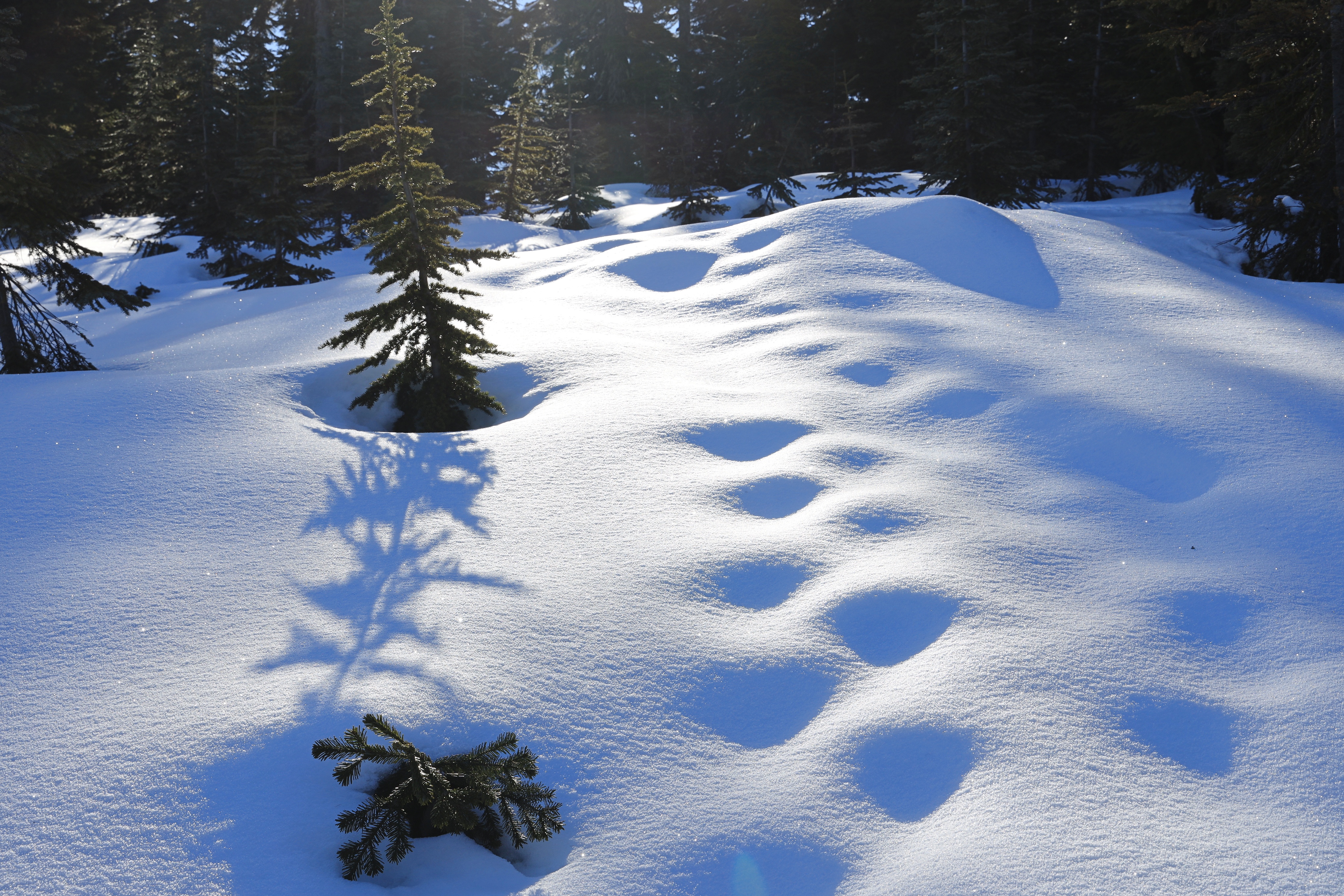 능선 숲길을 따라 산 정상으로 가는데 발자국이 하나도 없었습니다. 위 사진 발자국은 제가 설피를 신고 만든 것입니다. 전에 오른 흔적은 새로 온 눈에 덮여 희미했습니다.