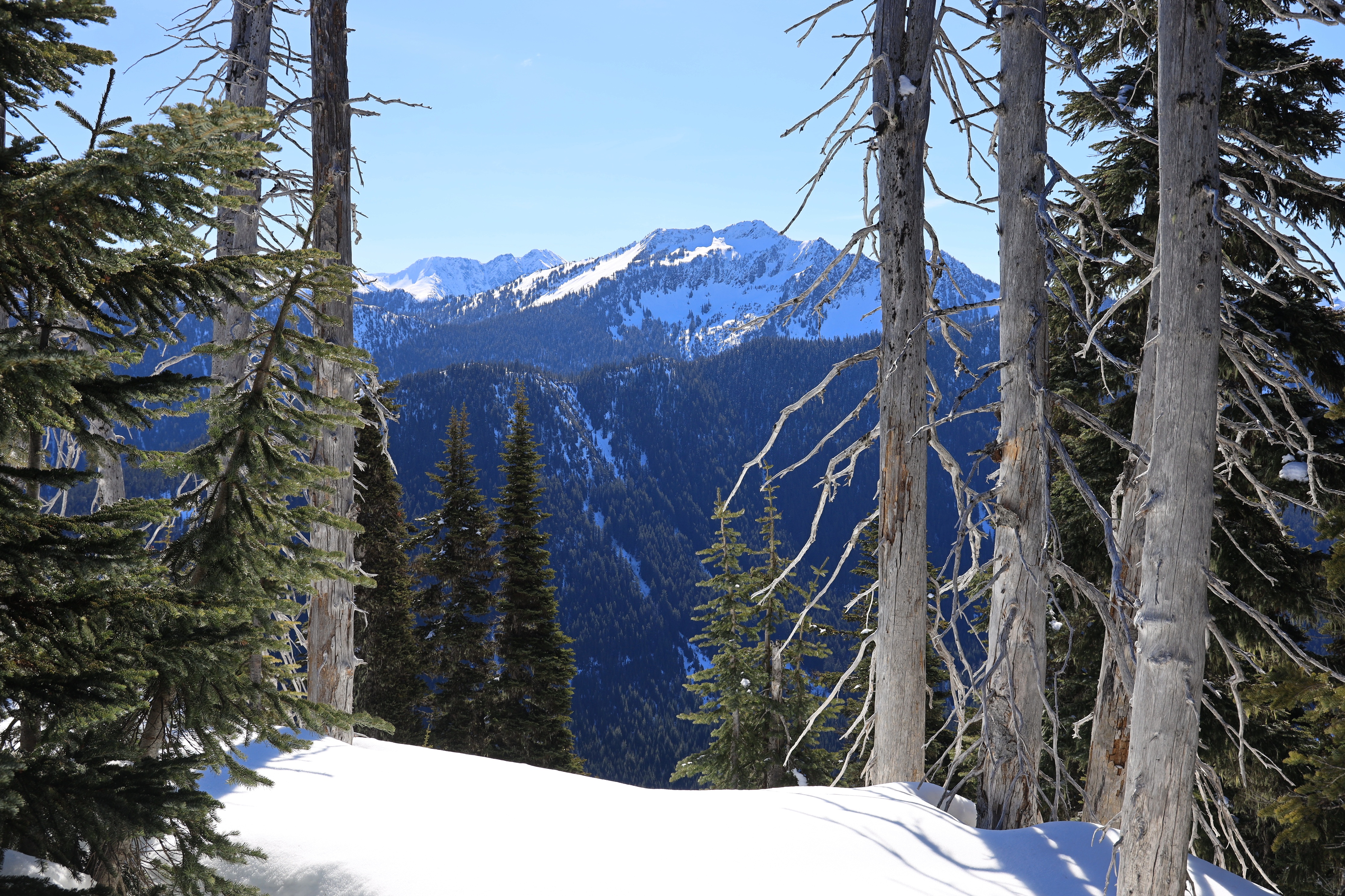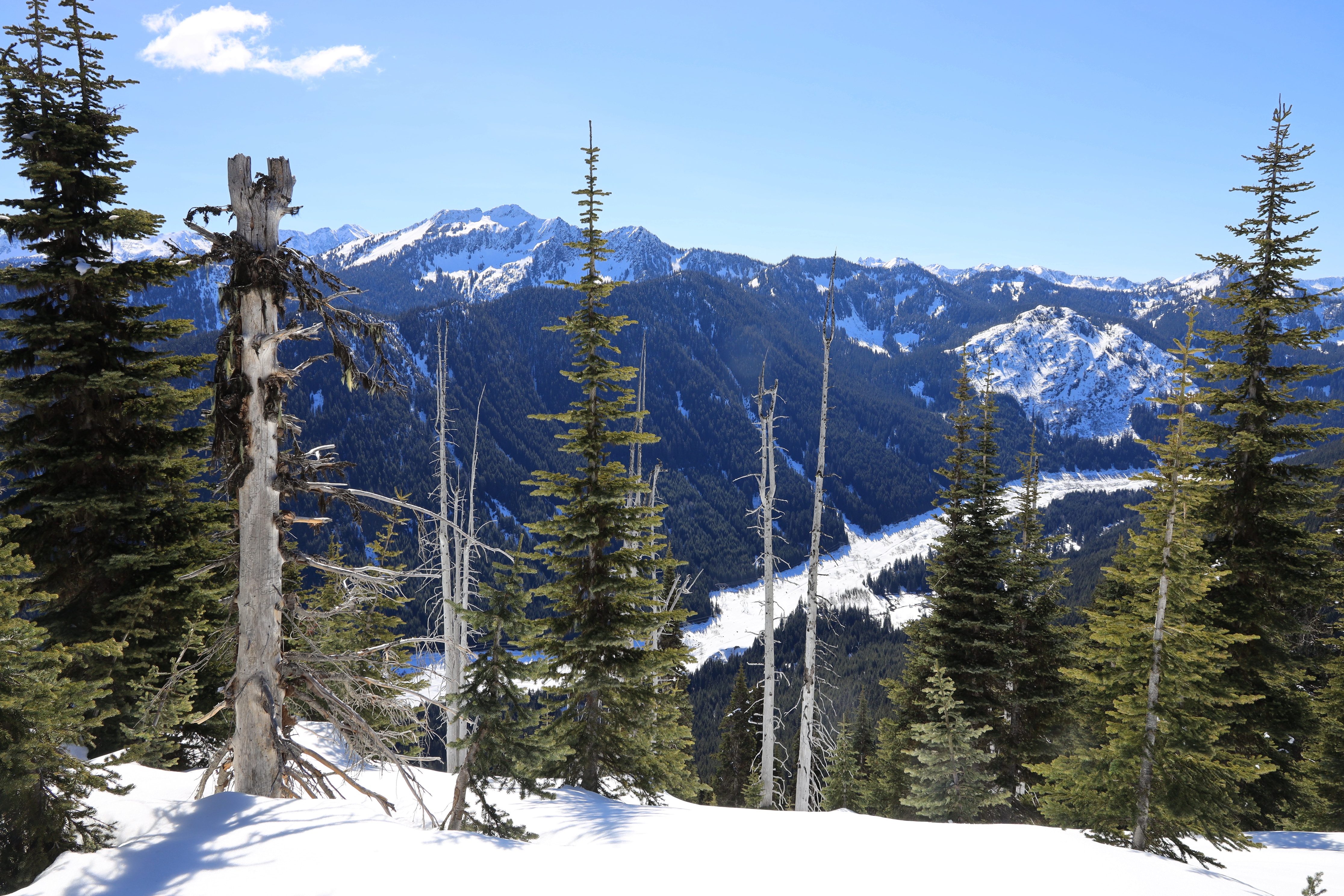 산행은 스티븐스 패스 Yodelin Lot (스키장에서 2번 도로 동쪽 1.6마일)에서 시작합니다. 현재 (3월 말) 산에는 3 - 5피트 눈이 쌓여있고, 눈이 얼었고 미끄러워서 설피 (Snowshoe)를 사용하였습니다.