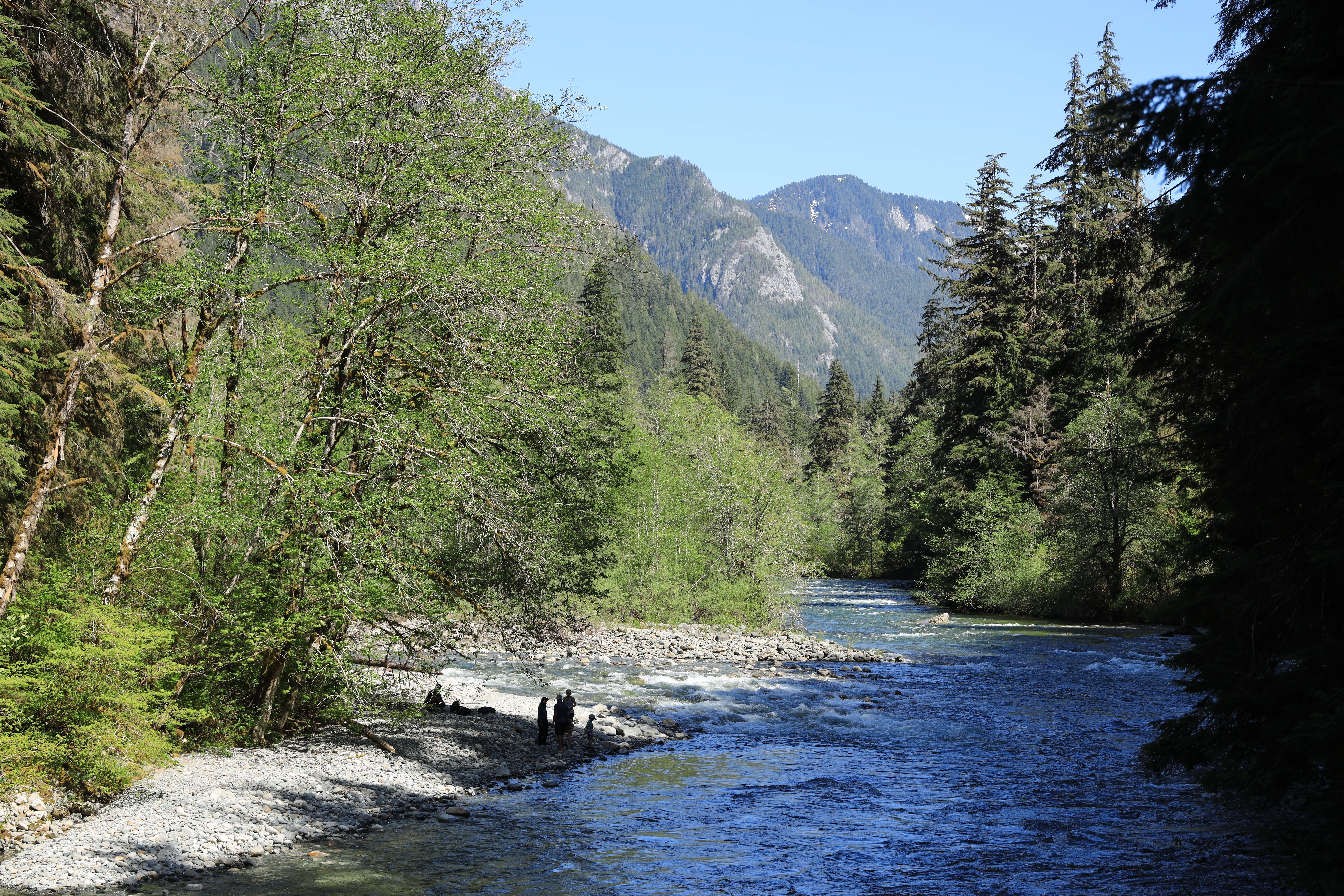 하산길에 보니 강 (Middle Fork Snoqualmie River) 가에서 물놀이를 하고 있습니다. 산에 눈이 녹아내려 물이 많이 불어났습니다.