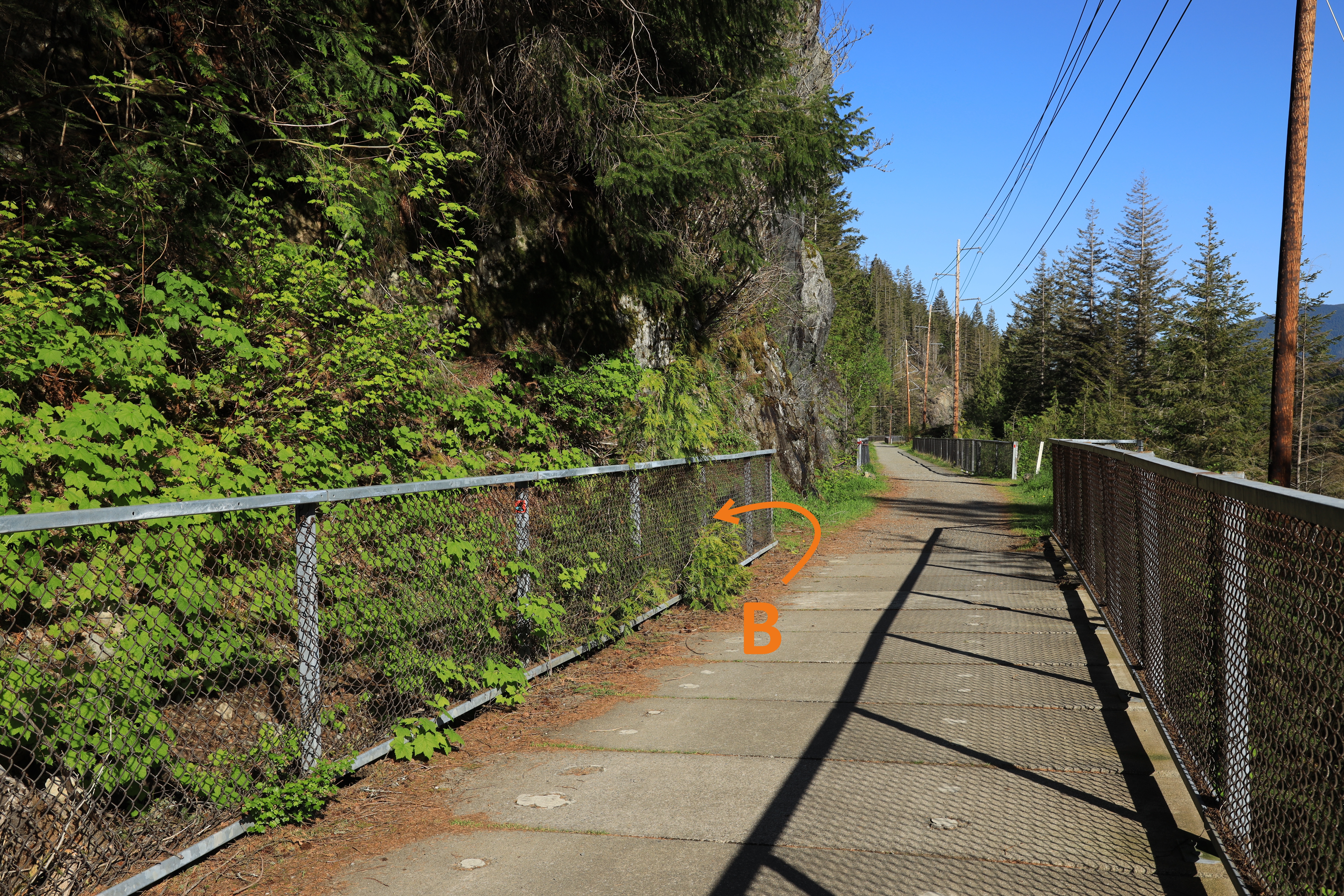 Hull Creek 철교 (약 50 미터)를 건너고, 두 번째 짧은 다리 (약 15 미터)를 지나면 다리 끝에 왼쪽 철망너머로 산을 오르는 샛길 (위 지도 B 지점)이 있습니다.