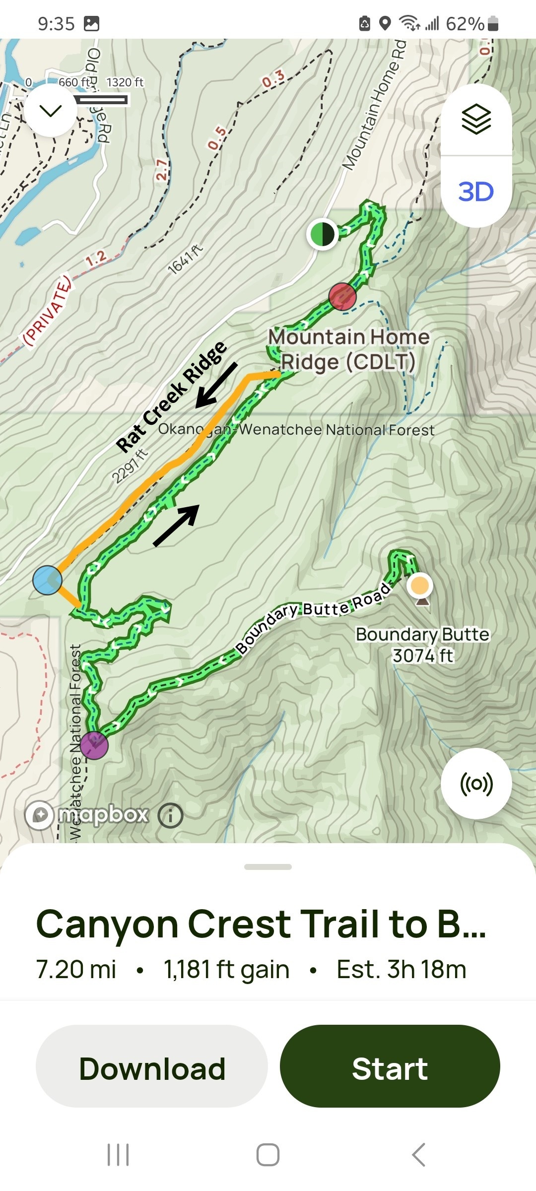 이 등산로는 워싱턴 등산협회 (wta.org) 자료에는 없고, All Trails (alltrails.com)에 있습니다. 등산로입구는 구글지도에 "Canyon Crest Trail to Rat Creek Ridge Trail"이라고 돼 있고, 산악도로 (Mountain Home Rd, 189번 도로)는 좁고, 일부 구간이 가파릅니다. 저는 Rat Creek Ridge (위 지도 황토색 구간)로 올라 Boundary Butte까지 갔다가, 하산은 계곡 쪽으로 하였습니다.