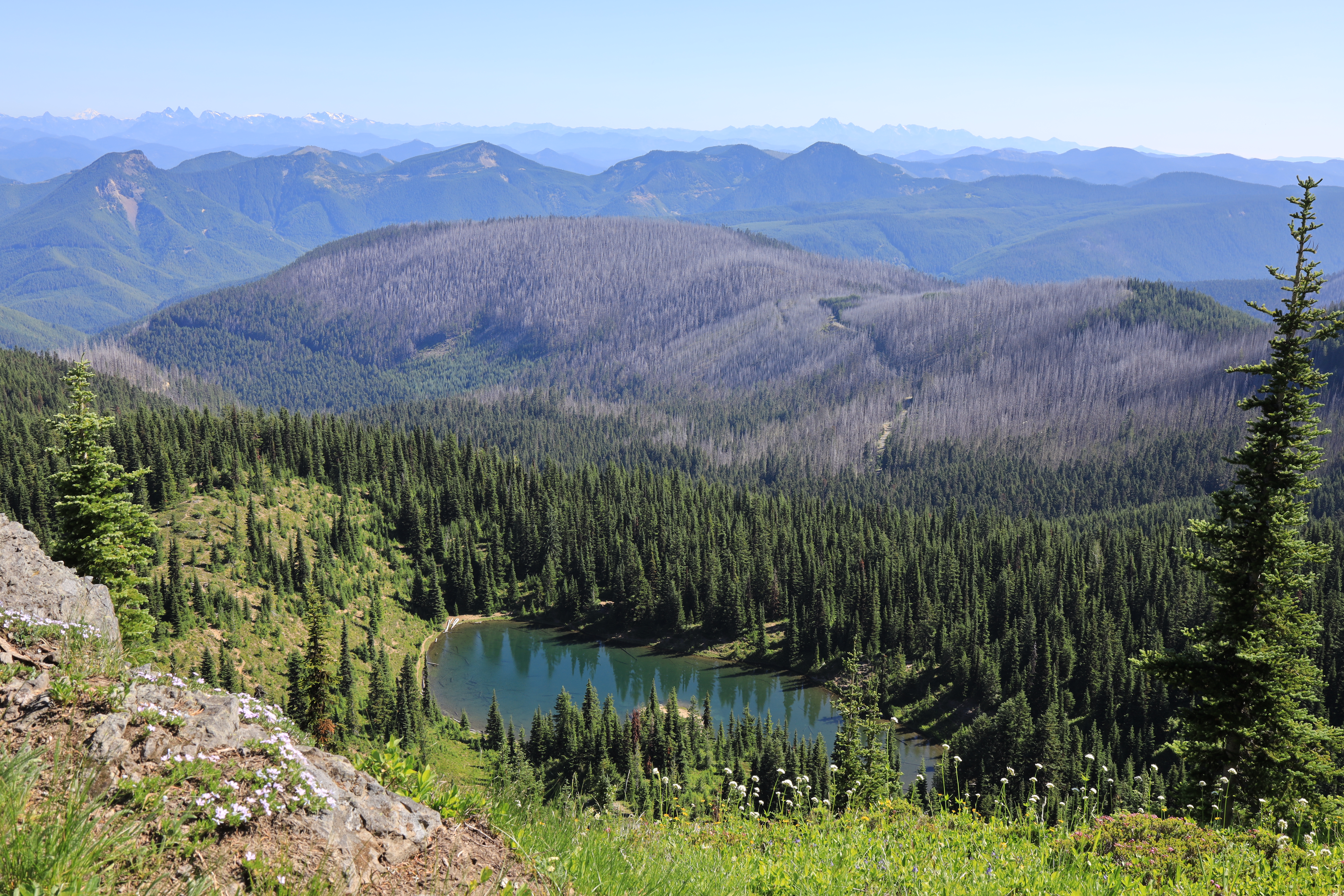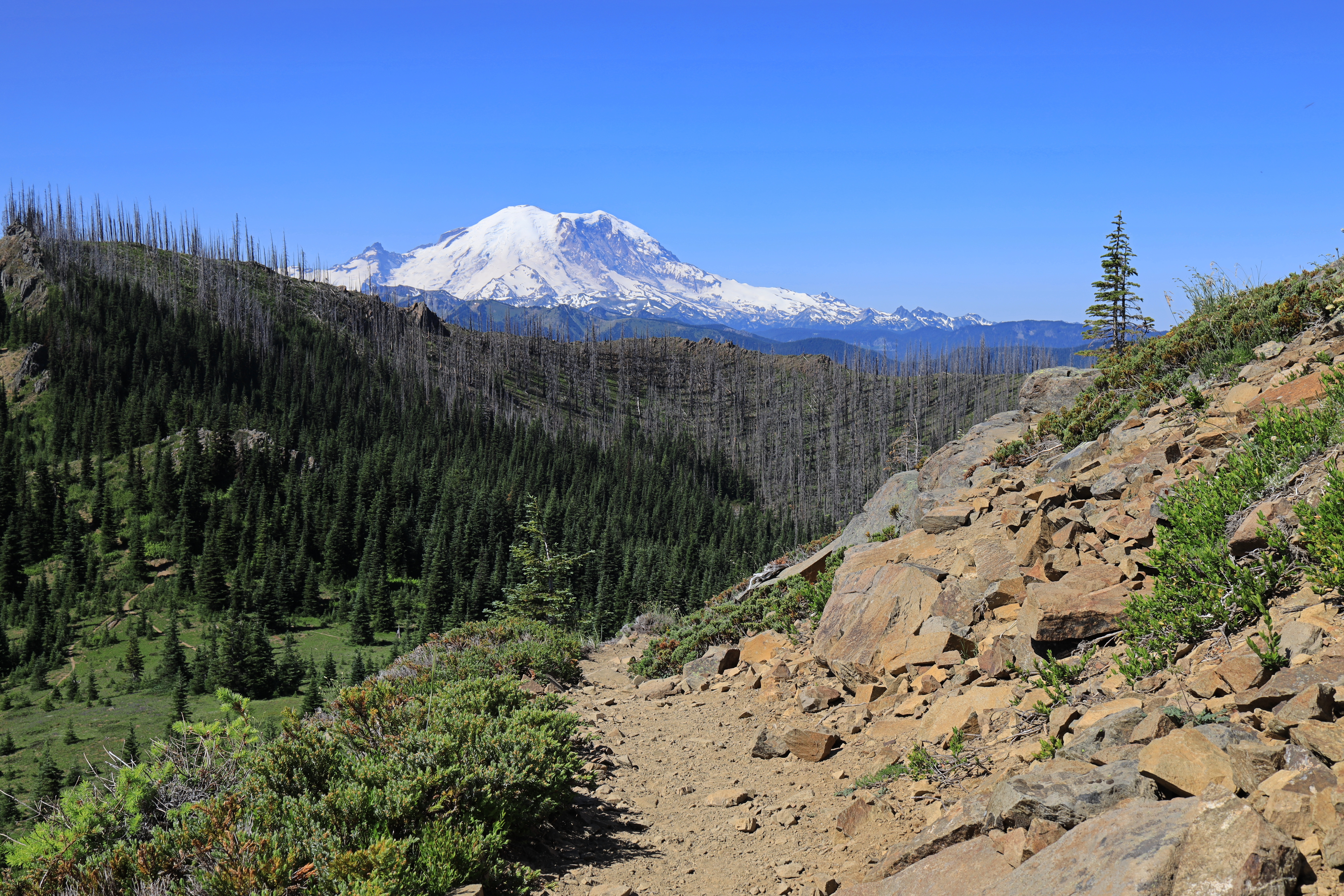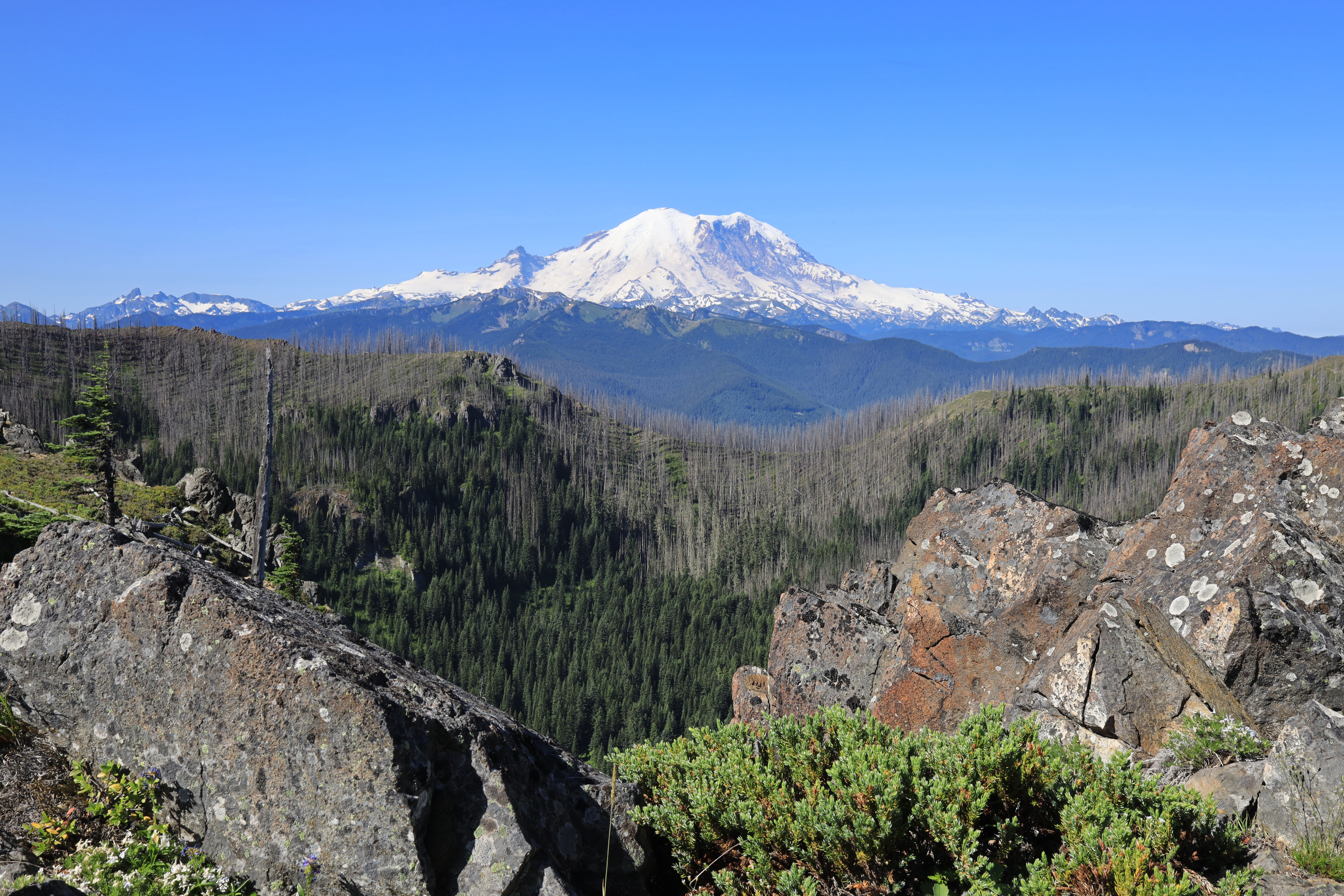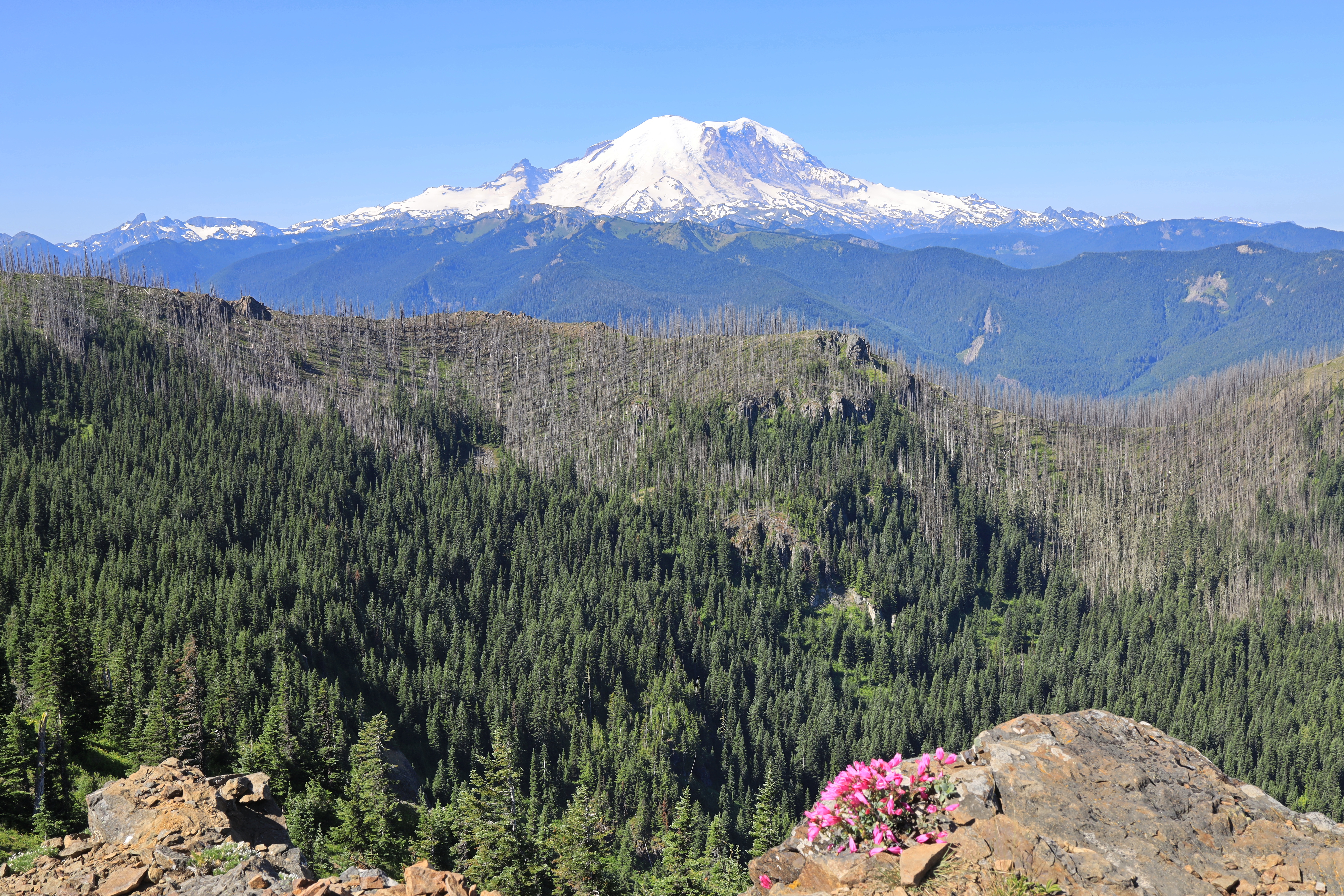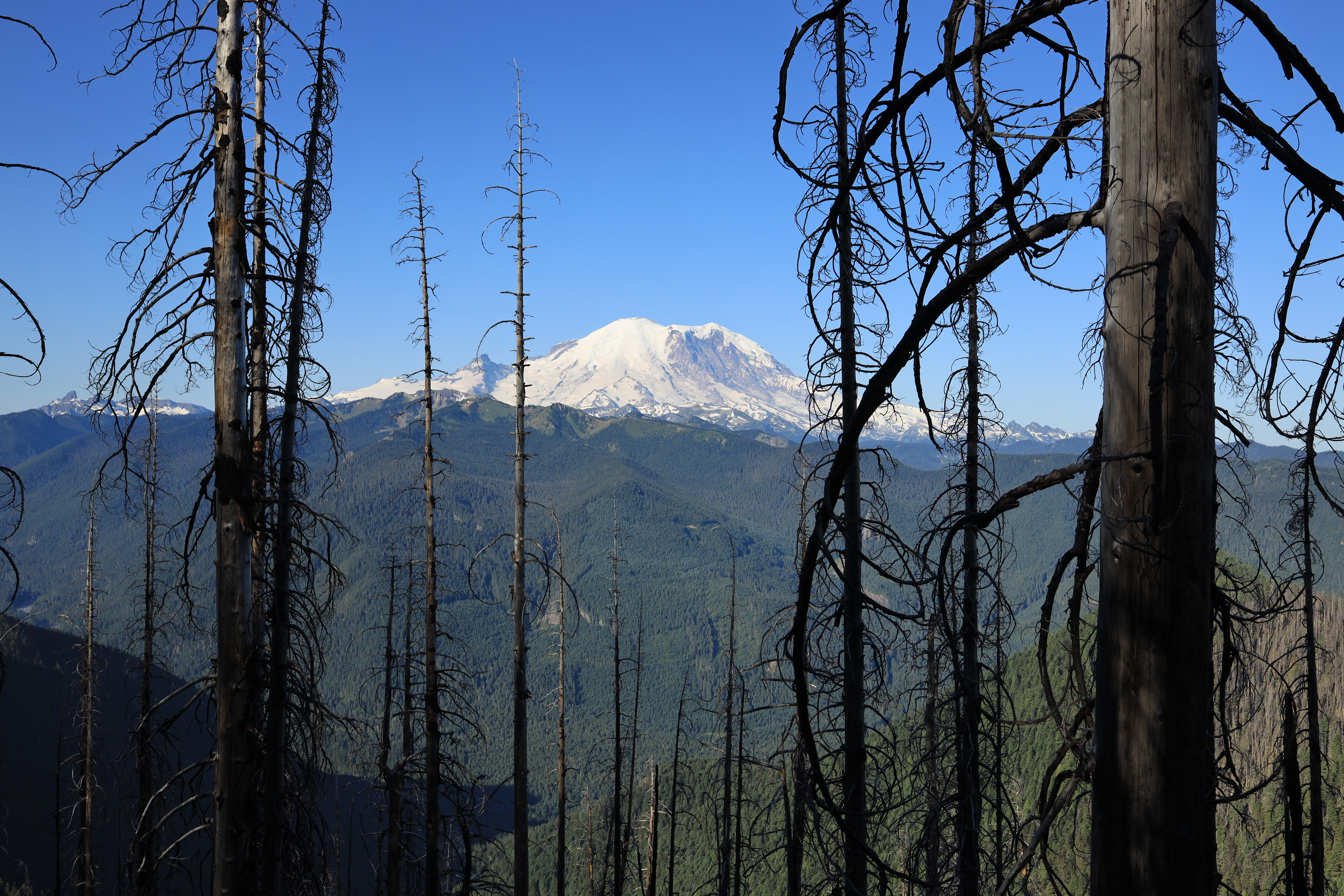 숲이 있었으면 눈산 (Mount Rainier)이 잘 보이지 않았을 텐데, 산불 때문에 시야가 열렸습니다.
