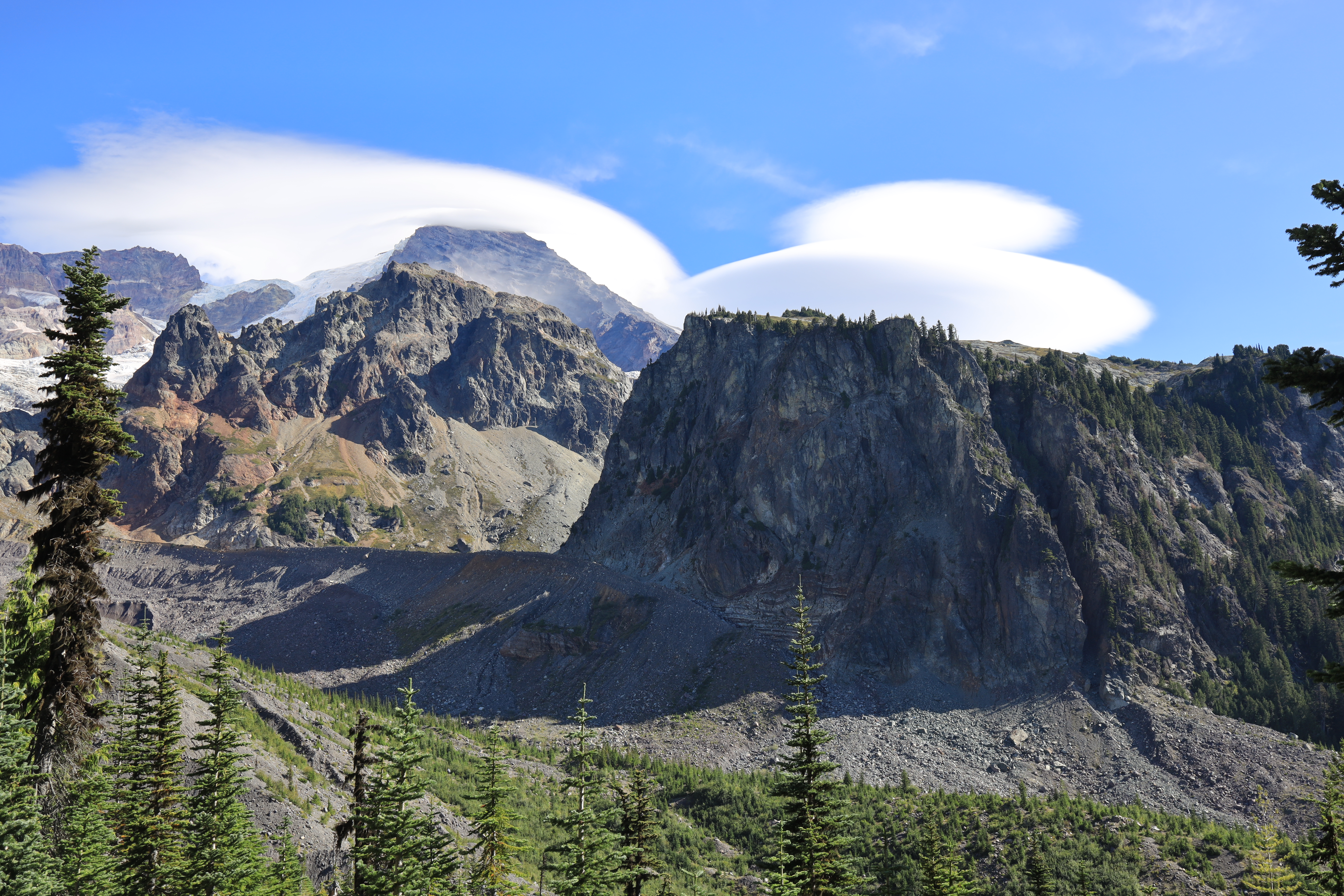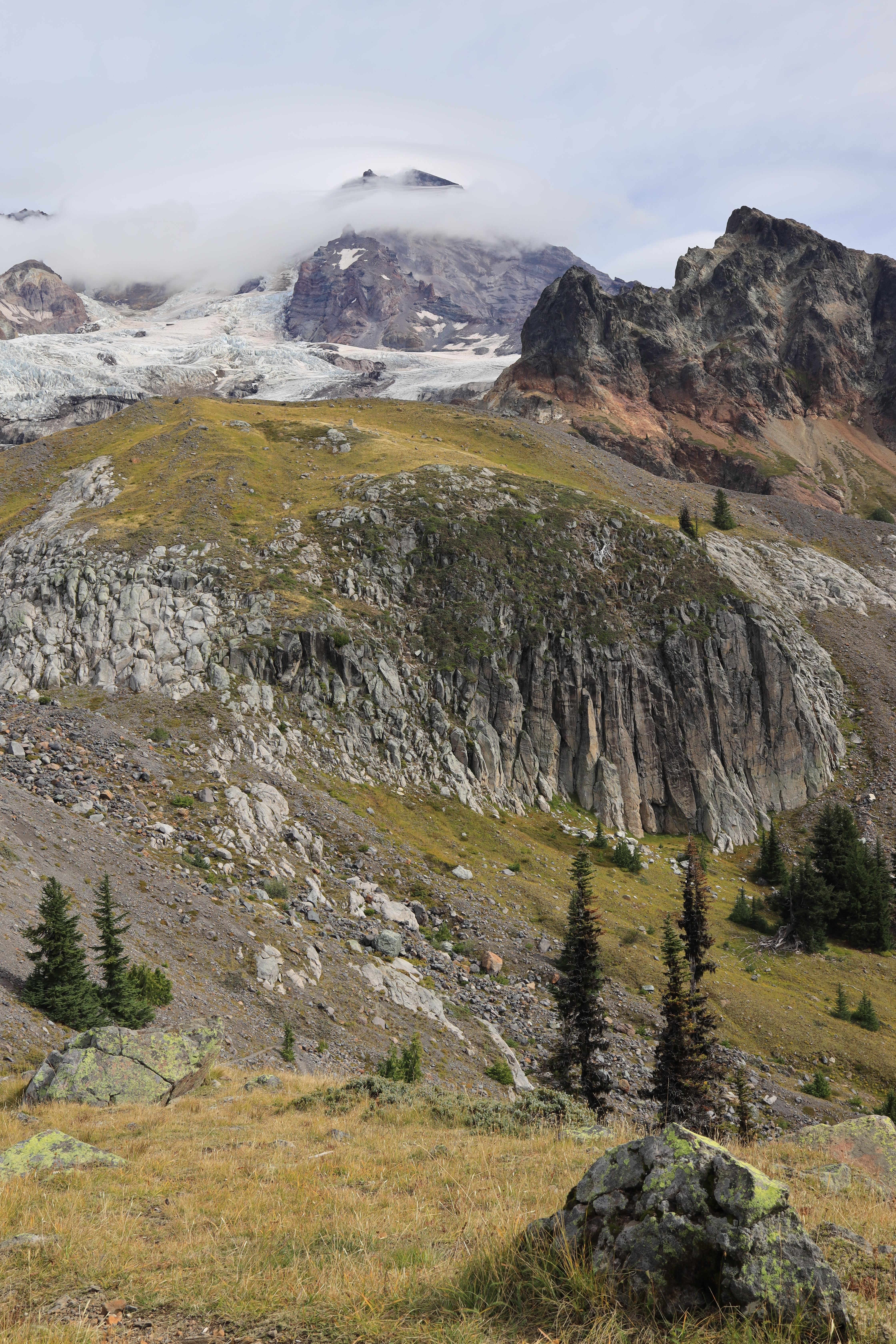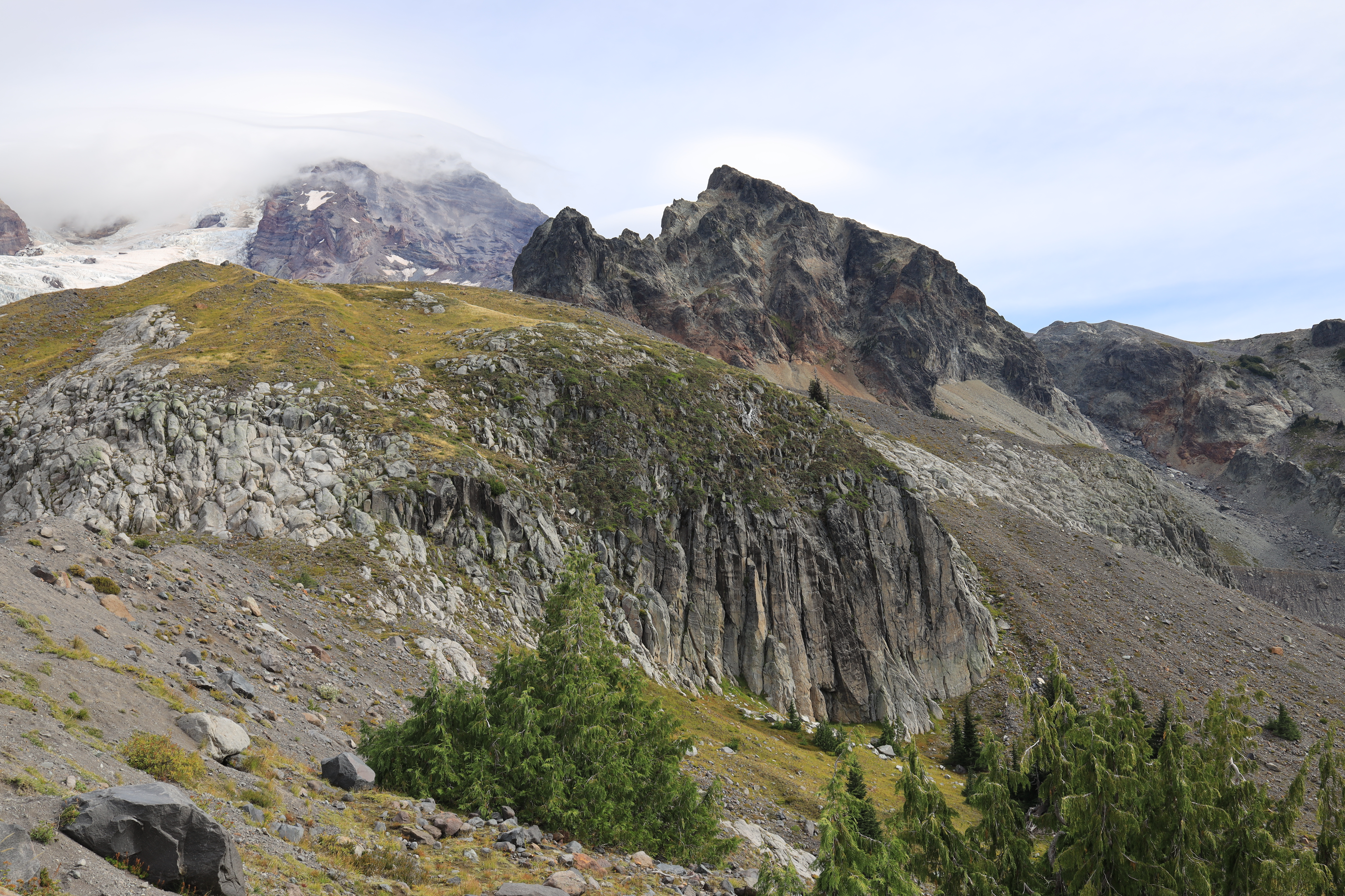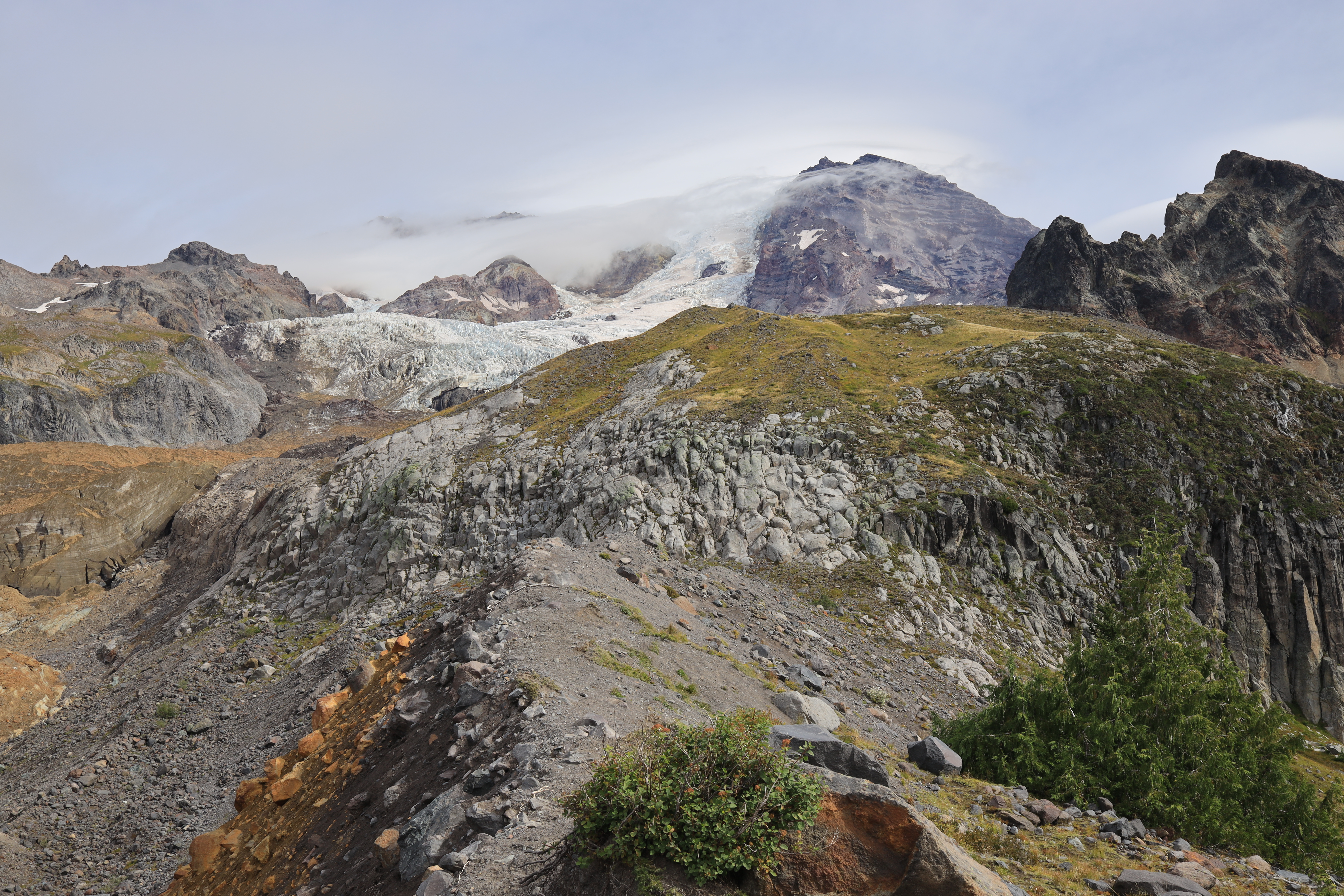 Emerald Ridge를 오르며 보는 눈산 (Mount Rainier)입니다. 남서쪽 방향에서 가까이 보는 눈산은 평소에 보던 전망과 전혀 달라 보입니다.