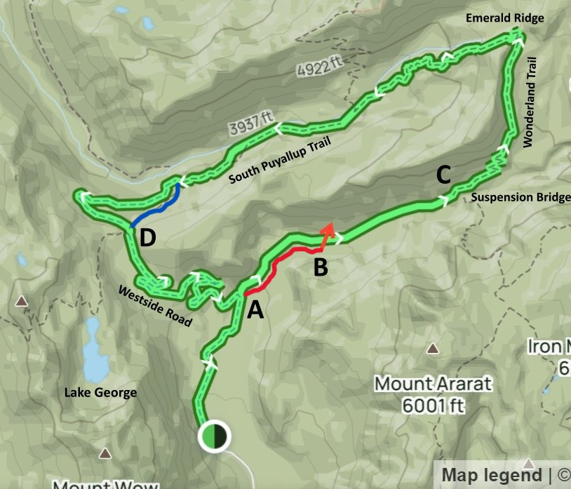 위 지도의 C 지점입니다. 야영배낭을 메고 Wonderland Trail (눈산 둘레길)을 산행하는 분들이 있었습니다.