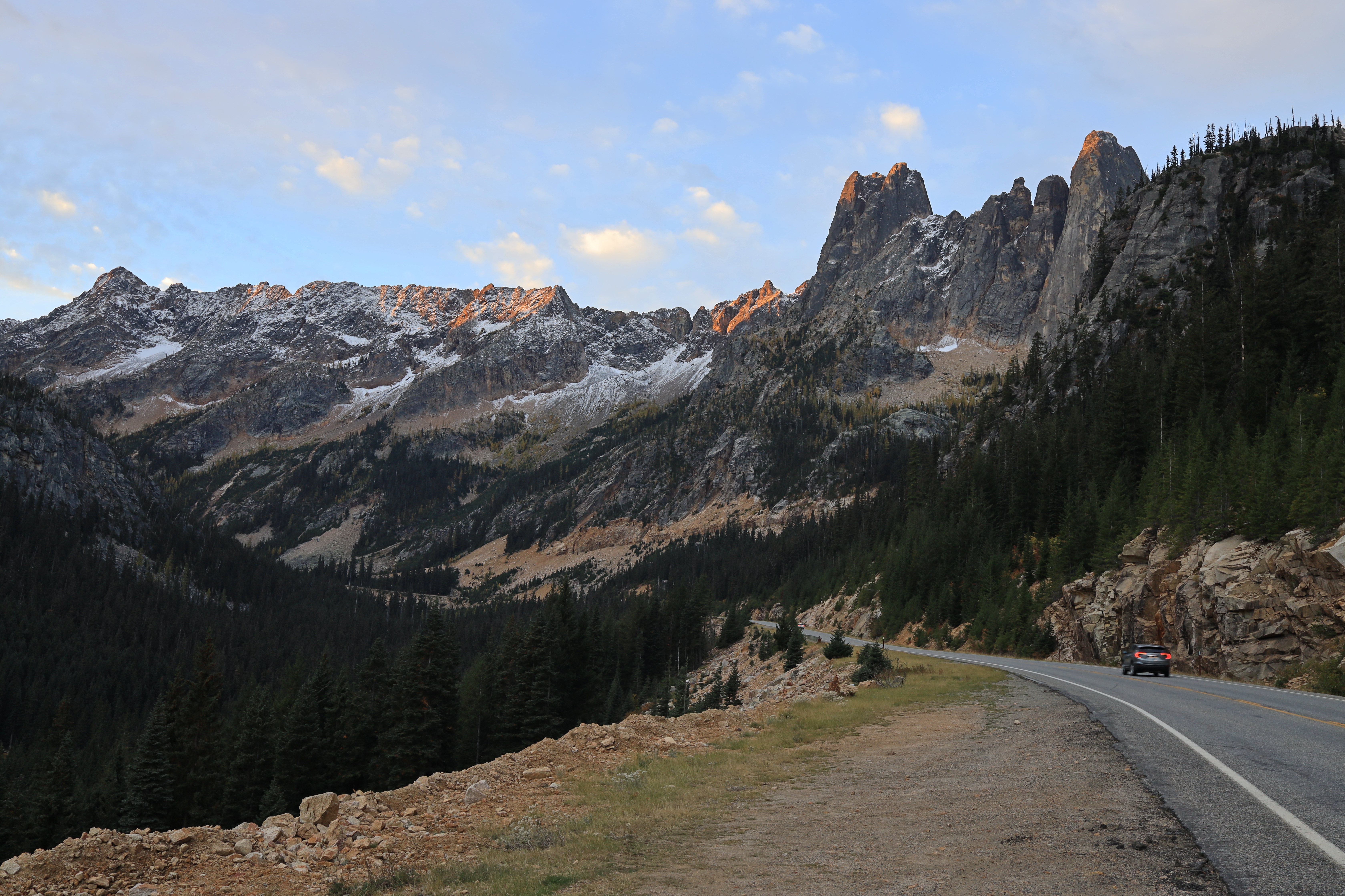 간밤에 잠을 설치고, 새벽 3시에 산행을 출발하였습니다. 운전을 하는데 머리가 띵해서 결국 휴게소 (Diablo Lake)에서 한숨 잤습니다. 워싱턴 고개 (Washington Pass)를 넘는데 이제 해가 뜨기 시작합니다.