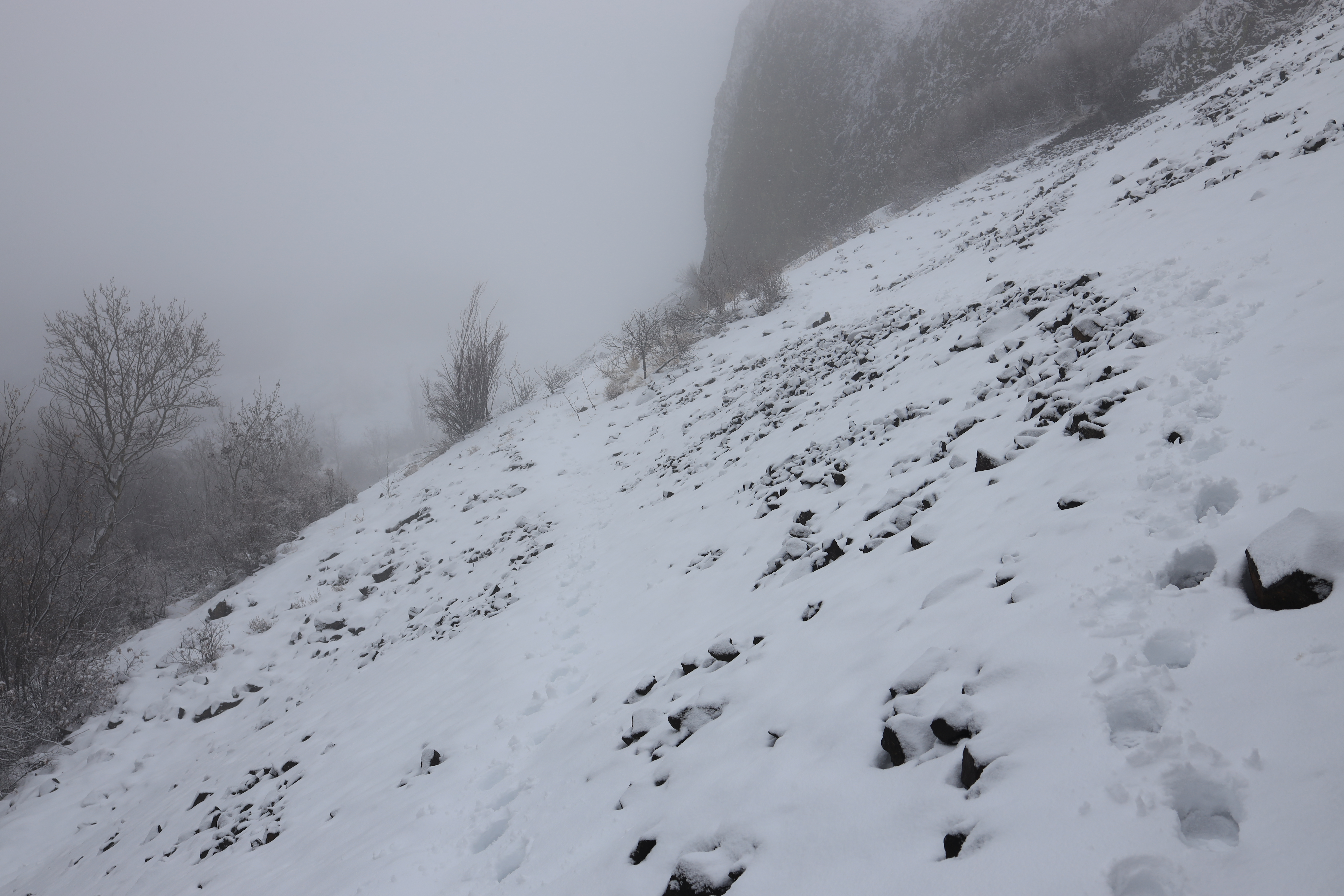 사진 오른쪽으로 산을 올랐는데 원래 등산로가 아닌 것 같습니다. 하산은 사진 가운데로 하였지만 경사면에 눈이 쌓여 발이 더 빠지네요. 그래도, 경사가 가파른 편인데 미끄럽지는 않았습니다.