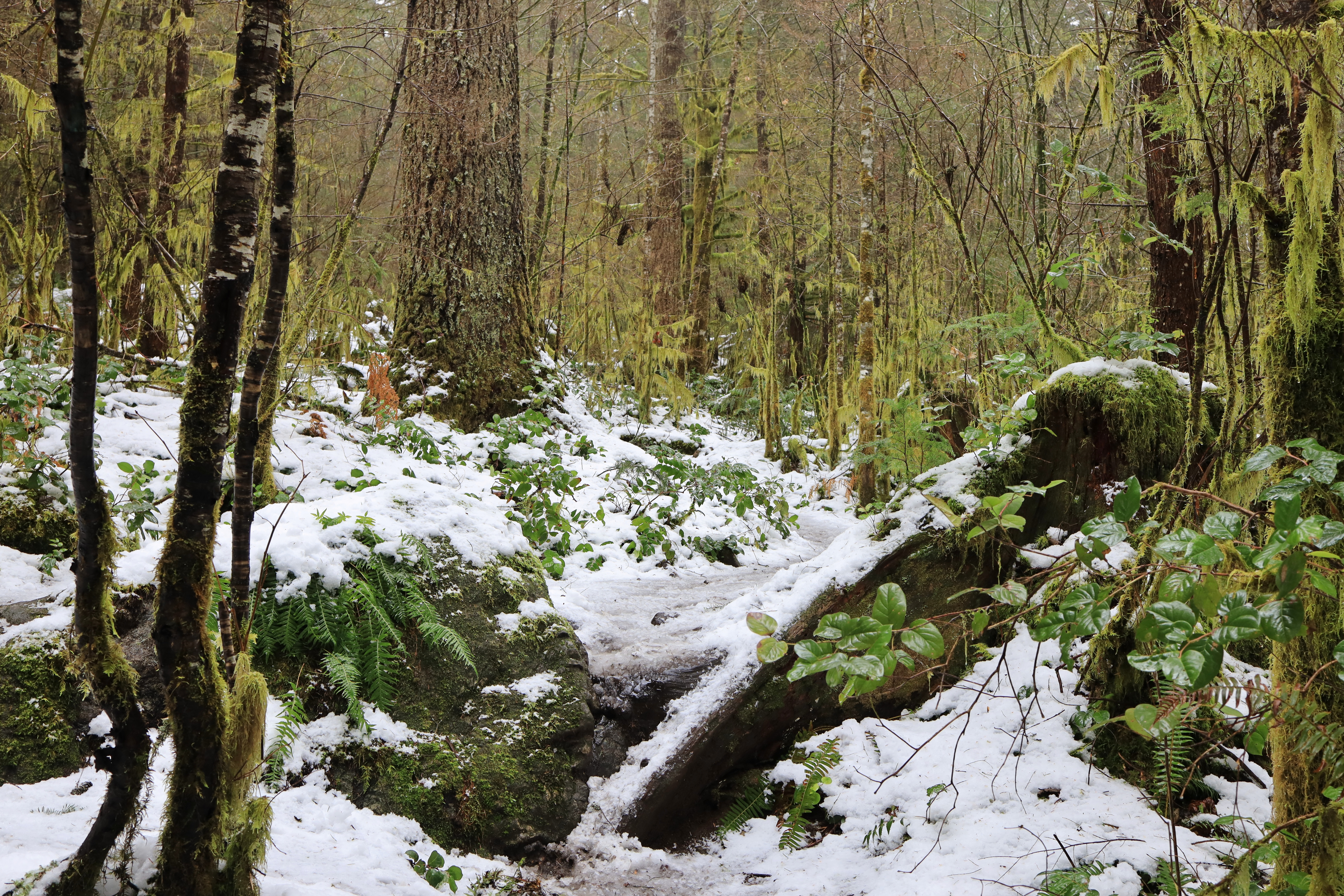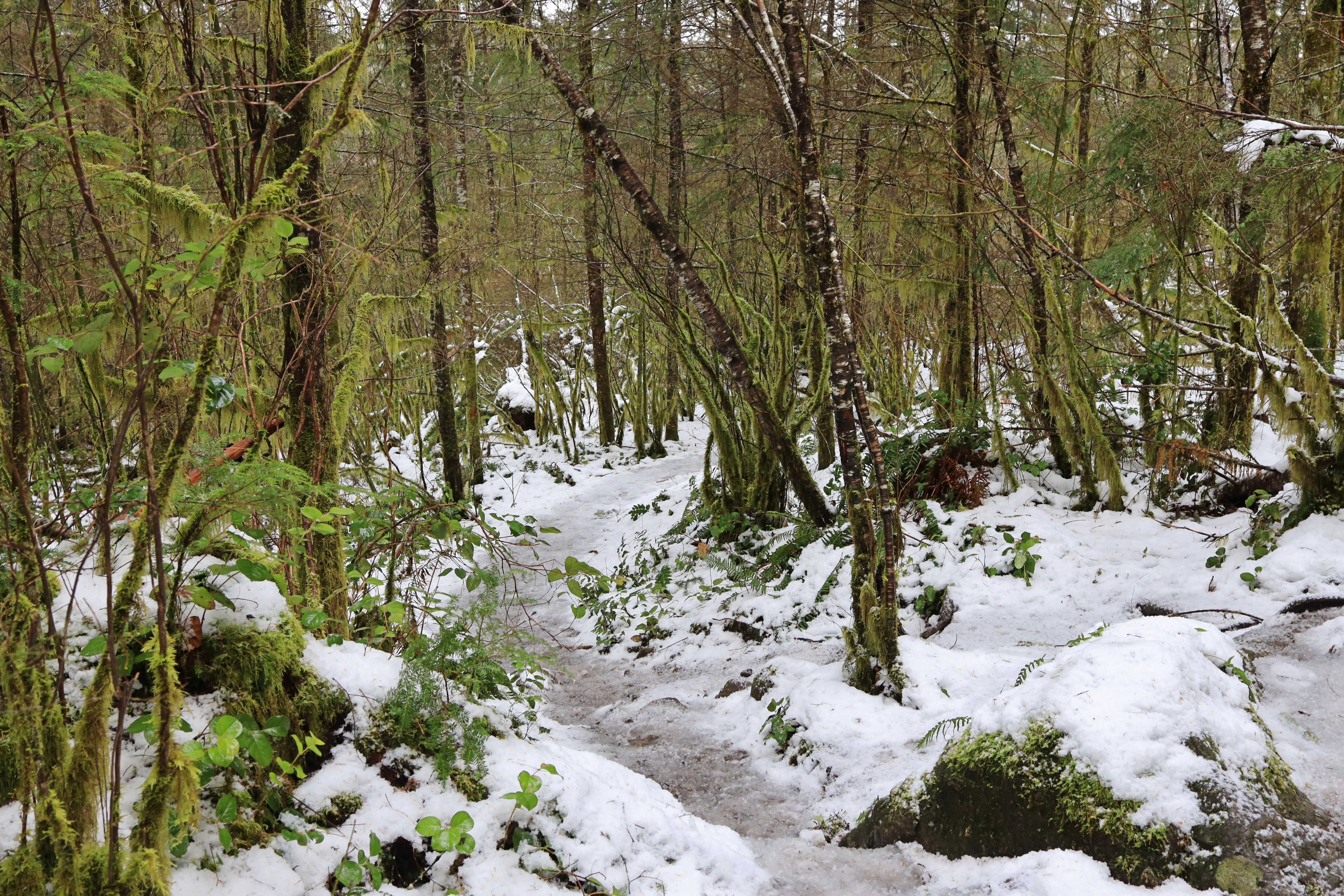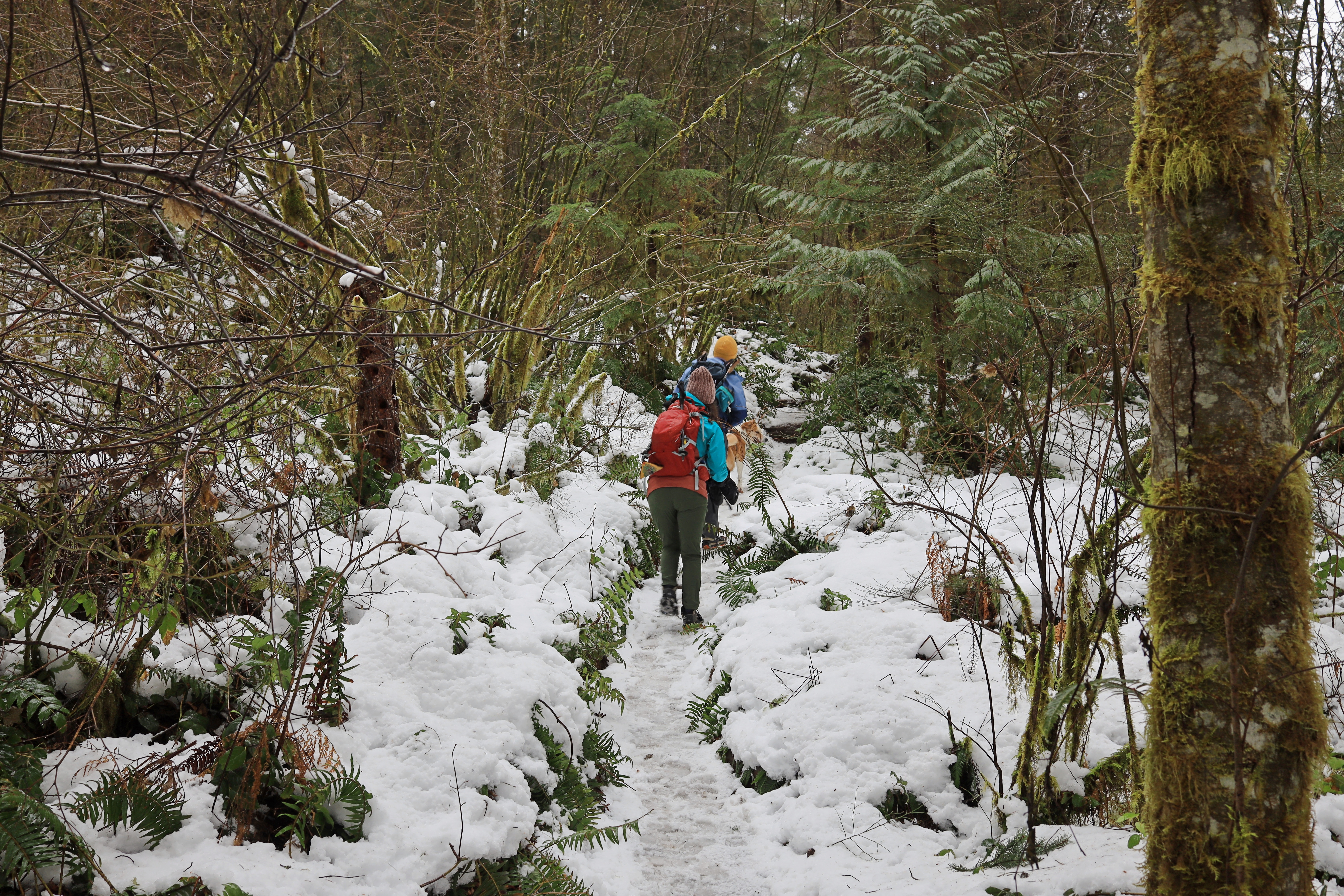 산 위에는 눈이 2 - 4인치 쌓여 있습니다. 발자국은 보이지 않았지만 등산로 흔적이 남아있어 산을 오르는데 어려움이 없었습니다. 하산길에 어차피 필요할 것 같아서 산을 오르며 아이젠 (Micro Spikes)을 사용하였습니다.
