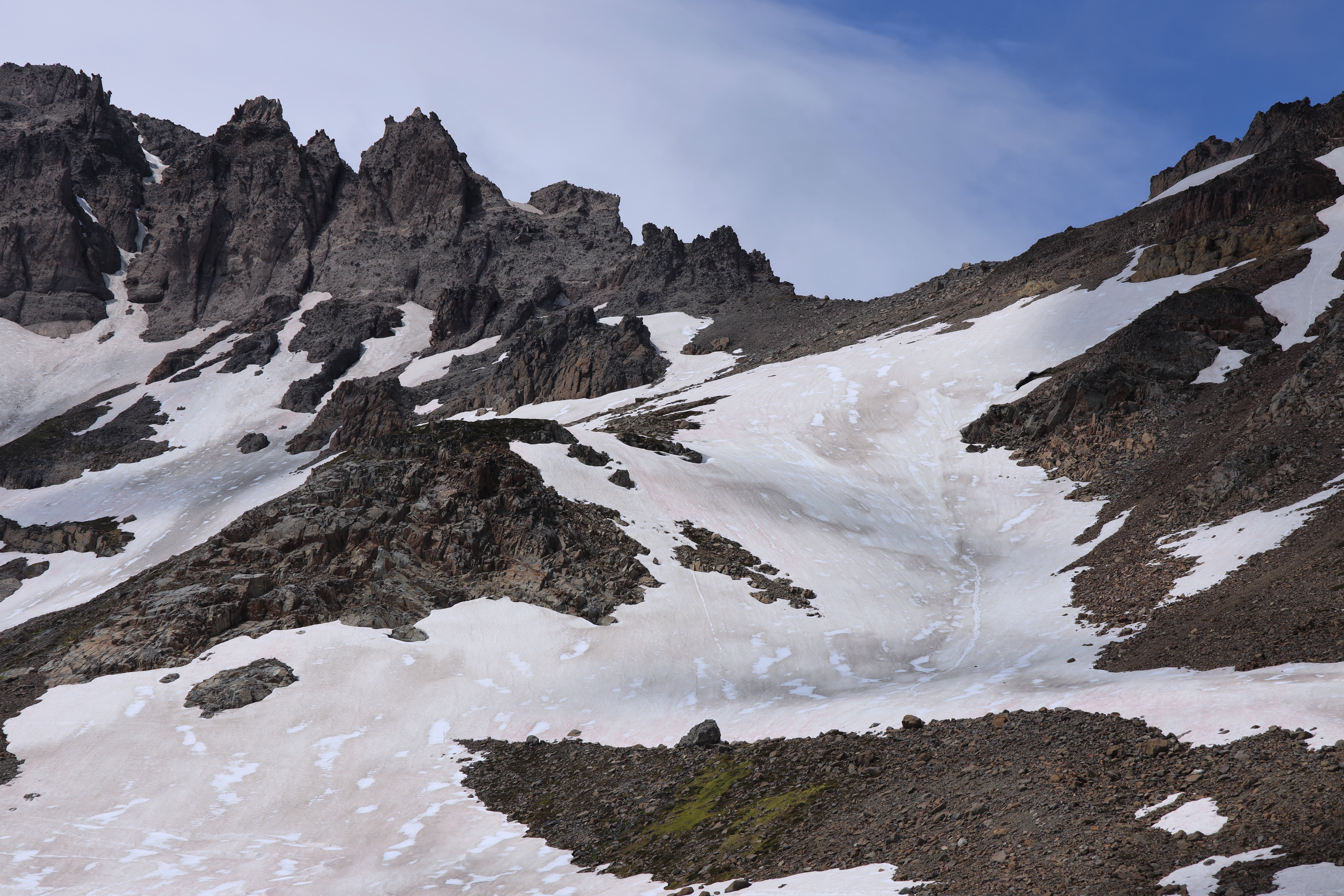 눈산 (Mount Rainier)을 빙하사이로 오르는 길 (Inter Glacier Route)이 시작됩니다. 위 사진 화살표 위치에 눈산 등반객이 보이고, 이 루트가 빙하 사잇길입니다. 산을 오르며 오른쪽 Burroughts Mountain 너머로 Winthrop 빙하가 있고, 왼쪽 Mount Ruth 뒤에 Emmons 빙하가 있습니다.
